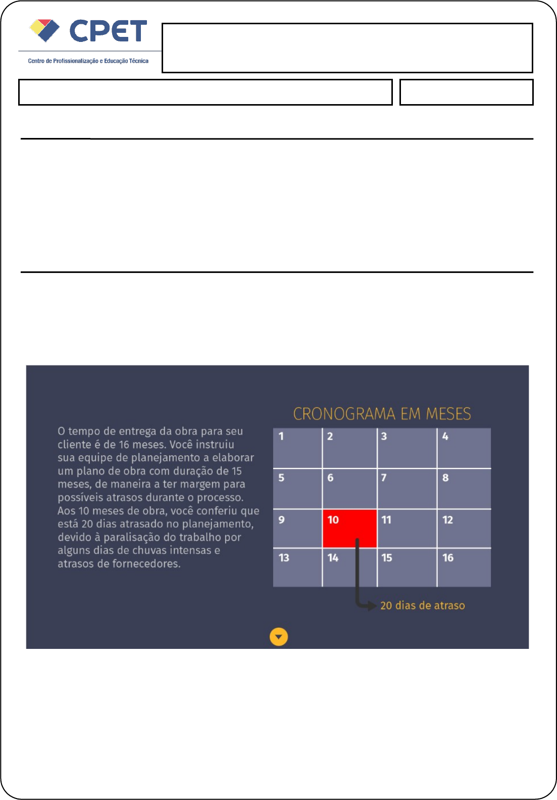 Gestão de Obras - SG Aluno (a): Data: INSTRUÇÕES: · Este Laboratório contém questões, totalizando 10 (dez) pontos. · Você deve preencher dos dados no Cabeçalho para sua identificação · Nome / Data de entrega · As perguntas e respostas devem ser retiradas do Roteiro e digitadas logo abaixo. · Ao terminar, grave o arquivo em PDF com o nome do Laboratório Escolhido. · Envio o arquivo pelo sistema. Na construção de uma obra, o gestor deve estar preparado para qualquer imprevisto. É normal encontrar os mais diversos problemas. Simples mudanças do escopo da obra, de prazos ou de custos podem causar complicações. Tudo isso desafia o gestor a recolocar sua obra dentro do planejamento desejado, ou a tomar atitudes que adequem o trabalho às suas novas necessidades. Imagine a seguinte situação: O que você fará frente a essa situação? Explique. image4.png image5.png image1.png image2.png image3.png