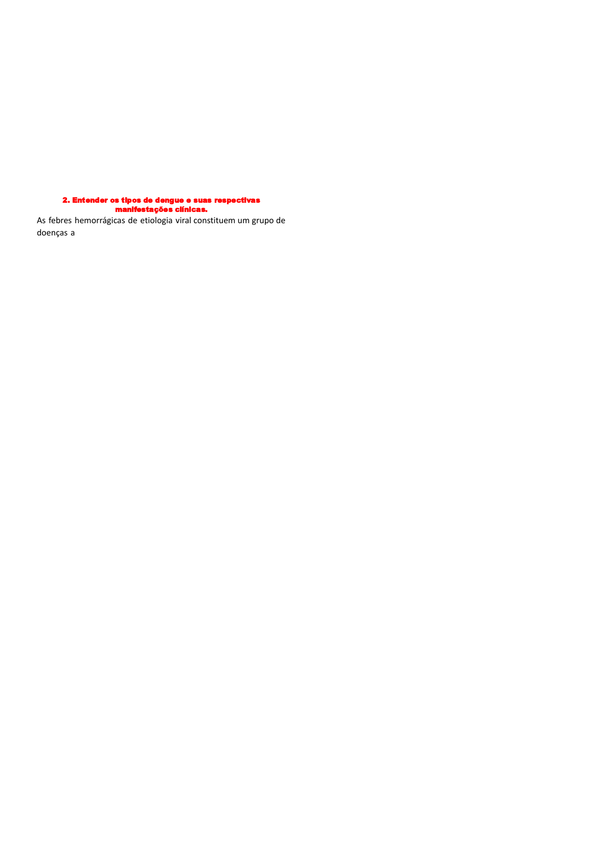 APG 14 – DENGUE E SEUS TIPOS: 1. Analisar a relação do clima com a disseminação da dengue. O aumento da temperatura somado ao desmatamento e à expansão desordenada das áreas urbanas estão associados à migração dos animais para as cidades. As chuvas intensas e a falta de fiscalização dos ambientes urbanos facilitam a formação de criadouros do mosquito. A dengue é considerada uma doença tropical, pois prolifera mais em países tropicais em razão do clima quente e úmido, por isso, nesses países há uma maior necessidade de estudo de prevenção desta epidemia. As condições socioambientais destes países também são favoráveis à proliferação do vetor transmissor da dengue. 2. Entender os tipos de dengue e suas respectivas manifestações clínicas. As febres hemorrágicas de etiologia viral constituem um grupo de doenças agudas febris nas quais hemorragias sobressaem entre as manifestações clínicas. Tais enfermidades ocorrem praticamente em todos os continentes, particularmente nas áreas tropicais da África, das Américas Central e do Sul e do Sudeste Asiático. Os vírus causadores de febres hemorrágicas pertencem a várias famílias e na sua maioria correspondem a arbovírus, que são agentes transmitidos por artrópodes (mosquitos, carrapatos); os mais importantes no Brasil são os flavivírus responsáveis pela dengue e pela febre amarela, os quais causam graves epidemias: o primeiro, em todo o território nacional, e o segundo, particularmente na região da Amazônia legal, embora, nos últimos anos, tenha havido epidemias e epizootias dessa virose nas regiões Sudeste, Centro-Oeste e Sul do país. A dengue, em suas variantes clássica e grave, é problema global de saúde pública. A dengue é causada por quatro sorotipos do vírus dengue (DEN1, DEN2, DEN3 e DEN4), os quais são antigenicamente relacionados, embora não levem a imunidade protetora cruzada entre eles. Pessoas que vivem em áreas onde circulam os quatro sorotipos podem, durante sua vida, desenvolver quatro infecções diferentes, cada uma causada por um sorotipo. No Brasil, hoje, circulam os quatro sorotipos; o DEN4 entrou no país em 1982, foi em seguida identificado em Manaus e agora praticamente circula em todo o território nacional. Na atualidade, quase todos os municípios do país encontram-se infestados pelo Aedes aegypti, o mosquito transmissor do vírus, ocasionando epidemias periódicas, particularmente nos meses chuvosos (janeiro a abril). Essa situação tornou-se ainda mais crítica após a introdução do sorotipo 3 no ano de 2001. O ressurgimento da dengue nas Américas deve-se a vários fatores: (1) rápida urbanização sem adequado planejamento; (2) crescimento da população; (3) aumento de viagens aéreas internacionais, propiciando transporte de pessoas doentes e mosquitos entre vários centros populacionais; (4) infraestrutura de saúde pública insuficiente na maioria dos países latino-americanos. A transmissão dos vírus da dengue se faz pela picada das fêmeas de mosquitos do gênero Aedes (Stegomya). Aedes aegypti, o principal vetor urbano, é altamente adaptado às habitações humanas, nas quais procria em recipientes peridomiciliares contendo água limpa. O mosquito adquire a infecção ingerindo sangue de hospedeiro virêmico; rapidamente, o vírus invade todos os tecidos do inseto e multiplica-se nas glândulas salivares, das quais é transmitido por ocasião do repasto sanguíneo. São necessárias uma a duas semanas para que a fêmea do inseto se torne infectante para humanos, adquirindo capacidade de transmissão por toda a sua vida. Outras espécies do mosquito, como Aedes albopictus e as espécies do complexo Aedes scutellaris, também podem transmitir a flavivirose. A infecção pelos vírus da dengue causa um espectro de doença que vai desde formas frustras pouco sintomáticas até formas graves, hemorrágicas e fatais. Na dengue clássica, após período de incubação de três a 14 dias, inicia-se um cortejo sintomático caracterizado por: ● Febre. ● Cefaleia. ● Náuseas. ● Vômitos. ● Faringite. ● Dor retro orbital. ● Mialgias (dor muscular). ● Rash cutâneo (manchas avermelhadas pela pele). ● Hiperemia conjuntival (conjuntivite avermelhada). ● Linfonodomegalia (aumento dos gânglios linfáticos). ● Artralgias (dor associada a uma ou mais articulações do corpo que não gera inflamação). Achados laboratoriais incluem: ● Plaquetopenia (número reduzido de plaquetas). ● Leucopenia (baixo nível de glóbulos brancos no sangue, o que pode interferir na capacidade de combater infecções). ● Elevação das aminotransferases hepáticas (aumento enzimas presentes nos hepatócitos e que são liberadas no sangue em consequência de lesão hepática de naturezas). O quadro clínico é autolimitado (sete a 10 dias), sendo a doença raramente fatal. Complicações são incomuns, mas hemorragias, hepatite fulminante, síndrome de Guillain-Barré (doença em que o sistema imunológico ataca os nervos), miocardite (inflamação do miocárdio), glomerulonefrite (inflamação do glomérulo) e meningoencefalite já foram descritas na dengue clássica. O diagnóstico da dengue clássica baseia-se no encontro de anticorpos IgM contra o vírus, por técnicas imunoenzimáticas (MAC-ELISA). A identificação do sorotipo requer isolamento viral em cultura de células do mosquito. Novas tecnologias (PCR, hibridação molecular) vêm sendo utilizadas para diagnóstico. O período febril é acompanhado de viremia, e o rash maculopapular (exantema caracterizado por uma área vermelha e plana na pele com pápulas pequenas e confluentes) se desenvolve entre o segundo e o sexto dias; o mecanismo de aparecimento do rash não é claro, mas infecção viral direta das células endoteliais e deposição de imunocomplexos nos capilares cutâneos têm sido cogitadas para explicá-lo. Antígenos virais são detectados em células mononucleadas da p