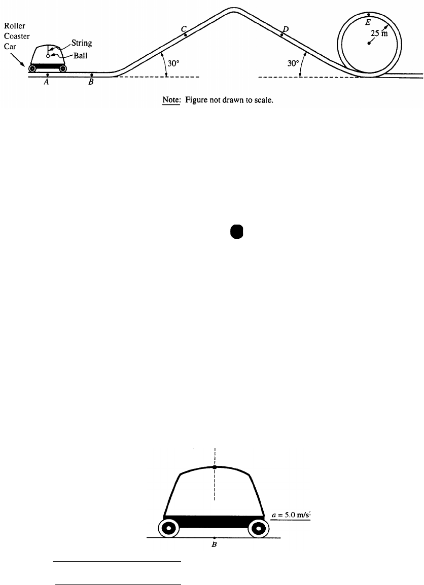 1995B3. Part of the track of an amusement park roller coaster is shaped as shown above. A safety bar is oriented lengthwise along the top of each car. In one roller coaster car, a small 0.10-kilogram ball is suspended from this bar by a short length of light, inextensible string. a. Initially, the car is at rest at point A. i. On the diagram below, draw and label all the forces acting on the 0.10-kilogram ball. ii. Calculate the tension in the string. The car is then accelerated horizontally, goes up a 30° incline, goes down a 30° incline, and then goes around a vertical circular loop of radius 25 meters. For each of the four situations described in parts (b) to (e), do all three of the following. In each situation, assume that the ball has stopped swinging back and forth. 1) Determine the horizontal component Th of the tension in the string in newtons and record your answer in the space provided. 2)Determine the vertical component Tv of the tension in the string in newtons and record your answer in the space provided. 3)Show on the adjacent diagram the approximate direction of the string with respect to the vertical. The dashed line shows the vertical in each situation. b. The car is at point B moving horizontally 2 to the right with an acceleration of 5.0 m/s . Th = Tv = 71 c. The car is at point C and is being pulled up the 30° incline with a constant speed of 30 m/s. Th = Tv = d. The car is at point D moving down the incline with an acceleration of 5.0 m/s2 . Th = Tv = e. The car is at point E moving upside down with an instantaneous speed of 25 m/s and no tangential acceleration at the top of the vertical loop of radius 25 meters. Th = Tv = 72 SECTION B – Circular Motion 1977 B2. A box of mass M, held in place by friction, rides on the flatbed of a truck which is traveling with constant speed v. The truck is on an unbanked circular roadway having radius of curvature R. a. On the diagram provided above, indicate and clearly label all the force vectors acting on the box. b. Find what condition must be satisfied by the coefficient of static friction between the box and the truck bed. Express your answer in terms of v, R, and g. If the roadway is properly banked, the box will still remain in place on the truck for the same speed v even when the truck bed is frictionless. c. On the diagram above indicate and clearly label the two forces acting on the box under these conditions d. Which, if either, of the two forces acting on the box is greater in magnitude? 1984B1. A ball of mass M attached to a string of length L moves in a circle in a vertical plane as shown above. At the top of the circular path, the tension in the string is twice the weight of the ball. At the bottom, the ball just clears the ground. Air resistance is negligible. Express all answers in terms of M, L, and g. a. Determine the magnitude and direction of the net force on the ball when it is at the top. b. Determine the speed vo of the ball at the top. The string is then cut when the ball is at the top. c. Determine the time it takes the ball to reach the ground. d. Determine the horizontal distance the ball travels before hitting the ground. 73 1989B1. An object of mass M on a string is whirled with increasing speed in a horizontal circle, as shown above. When the string breaks, the object has speed vo and the circular path has radius R and is a height h above the ground. Neglect air friction. a. Determine the following, expressing all answers in terms of h, vo, and g. i. The time required for the object to hit the ground after the string breaks ii. The horizontal distance the object travels from the time the string breaks until it hits the ground iii. The speed of the object just before it hits the ground b. On the figure below, draw and label all the forces acting on the object when it is in the position shown in the diagram above. . c. Determine the tension in the string just before the string breaks. Express your answer in terms of M, R, vo, & g. 74 1997B2 (modified) To study circular motion, two students use the hand-held device shown above, which consists of a rod on which a spring scale is attached. A polished glass tube attached at the top serves as a guide for a light cord attached the spring scale. A ball of mass 0.200 kg is attached to the other end of the cord. One student swings the teal around at constant speed in a horizontal circle with a radius of 0.500 m. Assume friction and air resistance are negligible. a. Explain how the students, by using a timer and the information given above, can determine the speed of the ball as it is revolving. b. The speed of the ball is determined to be 3.7 m/s. Assuming that the cord is horizontal as it swings, calculate the expected tension in the cord. c. The actual tension in the cord as measured by the spring scale is 5.8 N. What is the percent difference between this measured value of the tension and the value calculated in part b.? The students find that, despite their best efforts, they cannot swing the ball so that the cord remains exactly horizontal. d. i. On the picture of the ball below, draw vectors to represent the forces acting on the ball and identify the force that each vector represents. ii. Explain why it is not possible for the ball to swing so that the cord remains exactly horizontal. iii. Calculate the angle that the cord makes with the horizontal. 1999B5 A coin C of mass 0.0050 kg is placed on a horizontal disk at a distance of 0.14 m from the center, as shown above. The disk rotates at a constant rate in a counterclockwise direction as seen from above. The coin does not slip, and the time it takes for the coin to make a complete revolution is 1.5 s. a. The figure below shows the disk and coin as viewed from above. Draw and label vectors on the figure below to show the instantaneous acceleration and linear velocity vectors for the coin when it is at the position shown. b. Determine the linear speed of the coin. c. The rate of rotation of the disk 