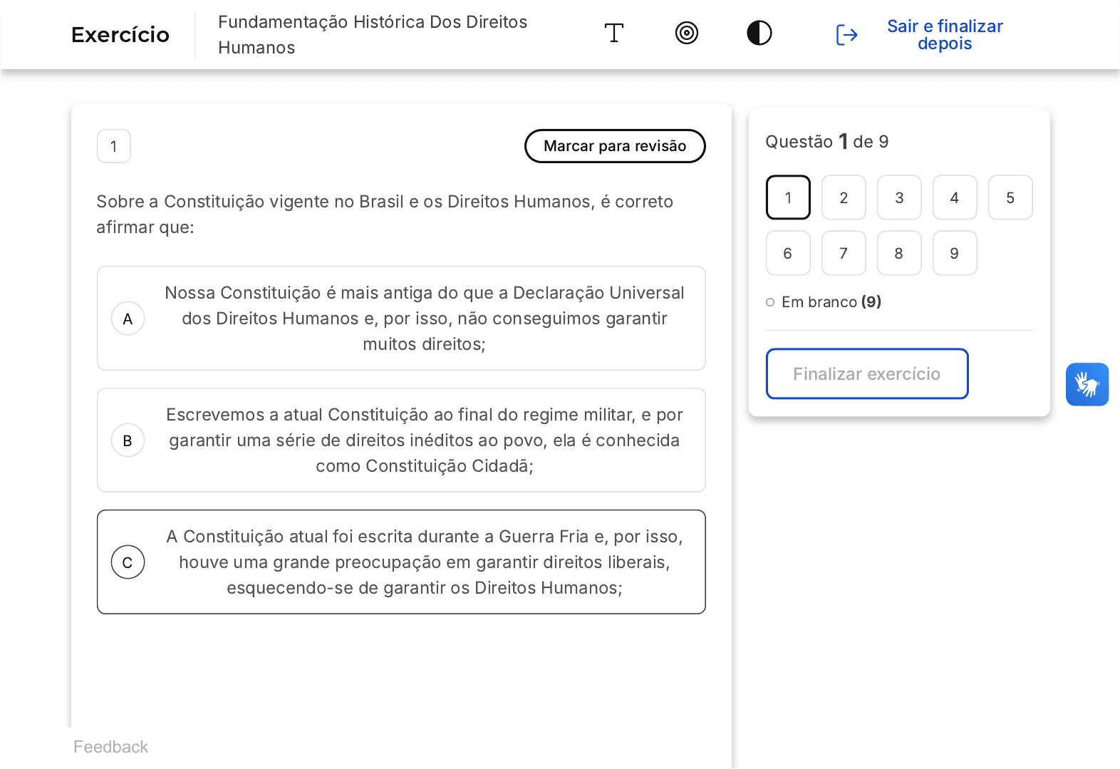 A B C 1 Marcar para revisão Sobre a Constituição vigente no Brasil e os Direitos Humanos, é correto afirmar que: Nossa Constituição é mais antiga do que a Declaração Universal dos Direitos Humanos e, por isso, não conseguimos garantir muitos direitos; Escrevemos a atual Constituição ao final do regime militar, e por garantir uma série de direitos inéditos ao povo, ela é conhecida como Constituição Cidadã; A Constituição atual foi escrita durante a Guerra Fria e, por isso, houve uma grande preocupação em garantir direitos liberais, esquecendo-se de garantir os Direitos Humanos; Questão 1 de 9 Em branco �9� Finalizar exercício 1 2 3 4 5 6 7 8 9 Exercício Fundamentação Histórica Dos Direitos Humanos Sair e finalizar depois Feedback D E A atual Constituição foi escrita durante o regime militar e não fala sobre Direitos Humanos, esses foram garantidos somente em 1990 com emendas parlamentares. A Constituição de 1889 cria no Brasil o princípio de uma República respeitadora dos Direitos Humanos, desde o início da República. 2 Marcar para revisão No início, as declarações de direitos fundamentais concentravam-se principalmente na preservação da liberdade e da igualdade. Contudo, ao longo do século XX, emergiu outro princípio essencial: o respeito à dignidade humana. O artigo inaugural da Declaração Universal dos Direitos Humanos das Nações Unidas, adotada em 1948, proclama: "Todos os seres humanos nascem livres e iguais em dignidade e direitos". Sobre a ideia da dignidade da pessoa humana, podemos afirmar que A B C D E não há um consenso sobre quais seriam as condições necessárias para se assegurar a dignidade da pessoa humana, cada sociedade possui suas necessidades que variam, inclusive, com o tempo. o conceito de dignidade da pessoa humana é uma série de necessidades debatidas e aprovadas por uma Corte internacional das Nações Unidas e que se valida ao ser aceito por mais de 150 países do mundo. a dignidade da pessoa humana é um termo extremamente contestado por antropólogos que apontam que determinar condições de dignidade inferioriza populações que vivem abaixo da linha da pobreza. o termo dignidade da pessoa humana apareceu pela primeira vez na Declaração de Independência dos Estados Unidos que procurava justificar o desrespeito a essas condições como motivo do rompimento com a Inglaterra. a ideia de dignidade da pessoa humana é um conceito social aplicado juridicamente aos direitos fundamentais, sendo a base de todo recurso. A B C D E 3 Marcar para revisão Sobre a composição dos Direitos Universais das Nações Unidas, é correto afirmar: A primeira fase foi a de debates, que aconteceu simultaneamente com a Segunda Guerra Mundial; A segunda fase corresponde à criação da Declaração assinada por todos os países envolvidos na Segunda Guerra Mundial; A terceira fase está acontecendo no século XXI e corresponde à observação e aos esforços de acesso aos Direitos Humanos; A quarta fase dos Direitos Humanos corresponde à formação dos Sistemas Internacionais de proteção aos Direitos Humanos. As declarações dos direitos universais são falsas, afinal os países optam por seguir ou não. A B C D E 4 Marcar para revisão Sobre a teoria das gerações dos Direitos Humanos, é correto afirmar que: A primeira geração corresponde ao momento em que os Direitos Humanos surgiram como um contraponto aos direitos naturais; A segunda geração reafirmou as ideias da primeira geração e procurou construir a ideia de igualdade entre todos os seres humanos; A terceira geração corresponde aos direitos sobre indivíduos e busca a garantia da propriedade privada e dos investimentos financeiros; A quarta geração é a última e procura debater sobre direitos ambientais, que são, atualmente, a maior preocupação do mundo; A primeira geração dos Direitos Humanos defendia o princípio religioso como fundamento da moral humana. A B C D E 5 Marcar para revisão Sobre as críticas feitas ao modelo da Declaração Universal dos Direitos Humanos, destaca-se: A grande ênfase dada aos direitos econômicos e o desprezo pelos direitos de liberdade; A defesa dos direitos militares, reforçando a possibilidade de uma nova guerra mundial; A pouca preocupação em incluir os países africanos nas Nações Unidas, deixando uma parte do mundo desassistida de direitos; O caráter imperialista da Declaração ao se autointitular universal e pressionar a aceitação por todos os países; Ela acaba por proteger os criminosos e não dar proteção aos cidadãos de bem. A B C D E 6 Marcar para revisão O Jusnaturalismo é uma corrente teórica filosófica que defende que o direito: É inerente ao ser humano e que algumas regras sequer precisam ser transformadas em leis para valerem na sociedade; Só é válido a partir do momento que a sociedade clama por ele, e ele se transforma em leis reconhecidas pelo Estado; Não precisa ser discutido na sociedade, pois cada cultura possui suas próprias regras que serão naturalmente obedecidas; É a ferramenta mais importante para se viver em sociedade, pois nenhum grupo é capaz de conviver apenas com regras não-ditas. É uma corrente econômica que permite o controle da propriedade privada. A B C 7 Marcar para revisão O século XX passou por duas guerras mundiais em um curto espaço de tempo que fizeram o mundo refletir sobre a necessidade de uma declaração de direitos que alcançasse todos os homens e mulheres sem distinção. Nesta declaração: Foi criado o conceito de família humana, reforçando a igualdade entre todos e incentivando a empatia entre as pessoas; Existem duras punições aos países que praticarem políticas discriminatórias que possam resultar em novos regimes totalitários; Há a assinatura de todos os países do mundo, o que mostra um consenso sobre a ideia dos Direitos Humanos mesmo que nem sempre eles sejam respeitados; D E A B C Há a assinatura apenas dos paí