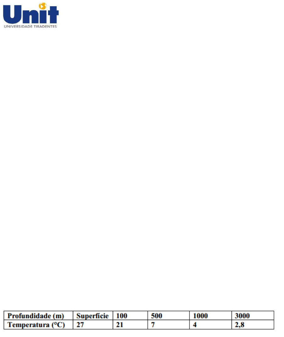 LISTA DE EXERCICIO -2 1/ Utilizando o plano cartesiano marque os pontos A (-1,2) e B (2,3), trace a reta determinada por esses pontos e encontre a sua equação linear. 2/ Uma companhia constrói um armazém por RS 80.000,00. O armazém tem uma vida útil estimada de 25 anos, após o que seu valor estimado será de RS 8.000,00. Estabeleça uma equação linear que dê o valor P do armazém durante os 25 anos de sua vida útil. (Represente por t o tempo em anos) 3/ Estabeleça uma equação linear que expresse a relação a relação entre a temperatura em graus Celsius, C, e em graus Kelvin, K. Utilize o fato de que a água congela a 0° Celsius (273,15 Kelvin) e ferve a 100°Celsius (373,15 Kelvin). 4/ A tabela abaixo mostra a temperatura das águas do oceano atlântico ( ao nível do equador) em função da profundidade. Admitindo que a variação da temperatura seja aproximadamente linear entre cada duas medições feitas para a profundidade, monte a equação e diga qual a temperatura prevista para a profundidade de 400m ? GABARITO 1/ 2/ P = -2880t + 80.000 3/ K = C + 273,15 4/ 10,5