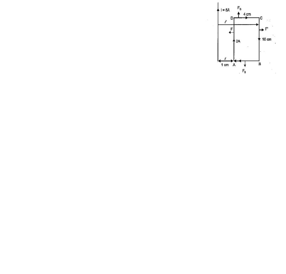 Previous Year CBSE Questions Page 141 of 484 θ = 0, ∴ τ = 0 © we know, FB = © l × B Force between two current carrying wires is given by F= (µ0/2π). (I1I2/r) x l = (µ0/2π) x (5 x 2/ 1 x 10-2) x 0.10 F= (µ0/2π). 100 And F’ = (µ0/2π) x (5 x 2/ 1 x 10-2) x 0.10 F’ = (µ0/2π) x 20 Now, resultant force on the loop, Fnet = F – F’ = (µ0/2π) (100 – 20) = 2 x 10-7 x 80 = 16 x 10-6 N The direction of net force is towards the straight wire i.e., attractive. Assertion-Reason 20.(b) The magnetic dipole moment will be reduced to half when broken into two equal pieces and every atom behaves like a dipole so the dipole of a magnet cannot be separated. 21.(a) When a bar magnet is placed in a uniform magnetic field. Then the bar magnet will experience only torque and no force, and this torque on the bar magnet will be acting on both ends, and will be equal but opposite in direction. 22.(d) Parallel currents attract and antiparallel currents repel. 23.(a) Gauss’s law of magnetism is different from that for electrostatics because electric charges do not necessarily exist in pairs but magnetic monopoles do not exist. 24.(b) B =μ0Ni, from this formula we see the dependence of B in current and inside a solenoid it is uniform. 25.(c) Force =q(V x B) it is independent of mass and if v and B are perpendicular to each other, the particle describes a circle. 26.(a) A charged particle moves in a circle when its velocity is perpendicular to the magnetic field. When it forms an acute angle with the magnetic field, it can be resolved in two components, parallel and perpendicular. The perpendicular components tend to move it in a circle, the parallel components tend to move along the magnetic field to form a helical motion of uniform radius and pitch. Previous Year CBSE Questions Page 142 of 484 27.(c) Torque, τ = mBsinθ Here ɵ = 90°, Sin 90° = 1 so torque will be maximum. 28.(b) A galvanometer is a device that is used to detect small electric current or measure its magnitude. The current sensitivity of a galvanometer is the deflection of current per unit current passing through the coil 𝐼𝑠= 𝑁𝐴𝐵 𝑘 29.(b) Assertion is the property of a magnet while reason is one of the sources of magnetic field. Case study based question 30. 1.(a) The forces of magnitude Mb act opposite to each other on two poles, hence net force acting on the dipole due to external magnetic field is zero. 2.(b) Forces acting on the poles are along different lines of action constituting a couple hence non zero torque. 3.(a) The magnetic dipole moment of a current loop is the product of the current passing through the loop and the area inside the loop. 4.(c)Materials with no unpaired, or isolated electrons are considered diamagnetic. Diamagnetic substances do not have magnetic dipole moments. 5.(d)Every magnet has two poles,no monopole exists. 31.1. (b) Magnetic field 2.(c) If v is parallel to B 3.(d) + Y axis 4.(d) All of these 5.(d) A helix with non-uniform pitch *********** Previous Year CBSE Questions Page 143 of 484 SECTION C MCQ Q1. The magnetic force acting on a charged particle of charge −2𝜇𝐶 in a magnetic field of 2T acting in y direction, when the particle velocity is (2𝑖̂ + 𝑗̂) × 106𝑚𝑠−1, is (a) 4 N in z direction (b) 8 N in y direction (c) 8 N in z direction (d) 8 N in −𝑧 direction Q2. Two long parallel wires carry currents 𝑖1 and 𝑖2 such that 𝑖1 > 𝑖2. When the currents are in the same direction, the magnetic field at a point midway between the wires is 6 × 10−6𝑇. If the direction of 𝑖2 is reversed, the field become 3 × 10−5𝑇. The ratio of 𝑖1 𝑖2 is (a) 1/2 (b) 2 (c) 2/3 (d) 3/2 Q3. A straight wire carrying current l is made in circular loop. If M is the magnetic moment associated with the loop, then the length of the wire is (a) √ 4𝜋𝑀 𝑙 (b) √ 2𝜋𝑀 𝑙 (c) √ 𝜋𝑀 𝑙 (d) √ 𝜋𝑀 2𝑙 Q4. Two similar coils of radius R are lying concentrically with their planes at right angles each other. The currents flowing in them are 𝐼 and 2I, respectively. The resultant magnetic field induction at the centre will be (a) √5𝜇0𝑙 2𝑅 (b) 3𝜇0𝑙 2𝑅 (c) 𝜇0𝑙 2𝑅 (d) 𝜇0𝑙 𝑅 Q5. An electron is projected with uniform velocity along the axis of a current carrying long solenoid. Which of the following is true? (a) The electron will be accelerated along the axis. (b) The electron path will be circular about the axis. (c) The electron will experience a force at 45° to the axis and hence execute a helical-path. (d) The electron will continue to move with uniform velocity along the axis of the solenoid. Q6.In a certain region of space electric field �⃗� and magnetic field �⃗� are perpendicular to each other .An electron enters particularly to both fields and moves undeflected . The velocity of electron is (a)E / B (b) B / E (c) 𝐸 ⃗⃗ ⃗X �⃗� (d) 𝐸 .⃗⃗ ⃗⃗ �⃗� Previous Year CBSE Questions Page 144 of 484 Q7. A rectangle loop carrying a current ( i) is situated near a long straight wire such that the wire is parallel to the one of the sides of the loop and is in the plane of the loop. If a steady current i is established in wire as shown in the figure below, the loop will (a) Rotate about an axis parallel to the wire (b) Move away from the wire or towards right (c ) Move towards the wire or towards left (d) Remain stationary Q8. A wire in the form of a circular loop, of one turn carrying a current, produces magnetic field B at the centre. If the same wire is looped into a coil of two turns and carries the same current, the new value of magnetic induction at the Centre is (a)B (b) 2B (c) 4B (d) 8B Q9.When a magnetic dipole of moment �⃗⃗� rotates freely about its axis from unstable equilibrium to stable equilibrium in a magnetic field �⃗� , the rotational kinetic energy gained by it is : (a)–M.B (b) 2 𝑀.𝐵 (c) 2M.B (d) 𝑀 𝐵 Q10.T