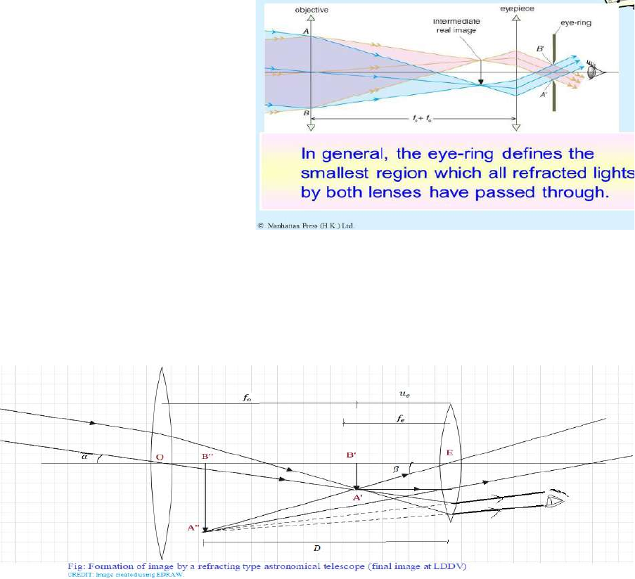 Previous Year CBSE Questions Page 291 of 484 All the rays from the object refracted by the objective go through the eyering. Therefore, it is an ideal position for our eyes for viewing. If we place our eyes too close to the eye-piece, we shall not collect much of the light and also reduce our field of view. If we position our eyes on the eyering and the area of the pupil of our eye is greater or equal to the area of the eyering, our eyes will collect all the light refracted by the objective. The exact location of the eyering depends on the separation between the objective and the eyepiece and the focal length of the eyepiece. 43. Magnifying power: The magnifying power of a telescope is defined as the ratio of the angle subtended at the eye by the final image formed at the least distance of distinct vision to the angle subtented at the eye by the object at infinity, when seen directly. Factors for increasing the magnifying power: (i) Increasing focal length of the objective (ii) Decreasing focal length of the eyepiece. Limitations of a refracting telescope: (v) Suffers from chromatic aberration (vi) Suffers from spherical aberration (vii) Small magnifying power (viii) Small resolving power Previous Year CBSE Questions Page 292 of 484 Advantages of a reflecting telescope: (v) No chromatic aberration, because mirror objective is used. (vi) Spherical aberration can be removed by paraboloidal mirror. (vii) Image is bright because there is no loss of energy due to refraction. (viii) Large mirror provides an easier mechanical support over its entire back surface. 44. Magnifying power, 𝑚 = 𝛽 𝛼 = tan𝛽 tan𝛼 = 𝐴′𝐵′ 𝐴′𝐶2⁄ 𝐴′𝐵′ 𝐴′𝐶1⁄ 𝑚 = 𝐴′𝐶1 𝐴′𝐶2 𝑚 = − 𝑓0 𝑓𝑒 𝑤ℎ𝑒𝑟𝑒, 𝐴′𝐶1 = −𝑓0 , 𝐴′𝐶2 = 𝑓𝑒 Construction difference: Microscope Telescope 1. Objective is of very short focal length and of short aperture. 1. Objective is of large focal length and of large aperture. 2.Eyepiece is of short focal length (but fe > fo) and large aperture. 2. Eyepiece is of short focal length and short aperture. Working difference: Microscope Telescope 1. Objective forms real and magnified image of an object kept just beyond the focus. 1. Objective forms image of the distant object at, or within, the focus of its eyepiece. 2. It produces linear magnification, i.e., size of the image is larger than that of the object. 2. It produces angular magnification i.e, the image is nearer to the eye but the size does not increase. 45. (i) Refer 5 marks question, section B, question (5) (ii) 𝑓0 = 20𝑓𝑒 ∴ 𝑓0 𝑓𝑒 = 20 ∴ 𝑚 = 20 Previous Year CBSE Questions Page 293 of 484 SECTION-C 1MARK Q1. On what factors does the magnifying power of a compound microscope depend? Q2. What is the nature of final image formed in a compound microscope? Q3. What do you mean by normal adjustment of a telescope? Q4. The focal length of the objective and eyepiece of a telescope are 𝑓𝑜 𝑎𝑛𝑑 𝑓𝑒respectively what is the magnifying power of the telescope in normal adjustment? Q5. Name the two types of reflecting telescopes? Q6. Write the important features of a good telescope? Q7. Define the term magnifying power of a compound microscope? Q8. Write the expression for magnifying power of a telescope when the final image is formed at the least distance of distinct vision Q9. In a telescope objective lens is of large focal length while eyepiece is of small focal length. Why Q10. Out of blue and red light which is deviated more by a prism? Give reason? MCQ Q11. To increase the magnifying power of a telescope, we should increase a) Focal length of the objective b) Focal length of the eyepiece c) Aperture of the objective. d) Aperture of the eyepiece. Q12. In a compound microscope, the objective produces a magnification of 10, while the eyepiece produces a magnification of 5, then the overall magnification achieved by a compound microscope is a) 2 b) 50 c) 0.5 d) 25 Q13. If 𝑓𝑜and 𝑓𝑒 are the focal lengths of the objective and eyepiece of an astronomical telescope, the length of the tube is a) 𝑓𝑜+ 𝑓𝑒 b) 𝑓𝑜- 𝑓𝑒 Previous Year CBSE Questions Page 294 of 484 c) √𝑓𝑜 × 𝑓𝑒 d) 𝑓𝑜𝑓𝑒 𝑓𝑜+ 𝑓𝑒 Q14. An astronomical telescope is set for normal adjustment and the distance between the objective and eyepiece is 1.05 metre. The magnifying power of the telescope is 20. What is the focal length of the objective? a) 2m b) 1m c) .5m d) .25m Q15. When a telescope is in normal adjustment, the distance of the objective from the eyepiece is 100cm. if the magnifying power of the telescope in normal adjustment is 24, the focal length of the lenses are a) 96cm, 4cm b) 90cm, 10cm c) 80cm, 20cm d) 50cm, 50cm 2MARKS Q16. Draw a ray diagram to show the image formation by a concave mirror when the object is placed between its focus and pole. Using this diagram, derive the magnification produced in the image. Q17. Draw a labelled diagram for the formation of image by a compound microscope when the final image is formed at the near point or the least distance of distinct vision? Q18. Draw a ray diagram to obtain the image at the least distance of distinct vision using an astronomical telescope? Q19 Draw a schematic ray diagram of a reflecting type telescope (Cassegrain)? Q20. Draw a ray diagram to obtain the image by an astronomical telescope in normal adjustment position? 3MARKS Q21. Two convex lenses A and B of an astronomical telescope having focal lengths 5cm and 20 cm respectively, are arranged as shown in the figure: (i) Which one of the two lenses you will select to use as the objective lens and why? (ii) What should be the change in the distance between the lenses to have the telescope in its normal adjustment position? (iii) Calculate the magnifying power of the telescope in the normal adjustment position. (CBSE SAMPLE PAPER 2003) Previous Year CBSE Questions Page