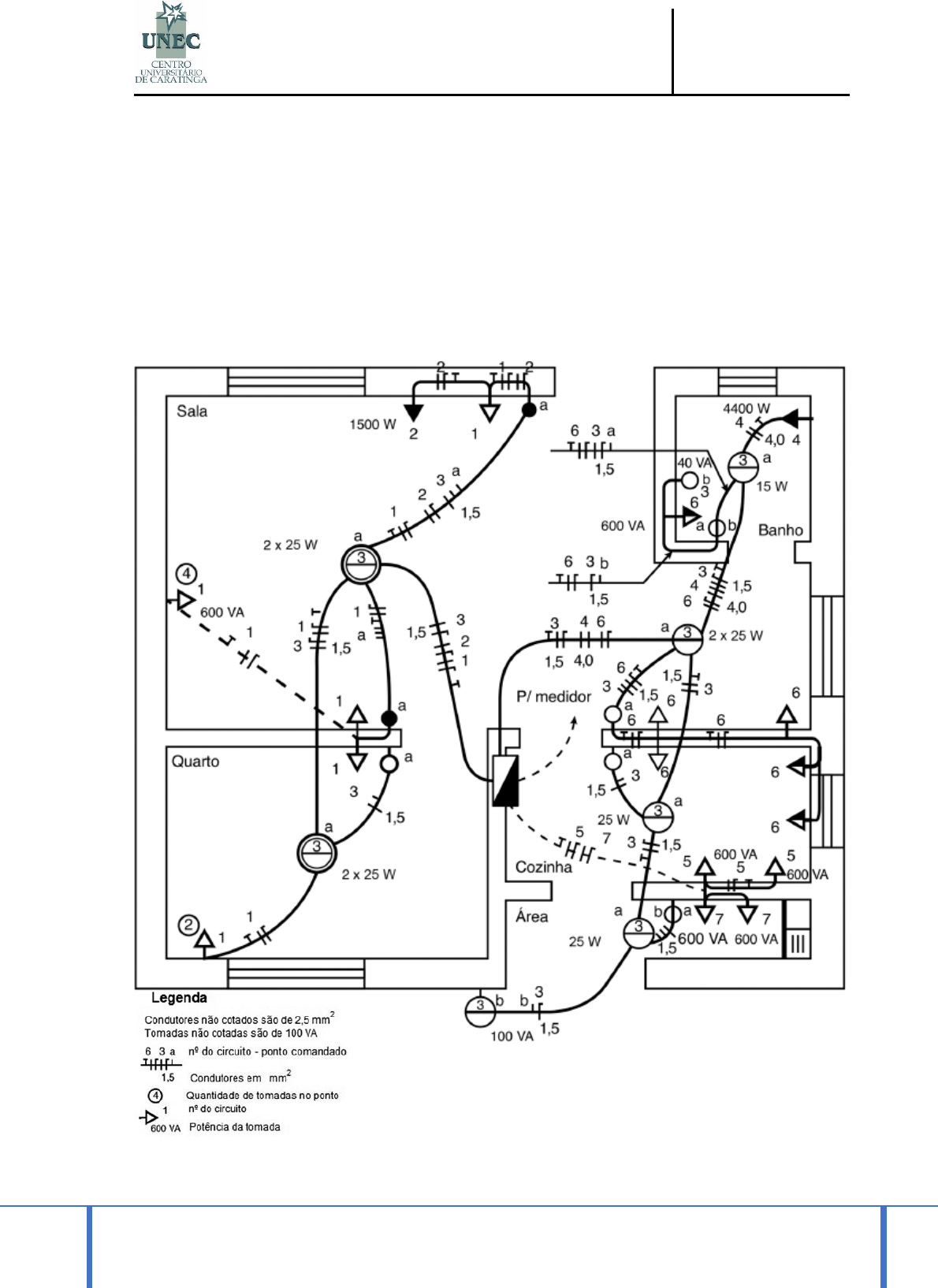 CENTRO UNIVERSITÁRIO DE CARATINGA GRADUAÇÃO UNEC / EAD DISCIPLINA: INSTALAÇÕES ELÉTRICAS PREDIAIS NÚCLEO DE ENSINO A DISTÂNCIA - NEAD Página | 30 Professor: Joildo Fernandes – joildo.unec@gmail.com 2. Projeto Elétrico O projeto elétrico pode ser definido como uma previsão escrita da instalação elétrica, contendo todos os seus detalhes, a localização dos pontos de utilização da energia elétrica, dos pontos de comandos, do trajeto dos eletrodutos e condutores, a divisão em circuitos, o dimensionamento da seção dos condutores, os dispositivos de manobra e proteção, a carga de cada circuito, a carga total etc. (CREDER, 2016) Figura 25 – Exemplo de planta baixa de uma residência. Fonte: Adaptado de CREDER, Hélio. Instalações elétricas. 16. ed. Rio de Janeiro: LTC, 2016. CENTRO UNIVERSITÁRIO DE CARATINGA GRADUAÇÃO UNEC / EAD DISCIPLINA: INSTALAÇÕES ELÉTRICAS PREDIAIS NÚCLEO DE ENSINO A DISTÂNCIA - NEAD Página | 31 Professor: Joildo Fernandes – joildo.unec@gmail.com 2.1. Símbolos Utilizados A fim de facilitar a execução do projeto e a identificação dos diversos pontos de utilização, lança-se mão de símbolos gráficos para representar os elementos atribuí- dos ao projeto. A norma NBR 5444 tem como finalidade padronizar a simbologia elétrica pre- dial, mas o mercado na prática não utiliza tal normatização com frequência, a norma é datada de fevereiro de 1989 e não passou por atualizações, na atualidade os proje- tos são elaborados com auxilio de programas computacionais desenvolvidos exclusi- vamente para a finalidade de projetar instalações elétricas, podemos citar o software QIElétrico fornecido pela empresa Altoqi ( https://altoqi.com.br/ ), sendo assim estes softwares trazem um biblioteca recheadas de símbolos chamados de “usuais”, os sím- bolos mais aplicados no mercado pelos engenheiros em projetos de instalações pre- diais. Os programas também permitem a edição e criação de novos símbolos de acordo com o desejo de cada projetista. Em termos de padronização temos que ter atenção no elemento “legenda” como não existe uma norma atualizada precisamos usar com sabedoria o recurso da legenda, nela estará a descrição de cada simbologia divergente da norma NBR 5444. 2.2. Previsão da Carga A previsão das cargas elétricas em um projeto de instalações prediais é uma informação das mais importantes, pois será a partir desta informação que todo projeto será dimensionado, um levantamento de cargas realizado de forma equivocada po- derá inviabilizar o projeto e consequentemente as instalações elétricas executadas baseadas no projeto. O projetista precisa ser minucioso na investigação das informações conside- rando o desejo momentâneo do cliente (moradores das futuras instalações) como tam- bém levar em consideração alterações futuras, quanto mais informações forem cole- tadas maior será a robustez do projeto para se adequar as mudanças de habito e tecnologias em um futuro breve. https://altoqi.com.br/ CENTRO UNIVERSITÁRIO DE CARATINGA GRADUAÇÃO UNEC / EAD DISCIPLINA: INSTALAÇÕES ELÉTRICAS PREDIAIS NÚCLEO DE ENSINO A DISTÂNCIA - NEAD Página | 32 Professor: Joildo Fernandes – joildo.unec@gmail.com O profissional de arquitetura é um bom aliado nesta investigação, a comunica- ção com todos os stakeholders (pessoas envolvidas no projeto) é crucial para o su- cesso do mesmo. Após definir todos os equipamentos/cargas das futuras instalações é preciso ter atenção especial no aspecto técnico para determinar a verdadeira demanda para a finalidade do equipamento, a carga a se considerar para um equipamento de utiliza- ção é a sua potência nominal absorvida, dada pelo fabricante ou calculada a partir da tensão nominal, da corrente nominal e do fator de potência. Nos casos em que for dada a potência nominal fornecida pelo equipamento (potência da saída), e não a absorvida, devem ser considerados o rendimento e o fator de potência. (conforme ilustrado no exemplo do item 1.12.3 da AULA 2). Um recurso que pode auxiliar na etapa de previsão de carga são as tabelas de previsão de cargas fornecidas pelas empresas concessionárias de energia, as empre- sas disponibilizas em suas normas uma relação de equipamentos e com suas potên- cias absorvidas da rede elétrica, veja exemplo na figura 26, fornecida pela Cemig (Companhia Energética de Minas Gerais S.A.). Figura 26 – Tabela de carga fornecida pela concessionária de energia (parcial). Fonte: Norma de Distribuição ND – 5.1 Pág. 71 - CEMIG. CENTRO UNIVERSITÁRIO DE CARATINGA GRADUAÇÃO UNEC / EAD DISCIPLINA: INSTALAÇÕES ELÉTRICAS PREDIAIS NÚCLEO DE ENSINO A DISTÂNCIA - NEAD Página | 33 Professor: Joildo Fernandes – joildo.unec@gmail.com As informações para previsão, de preferência, devem ser verificadas no próprio equipamento ou modelo através das informações do fabricante, quando da impossibi- lidade sugere-se a utilização genérica estimada pelas empresas concessionárias de energia. 2.2.1. Carga de iluminação As cargas de iluminação são determinadas segundo a norma NBR 5410, o di- mensionamento baseado na norma tem como base as lâmpadas incandescentes, para a utilização de lâmpadas do tipo fluorescente ou LED, os valores de potência estipulados pela norma podem ser reduzidos em aproximadamente 4 vezes, mas atenção, é sempre bom trabalhar um uma demanda de reserva, para os casos de mudança de hábitos, estilos e escolhas futuras, a iluminação pode ser trabalhada como elemento de design, sendo assim estimar um potência mínima apenas consi- derando a potência útil necessária para o ambiente pode inviabilizar mudanças futu- ras. A experiência ao longo dos anos tem demonstrado que seguir o dimensiona- mento proposto pela norma NBR 5410, traz robustez ao projeto para diversificação da iluminação, pois, mesmo reduzindo a potência das lâmpadas considerando n