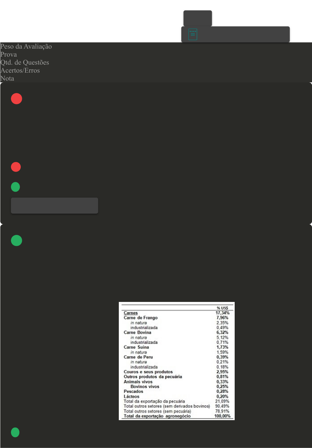 31/10/2024 21:55 Avaliação Final (Objetiva) - Individual about:blank 1/7 Prova Impressa GABARITO | Avaliação Final (Objetiva) - Individual (Cod.:884463) Peso da Avaliação 3,00 Prova 69262563 Qtd. de Questões 12 Acertos/Erros 5/7 Nota 5,00 As raças bovinas são classificadas quanto a sua origem em europeias ou taurinas, zebuínas e sintéticas. Elas se destacam por sua capacidade para a produção de leite, de carne ou por dupla aptidão (leite e carne). Sobre as raças produtoras de leite, assinale a alternativa CORRETA: A No grupo das raças zebuínas leiteiras, a mais conhecida e utilizada é a raça Girolando. B No grupo das raças europeias, as mais conhecidas são: Gir, Guzerá e Sindi. C Das raças europeias, a mais difundida e utilizada no Brasil e no mundo é a raça Pardo-suíço. D Os animais das raças zebuínas se adaptam melhor às condições tropicais, sendo a raça Gir a mais utilizada. A bovinocultura de corte brasileira é uma das mais importantes do mundo. Além disso, ela possui grande importância no agronegócio nacional. A Tabela apresenta o total das exportações do agronegócio em 2016, com destaque para quanto as exportações de carne bovina e outros derivados do boi representam neste total (ABIEC, 2017). Nesse contexto, sobre o Brasil e o mercado de carne bovina, assinale a alternativa CORRETA: FONTE: ABIEC. Associação Brasileira das Indústrias Exportadoras de Carnes. Perfil da Pecuária no Brasil - Relatório anual. 2017. Disponível em: http://abiec. siteoficial.ws/images/upload/sumario-pt- 010217.pdf. Acesso em: 11 jun. 2018. A Se considerarmos o setor da carne bovina, a carne bovina in natura teve maior representatividade nas exportações. VOLTAR A+ Alterar modo de visualização 1 Revisar Conteúdo do Livro 2 31/10/2024 21:55 Avaliação Final (Objetiva) - Individual about:blank 2/7 B A carne bovina industrializada representou 5,83% das exportações do agronegócio. C O setor de couros e seus produtos foi responsável por mais de 5% das exportações do agronegócio. D Do total exportado pelo agronegócio brasileiro, aproximadamente 78% foram representados pelas exportações da pecuária. A salga é um dos métodos mais antigos utilizados pelo homem para conservar os alimentos. De acordo com Ordóñez et al. (2005), conforme a maneira que é realizado, o processo pode ser denominado de salga seca, salga mista e salga úmida. Considerando esse contexto, avalie as asserções a seguir e a relação proposta entre elas: I- A salga é um processo empregado para conservação de produtos como peixes (anchova, bacalhau, entre outros), carnes, entre outros. PORQUE II- O efeito conservador da salga nos alimentos é devido à acidificação e cozimento destes, eliminando todas as bactérias que causam alterações e também algumas reações enzimáticas. Assinale a alternativa CORRETA: FONTE: ORDÓÑEZ, J. A. et al. Tecnologia de alimentos: alimentos de origem animal. Porto Alegre: Artmed, 2005. v. 2. A A asserção I é uma proposição verdadeira, e a II é uma proposição falsa. B As asserções I e II são proposições falsas. C A asserção I é uma proposição falsa, e a II é uma proposição verdadeira. D As asserções I e II são proposições verdadeiras. Em qualquer atividade econômica, os custos de produção correspondem à remuneração dos diversos fatores de produção empregados na obtenção do produto. Além do custo de produção ser desconhecido por grande parte dos produtores brasileiros, o nível de capacitação da mão de obra utilizada nas propriedades é baixíssimo. Sobre os custos de produção, analise as afirmativas a seguir: I- O pró-labore do produtor corresponde ao valor compatível com a remuneração a que o produtor faria jus ao oferecer seus serviços no mercado de trabalho. II- As depreciações são todos os gastos ou pagamentos efetivamente realizados, com exceção dos investimentos. III- Os desembolsos são calculados com relação às instalações das benfeitorias, das máquinas e equipamentos. IV- Os desembolsos são aplicados a todos os itens que compõem o capital usado na pecuária de corte, exceto o valor das pastagens. Assinale a alternativa CORRETA: A 3 Revisar Conteúdo do Livro 4 31/10/2024 21:55 Avaliação Final (Objetiva) - Individual about:blank 3/7 As afirmativas I, II e III estão corretas. B Somente a afirmativa I está correta. C As afirmativas II e III estão corretas. D As afirmativas I e IV estão corretas. De acordo com Silva et al. (2015), um sistema de rastreabilidade beneficia, em diferentes níveis, os diferentes atores de determinada cadeia de produção e de distribuição de um produto. Nesse sentido, sobre os benefícios da rastreabilidade para os produtores e para as organizações, assinale alternativa CORRETA: FONTE: SILVA, A. R. DA; BENEZ, F. M. Produção e manejo de bovinos de corte. Cap. 5: Manejo básico de bovinos de corte na fase de cria - aspectos relevantes. Cuiabá, MT: KCM Editora, 2015. A Proteção contra práticas enganosas de marketing e de comércio. B Possibilidade de formalização do setor, gerando mecanismos de controle e de arrecadação de tributos. C Facilitar a identificação e a resolução de problemas relacionados à qualidade, permitindo minimizar ou mesmo evitar prejuízos financeiros. D Avaliação e gestão de políticas públicas e promoção do desenvolvimento setorial. Em qualquer atividade econômica, os custos de produção correspondem à remuneração dos diversos fatores de produção empregados na obtenção do produto. Além do custo de produção ser desconhecido por grande parte dos produtores brasileiros, o nível de capacitação da mão de obra utilizada nas propriedades é baixíssimo. Sobre os custos de produção, classifique V para as sentenças verdadeiras e F para as falsas: ( ) O pró-labore do produtor corresponde ao valor compatível com a remuneração a que o produtor faria jus ao oferecer seus serviços no me