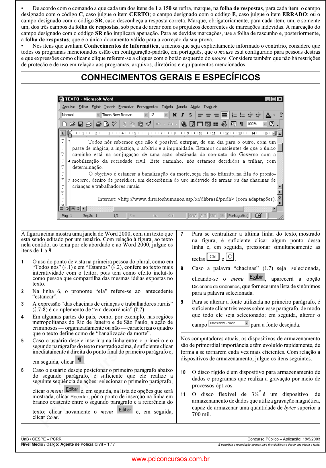 pcimarkpci MjgwNDowMTRjOjAxMzg6ODY2Zjo5MTQyOmEyM2E6NzNmMjphZWM3:VGh1LCAzMSBPY3QgMjAyNCAyMjoxODowNCAtMDMwMA== www.pciconcursos.com.br UnB / CESPE – PCRR Concurso Público – Aplicação: 18/5/2003 Nível Médio / Cargo: Agente de Polícia Civil – 1 / 7 É permitida a reprodução apenas para fins didáticos e desde que citada a fonte. • De acordo com o comando a que cada um dos itens de 1 a 150 se refira, marque, na folha de respostas, para cada item: o campo designado com o código C, caso julgue o item CERTO; o campo designado com o código E, caso julgue o item ERRADO; ou o campo designado com o código SR, caso desconheça a resposta correta. Marque, obrigatoriamente, para cada item, um, e somente um, dos três campos da folha de respostas, sob pena de arcar com os prejuízos decorrentes de marcações indevidas. A marcação do campo designado com o código SR não implicará apenação. Para as devidas marcações, use a folha de rascunho e, posteriormente, a folha de respostas, que é o único documento válido para a correção da sua prova. • Nos itens que avaliam Conhecimentos de Informática, a menos que seja explicitamente informado o contrário, considere que todos os programas mencionados estão em configuração-padrão, em português, que o mouse está configurado para pessoas destras e que expressões como clicar e clique referem-se a cliques com o botão esquerdo do mouse. Considere também que não há restrições de proteção e de uso em relação aos programas, arquivos, diretórios e equipamentos mencionados. CONHECIMENTOS GERAIS E ESPECÍFICOS A figura acima mostra uma janela do Word 2000, com um texto que está sendo editado por um usuário. Com relação à figura, ao texto nela contido, ao tema por ele abordado e ao Word 2000, julgue os itens de 1 a 9. �� O uso do ponto de vista na primeira pessoa do plural, como em “Todos nós” (R.1) e em “Estamos” (R.2), confere ao texto mais interatividade com o leitor, pois tem como efeito incluí-lo como pessoa que compartilha das mesmas idéias expostas no texto. �� Na linha 6, o pronome “ela” refere-se ao antecedente “estancar”. �� A expressão “das chacinas de crianças e trabalhadores rurais” (R.7-8) é complemento de “em decorrência” (R.7). �� Em algumas partes do país, como, por exemplo, nas regiões metropolitanas do Rio de Janeiro e de São Paulo, a ação de criminosos — organizadamente ou não — caracteriza o quadro que o texto define como de “banalização da morte”. �� Caso o usuário deseje inserir uma linha entre o primeiro e o segundo parágrafos do texto mostrado acima, é suficiente clicar imediatamente à direita do ponto final do primeiro parágrafo e, em seguida, clicar . �� Caso o usuário deseje posicionar o primeiro parágrafo abaixo do segundo parágrafo, é suficiente que ele realize a seguinte seqüência de ações: selecionar o primeiro parágrafo; clicar o menu e, em seguida, na lista de opções que será mostrada, clicar Recortar; pôr o ponto de inserção na linha em branco existente entre o segundo parágrafo e a referência do texto; clicar novamente o menu e, em seguida, clicar Colar. �� Para se centralizar a última linha do texto, mostrado na figura, é suficiente clicar algum ponto dessa linha e, em seguida, pressionar simultaneamente as teclas� e �. � Caso a palavra “chacinas” (R.7) seja selecionada, clicando-se o menu , aparecerá a opção Dicionário de sinônimos, que fornece uma lista de sinônimos para a palavra selecionada. � Para se alterar a fonte utilizada no primeiro parágrafo, é suficiente clicar três vezes sobre esse parágrafo, de modo que todo ele seja selecionado; em seguida, alterar o campo para a fonte desejada. Nos computadores atuais, os dispositivos de armazenamento são de primordial importância e têm evoluído rapidamente, de forma a se tornarem cada vez mais eficientes. Com relação a dispositivos de armazenamento, julgue os itens seguintes. ��� O disco rígido é um dispositivo para armazenamento de dados e programas que realiza a gravação por meio de processos ópticos. ��� O disco flexível de 3½” é um dispositivo de armazenamento de dados que utiliza gravação magnética, capaz de armazenar uma quantidade de bytes superior a 700 mil. www.pciconcursos.com.br pcimarkpci MjgwNDowMTRjOjAxMzg6ODY2Zjo5MTQyOmEyM2E6NzNmMjphZWM3:VGh1LCAzMSBPY3QgMjAyNCAyMjoxODowNCAtMDMwMA== www.pciconcursos.com.br UnB / CESPE – PCRR Concurso Público – Aplicação: 18/5/2003 Nível Médio / Cargo: Agente de Polícia Civil – 2 / 7 É permitida a reprodução apenas para fins didáticos e desde que citada a fonte. É essencial que as autoridades revejam as providências1 referentes ao tratamento e à custódia de todos os presos, a fim de assegurar que os mesmos sejam tratados com humanidade e em conformidade com a legislação brasileira e o conjunto de4 princípios da Organização das Nações Unidas (ONU) sobre proteção de todo indivíduo sob qualquer forma de detenção ou reclusão, as regras mínimas da ONU sobre o tratamento de7 prisioneiros e o artigo 10 do Acordo Internacional sobre os Direitos Civis e Políticos (ICCPR), que reza que todo indivíduo privado de liberdade deve ser tratado com10 humanidade e respeito pela dignidade inerente à pessoa humana. Anistia Internacional. Tortura e maus-tratos no Brasil, 2001, p. 72 (com adaptações). Tendo o texto acima por referência e considerando o tema por ele tratado, julgue os itens seguintes. ��� Como o texto se refere a várias ações, seria gramaticalmente correto substituir “É essencial” (R.1) por São essenciais. ��� A eliminação do termo referencial “os mesmos” (R.3) prejudicaria a coerência do texto. ��� O verbo rezar tem várias acepções e a forma “reza” (R.9) está sendo utilizada no texto com o sentido de: contém escrito, encerra, prescreve, preceitua, determina. 