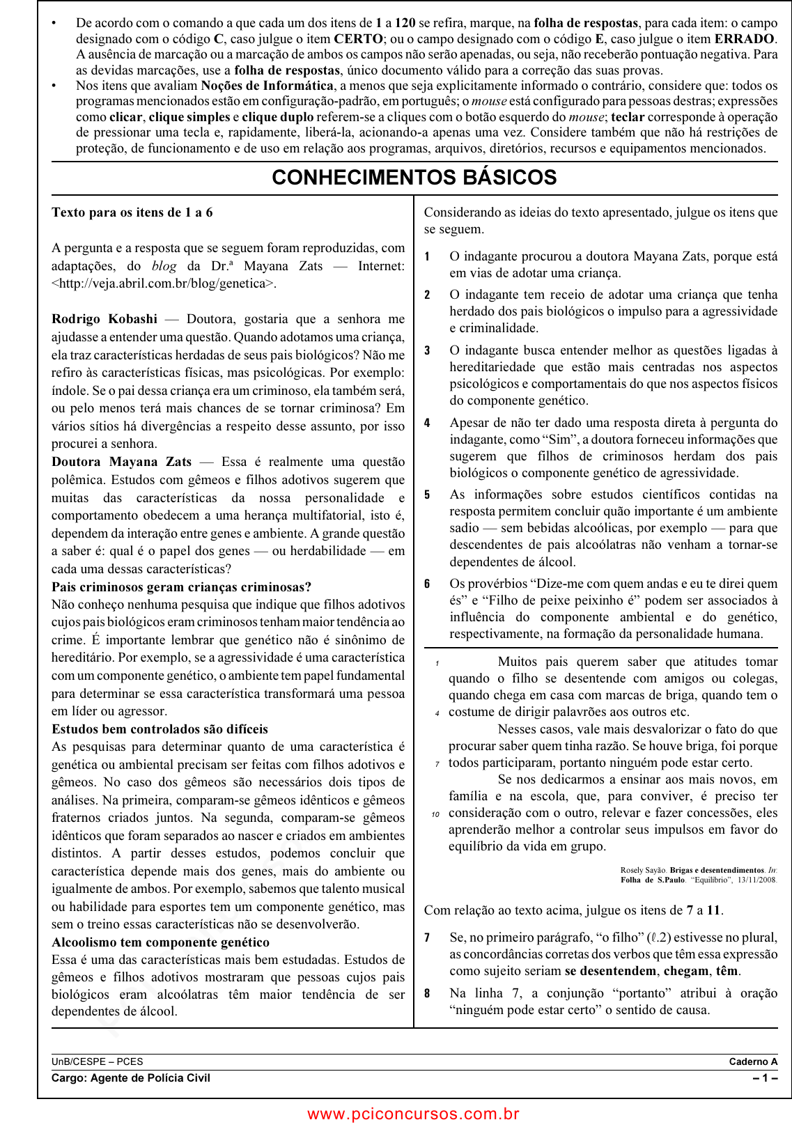 pcimarkpci MjgwNDowMTRjOjAxMzg6ODY2Zjo5MTQyOmEyM2E6NzNmMjphZWM3:VGh1LCAzMSBPY3QgMjAyNCAyMjoxNjo0OCAtMDMwMA== www.pciconcursos.com.br UnB/CESPE – PCES Caderno A Cargo: Agente de Polícia Civil – 1 – • De acordo com o comando a que cada um dos itens de 1 a 120 se refira, marque, na folha de respostas, para cada item: o campo designado com o código C, caso julgue o item CERTO; ou o campo designado com o código E, caso julgue o item ERRADO. A ausência de marcação ou a marcação de ambos os campos não serão apenadas, ou seja, não receberão pontuação negativa. Para as devidas marcações, use a folha de respostas, único documento válido para a correção das suas provas. • Nos itens que avaliam Noções de Informática, a menos que seja explicitamente informado o contrário, considere que: todos os programas mencionados estão em configuração-padrão, em português; o mouse está configurado para pessoas destras; expressões como clicar, clique simples e clique duplo referem-se a cliques com o botão esquerdo do mouse; teclar corresponde à operação de pressionar uma tecla e, rapidamente, liberá-la, acionando-a apenas uma vez. Considere também que não há restrições de proteção, de funcionamento e de uso em relação aos programas, arquivos, diretórios, recursos e equipamentos mencionados. CONHECIMENTOS BÁSICOS Texto para os itens de 1 a 6 A pergunta e a resposta que se seguem foram reproduzidas, com adaptações, do blog da Dr.ª Mayana Zats — Internet: . Rodrigo Kobashi — Doutora, gostaria que a senhora me ajudasse a entender uma questão. Quando adotamos uma criança, ela traz características herdadas de seus pais biológicos? Não me refiro às características físicas, mas psicológicas. Por exemplo: índole. Se o pai dessa criança era um criminoso, ela também será, ou pelo menos terá mais chances de se tornar criminosa? Em vários sítios há divergências a respeito desse assunto, por isso procurei a senhora. Doutora Mayana Zats — Essa é realmente uma questão polêmica. Estudos com gêmeos e filhos adotivos sugerem que muitas das características da nossa personalidade e comportamento obedecem a uma herança multifatorial, isto é, dependem da interação entre genes e ambiente. A grande questão a saber é: qual é o papel dos genes — ou herdabilidade — em cada uma dessas características? Pais criminosos geram crianças criminosas? Não conheço nenhuma pesquisa que indique que filhos adotivos cujos pais biológicos eram criminosos tenham maior tendência ao crime. É importante lembrar que genético não é sinônimo de hereditário. Por exemplo, se a agressividade é uma característica com um componente genético, o ambiente tem papel fundamental para determinar se essa característica transformará uma pessoa em líder ou agressor. Estudos bem controlados são difíceis As pesquisas para determinar quanto de uma característica é genética ou ambiental precisam ser feitas com filhos adotivos e gêmeos. No caso dos gêmeos são necessários dois tipos de análises. Na primeira, comparam-se gêmeos idênticos e gêmeos fraternos criados juntos. Na segunda, comparam-se gêmeos idênticos que foram separados ao nascer e criados em ambientes distintos. A partir desses estudos, podemos concluir que característica depende mais dos genes, mais do ambiente ou igualmente de ambos. Por exemplo, sabemos que talento musical ou habilidade para esportes tem um componente genético, mas sem o treino essas características não se desenvolverão. Alcoolismo tem componente genético Essa é uma das características mais bem estudadas. Estudos de gêmeos e filhos adotivos mostraram que pessoas cujos pais biológicos eram alcoólatras têm maior tendência de ser dependentes de álcool. Considerando as ideias do texto apresentado, julgue os itens que se seguem. � O indagante procurou a doutora Mayana Zats, porque está em vias de adotar uma criança. � O indagante tem receio de adotar uma criança que tenha herdado dos pais biológicos o impulso para a agressividade e criminalidade. � O indagante busca entender melhor as questões ligadas à hereditariedade que estão mais centradas nos aspectos psicológicos e comportamentais do que nos aspectos físicos do componente genético. � Apesar de não ter dado uma resposta direta à pergunta do indagante, como “Sim”, a doutora forneceu informações que sugerem que filhos de criminosos herdam dos pais biológicos o componente genético de agressividade. � As informações sobre estudos científicos contidas na resposta permitem concluir quão importante é um ambiente sadio — sem bebidas alcoólicas, por exemplo — para que descendentes de pais alcoólatras não venham a tornar-se dependentes de álcool. � Os provérbios “Dize-me com quem andas e eu te direi quem és” e “Filho de peixe peixinho é” podem ser associados à influência do componente ambiental e do genético, respectivamente, na formação da personalidade humana. Muitos pais querem saber que atitudes tomar1 quando o filho se desentende com amigos ou colegas, quando chega em casa com marcas de briga, quando tem o costume de dirigir palavrões aos outros etc.4 Nesses casos, vale mais desvalorizar o fato do que procurar saber quem tinha razão. Se houve briga, foi porque todos participaram, portanto ninguém pode estar certo.7 Se nos dedicarmos a ensinar aos mais novos, em família e na escola, que, para conviver, é preciso ter consideração com o outro, relevar e fazer concessões, eles10 aprenderão melhor a controlar seus impulsos em favor do equilíbrio da vida em grupo. Rosely Sayão. Brigas e desentendimentos. In: Folha de S.Paulo. “Equilíbrio”, 13/11/2008. Com relação ao texto acima, julgue os itens de 7 a 11. � Se, no primeiro parágrafo, “o filho” (R.2) estivesse no plural, as concordâncias corretas dos verbos que têm essa expressão como sujeito seriam se desentendem, chegam, têm. 