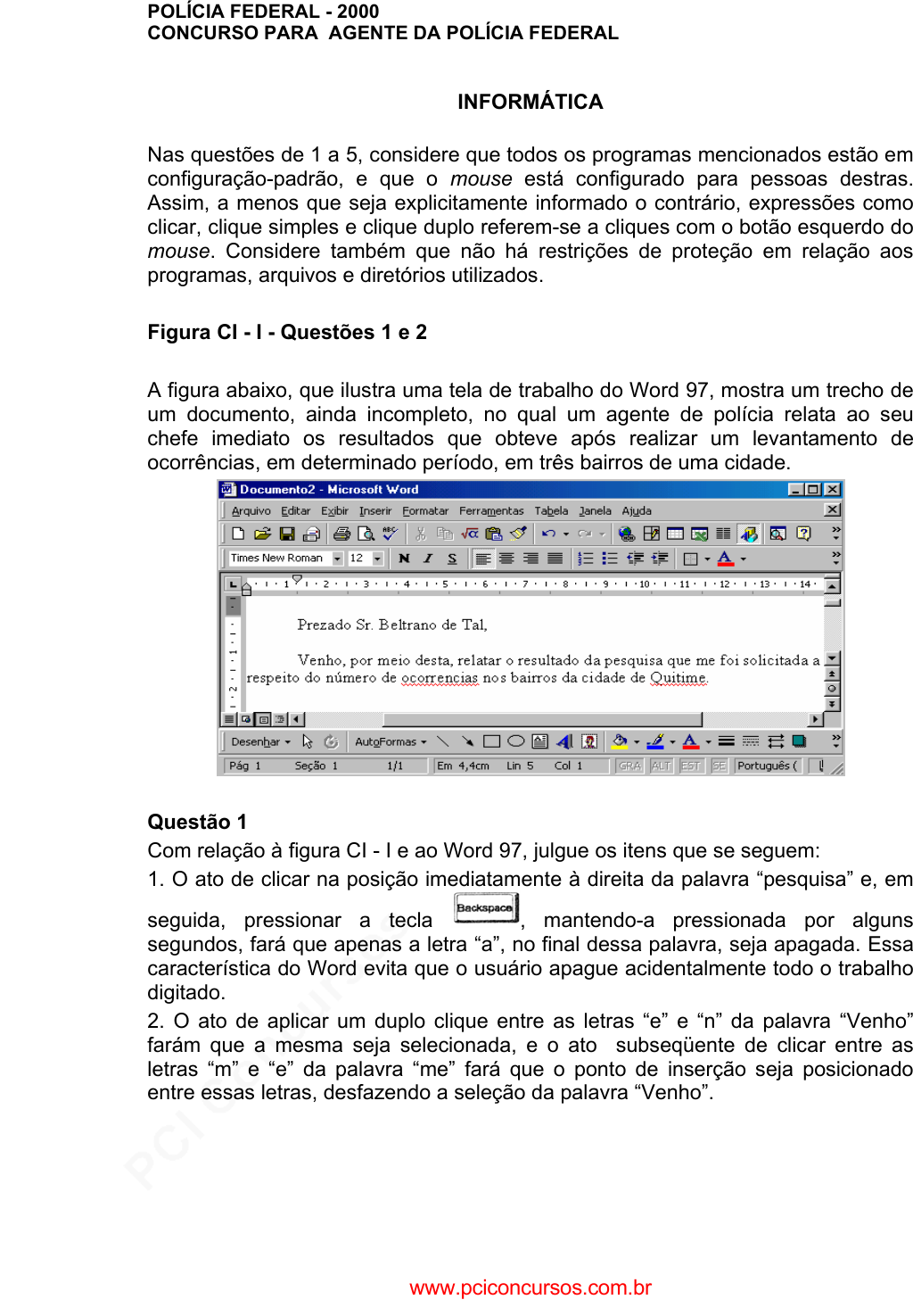 pcimarkpci MjgwNDowMTRjOjAxMzg6ODY2Zjo5MTQyOmEyM2E6NzNmMjphZWM3:VGh1LCAzMSBPY3QgMjAyNCAyMjoyNTozMiAtMDMwMA== www.pciconcursos.com.br POLÍCIA FEDERAL - 2000 CONCURSO PARA AGENTE DA POLÍCIA FEDERAL INFORMÁTICA Nas questões de 1 a 5, considere que todos os programas mencionados estão em configuração-padrão, e que o mouse está configurado para pessoas destras. Assim, a menos que seja explicitamente informado o contrário, expressões como clicar, clique simples e clique duplo referem-se a cliques com o botão esquerdo do mouse. Considere também que não há restrições de proteção em relação aos programas, arquivos e diretórios utilizados. Figura CI - I - Questões 1 e 2 A figura abaixo, que ilustra uma tela de trabalho do Word 97, mostra um trecho de um documento, ainda incompleto, no qual um agente de polícia relata ao seu chefe imediato os resultados que obteve após realizar um levantamento de ocorrências, em determinado período, em três bairros de uma cidade. Questão 1 Com relação à figura CI - I e ao Word 97, julgue os itens que se seguem: 1. O ato de clicar na posição imediatamente à direita da palavra “pesquisa” e, em seguida, pressionar a tecla , mantendo-a pressionada por alguns segundos, fará que apenas a letra “a”, no final dessa palavra, seja apagada. Essa característica do Word evita que o usuário apague acidentalmente todo o trabalho digitado. 2. O ato de aplicar um duplo clique entre as letras “e” e “n” da palavra “Venho” farám que a mesma seja selecionada, e o ato subseqüente de clicar entre as letras “m” e “e” da palavra “me” fará que o ponto de inserção seja posicionado entre essas letras, desfazendo a seleção da palavra “Venho”. www.pciconcursos.com.br pcimarkpci MjgwNDowMTRjOjAxMzg6ODY2Zjo5MTQyOmEyM2E6NzNmMjphZWM3:VGh1LCAzMSBPY3QgMjAyNCAyMjoyNTozMiAtMDMwMA== www.pciconcursos.com.br 3. O parágrafo em que se encontra a palavra “resultado” estará alinhado à esquerda ao final da seguinte seqüência de ações: selecionar a palavra. “resultado”; clicar, sucessivamente, nos botões , , , e de novo, em . 4. O ato de clicar entre as letras “i” e “o” da palavra “meio” e teclar fará que o ponto de inserção seja posicionado no fim do arquivo. 5. Um clique duplo na Barra de Título, sobre a palavra “Tela”, irá maximizar a tela de trabalho mostrando na figura. Questão 2 Quanto à figura CI - I, ao Word 97 e ao Excel 97, julgue os itens seguintes. 1. Para copiar um gráfico de barras criado no Excel 97 para algum ponto do documento mostrado na figuras, é correto executar o seguinte procedimento: no Excel, clicar sobre o gráfico desejado; pressionar a tecla e, mantendo-a pressionada, acionar a tecla ; na barra de tarefas do Windows 95, clicar no botão correspondente ao Word 97; em seguida, no Word, clicar no ponto onde se deseja que o gráfico seja inserido; clicar no menu editar e, finalmente, clicar em copiar. 2. O ato de selecionar a palavra “pesquisa” e clicar em fará que seja aplicada a formatação negrito a essa palavra, e o ato subseqüente de clicar em fará que a palavra seja formatada em itálico, removendo a formatação negrito. 3. O sublinhado ondulado observado na palavra “ocorrências” indica um possível erro gráfico nessa palavra. É possível ocultar esse sublinhado utilizando-se o ícone , na barra de status, localizada na parte inferior da tela de trabalho. Caso esse procedimento não seja adotado antes de se imprimir o texto, o sublinhado ondulado aparecerá na impressão. 4. Para selecionar a palavra “desta”, é correto executar o seguinte procedimento: clicar imediatamente à esquerda da referida palavra, entre o espaço em branco e a letra “d”; pressionar simultaneamente as teclas e e, mantendo ambas pressionadas, teclar . 5. No Word 97, o menu Inserir contém a opção Quebra..., que pode ser usada em uma conseqüência de ações para inserir uma quebra de página no ponto de inserção. Questão 3 Um agente de polícia realizou o levantamento das quantidades de ocorrências de três tipos específicos, em um período de trinta dias, em três bairros de uma cidade. Para isso, ele consultou os registros apropriados, encontrado os dados www.pciconcursos.com.br pcimarkpci MjgwNDowMTRjOjAxMzg6ODY2Zjo5MTQyOmEyM2E6NzNmMjphZWM3:VGh1LCAzMSBPY3QgMjAyNCAyMjoyNTozMiAtMDMwMA== www.pciconcursos.com.br desejados, e os tabulou em uma planilha do Excel 97, mostrado na figura abaixo, para manipulação futura. Com relação a situação hipotética descrita e ao Excel 97, julgue os itens a seguir: 1. Para aumentar o tamanho da fonte usada no conteúdo da célula A2, seria correto o agente executar o seguinte procedimento: clicar na referida célula; alterar o número em para o número que corresponda ao tamanho desejado. 2. A seguinte seqüência de ações descreve um processo completo que levará o agente à criação de um gráfico de barras para visualizar graficamente a incidência de cada tipo de ocorrência nos seguintes bairros: selecionar todas as células da tabela; em seguida, clicar em . 3. Para determinar a média diária de ocorrências do tipo 1 no bairro C, no período considerado, e colocar o resultado na célula E2, seria correto o agente adotar o seguinte procedimento: clicar na célula E2; em seguida, digitar = média (D2:30) e, finalmente, teclar . 4. Para calcular a porcentagem de ocorrências do tipo 1 no bairro C, em relação ao total de ocorrências do mesmo tipo nos três bairros, e colocar o resultado na célula E2, seria correto o agente executar seguinte procedimento: clicar na célula E2; em seguida, digitar = C2/(B2+D2) e teclar ; clicar novamente em E2 e, finalmente, clicar em 5. Os números 160 e 168 aparecerão nas células E3 e E4, respectivamente, se o agente realizar a seguinte seqüência de ações: clicar na célula E3, digitar = B3+C3+D3/2 e teclar ; em seguida, clicar novamente na célula E3, clicar em , clic