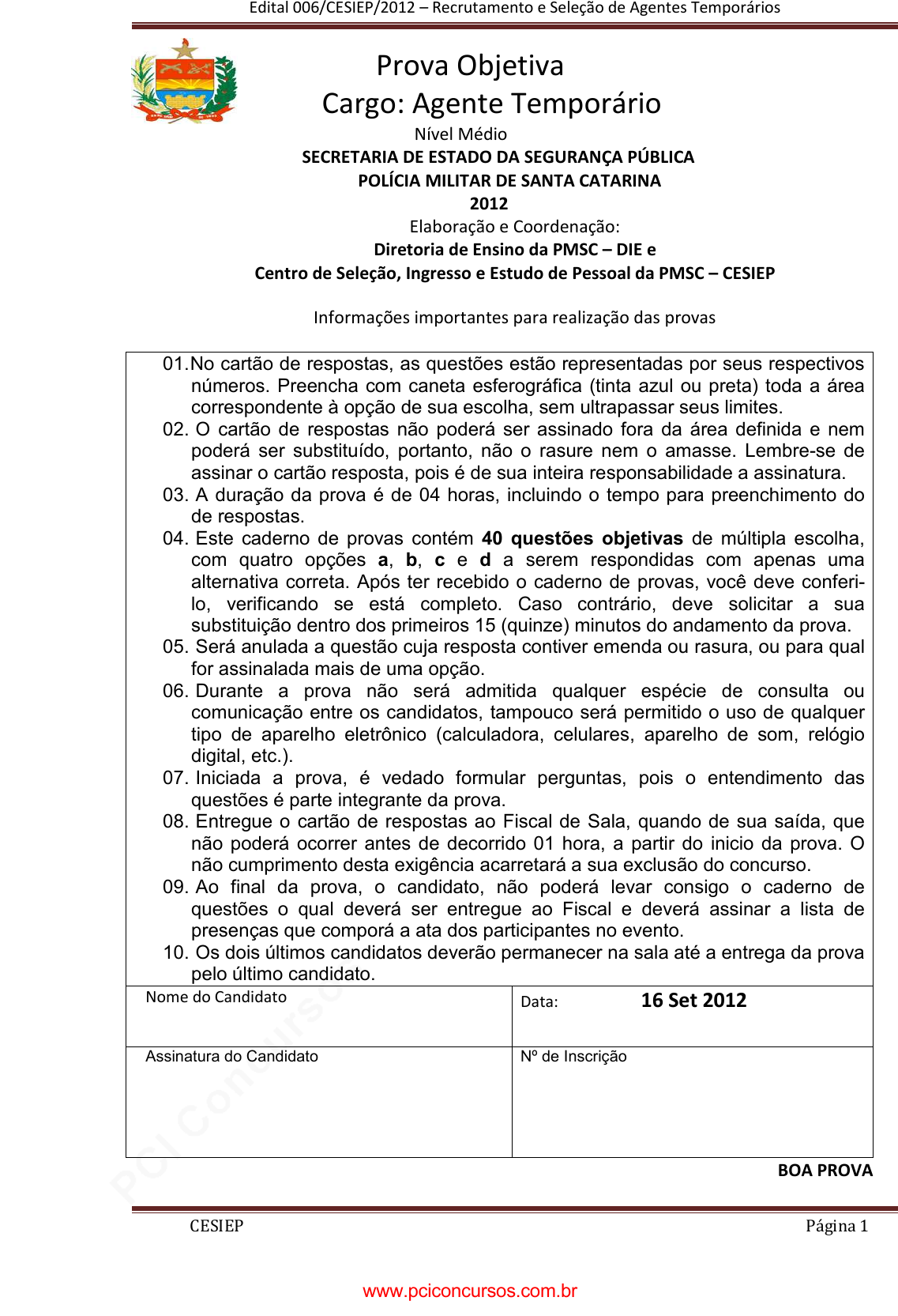 pcimarkpci MjgwNDowMTRjOjAxMzg6ODY2Zjo5MTQyOmEyM2E6NzNmMjphZWM3:VGh1LCAzMSBPY3QgMjAyNCAyMjozNjowOCAtMDMwMA== www.pciconcursos.com.br Edital 006/CESIEP/2012 – Recrutamento e Seleção de Agentes Temporários CESIEP Página 1 Prova Objetiva Cargo: Agente Temporário Nível Médio SECRETARIA DE ESTADO DA SEGURANÇA PÚBLICA POLÍCIA MILITAR DE SANTA CATARINA 2012 Elaboração e Coordenação: Diretoria de Ensino da PMSC – DIE e Centro de Seleção, Ingresso e Estudo de Pessoal da PMSC – CESIEP Informações importantes para realização das provas 01. No cartão de respostas, as questões estão representadas por seus respectivos números. Preencha com caneta esferográfica (tinta azul ou preta) toda a área correspondente à opção de sua escolha, sem ultrapassar seus limites. 02. O cartão de respostas não poderá ser assinado fora da área definida e nem poderá ser substituído, portanto, não o rasure nem o amasse. Lembre-se de assinar o cartão resposta, pois é de sua inteira responsabilidade a assinatura. 03. A duração da prova é de 04 horas, incluindo o tempo para preenchimento do de respostas. 04. Este caderno de provas contém 40 questões objetivas de múltipla escolha, com quatro opções a, b, c e d a serem respondidas com apenas uma alternativa correta. Após ter recebido o caderno de provas, você deve conferi- lo, verificando se está completo. Caso contrário, deve solicitar a sua substituição dentro dos primeiros 15 (quinze) minutos do andamento da prova. 05. Será anulada a questão cuja resposta contiver emenda ou rasura, ou para qual for assinalada mais de uma opção. 06. Durante a prova não será admitida qualquer espécie de consulta ou comunicação entre os candidatos, tampouco será permitido o uso de qualquer tipo de aparelho eletrônico (calculadora, celulares, aparelho de som, relógio digital, etc.). 07. Iniciada a prova, é vedado formular perguntas, pois o entendimento das questões é parte integrante da prova. 08. Entregue o cartão de respostas ao Fiscal de Sala, quando de sua saída, que não poderá ocorrer antes de decorrido 01 hora, a partir do inicio da prova. O não cumprimento desta exigência acarretará a sua exclusão do concurso. 09. Ao final da prova, o candidato, não poderá levar consigo o caderno de questões o qual deverá ser entregue ao Fiscal e deverá assinar a lista de presenças que comporá a ata dos participantes no evento. 10. Os dois últimos candidatos deverão permanecer na sala até a entrega da prova pelo último candidato. Nome do Candidato Data: 16 Set 2012 Assinatura do Candidato Nº de Inscrição BOA PROVA www.pciconcursos.com.br pcimarkpci MjgwNDowMTRjOjAxMzg6ODY2Zjo5MTQyOmEyM2E6NzNmMjphZWM3:VGh1LCAzMSBPY3QgMjAyNCAyMjozNjowOCAtMDMwMA== www.pciconcursos.com.br Edital 006/CESIEP/2012 – Recrutamento e Seleção de Agentes Temporários CESIEP Página 2 POLÍCIA MILITAR DE SANTA CATARINA DIRETORIA DE INSTRUÇÃO E ENSINO DIVISÃO DE ENSINO BÁSICO PROCESSO SELETIVO AO CURSO DE AGENTES TEMPORÁRIOS EDITAL Nº 06/CESIEP/PMSC/2012 AVALIAÇÃO INTELECTUAL – 16SET12 PORTUGUÊS Excerto 1: “Artigo 226 – A família, base da sociedade, tem especial proteção do Estado__ Fundado nos princípios da dignidade da pessoa humana e da paternidade responsável, o planejamento familiar é livre decisão do casal, competindo ao Estado propiciar recursos educacionais e científicos para o exercício desse direito, vedada qualquer forma coercitiva por parte de instituições oficiais ou privadas.” Brasil. Constituição. Brasília: Senado Federal,1988. Excerto 2: “Enquanto se discute a moral da esterilização e de outros métodos anticoncepcionais modernos, estão nascendo quase três milhões de crianças carentes por ano. A não usarmos nossa inteligência e cidadania na luta para que sejam orientados e assistidos todos os casais necessitados de planejamento familiar, só podemos esperar uma reação: a violência.” Disponível em: . Acesso em 30 jul. 2004. Excerto 3: “Na verdade, o Brasil só tem uma saída para se transformar, a médio prazo, num país decente: fazer a economia crescer em ritmo bem maior que o atual e implantar, ao mesmo tempo, um sistema de controle da natalidade que reduza o número de filhos das mulheres pobres, pois são fundamentalmente elas que geram a prole desamparada que mais tarde viverá à margem da sociedade[...] enquanto o país produzir miseráveis em ritmo geométrico, como acontece atualmente, não haverá iniciativas sociais que bastem” [...] MARIANI, Julio. Miséria e Olimpíada. Zero Hora, Porto Alegre, 27 ago. 2004. p. 23. Excerto 4: “O Brasil foi um dos países que, nos últimos anos, mais baixou sua fecundidade. São dados do IBGE, dados públicos, e, no entanto, a pobreza continua, a exclusão social continua, e a miséria continua. Então acho que é um profundo retrocesso que setores sociais, seja lá quem for, ou governamentais reabilitem o debate sobre a pobreza, exclusão social e a violência como uma questão que requer controle da natalidade”[ ...] Trecho de publicação eletrônica da Rede Feminista de Saúde (Rede Nacional Feminista de ARAÚJO, Maria José de Oliveira. Saúde,Direitos Sexuais e Direitos Reprodutivos), abr. 2003. Disponível em http://www.redesaude.org.br/html/body_boletim-01a15abr-2003.html. Acesso em 5 set. 2004. www.pciconcursos.com.br pcimarkpci MjgwNDowMTRjOjAxMzg6ODY2Zjo5MTQyOmEyM2E6NzNmMjphZWM3:VGh1LCAzMSBPY3QgMjAyNCAyMjozNjowOCAtMDMwMA== www.pciconcursos.com.br Edital 006/CESIEP/2012 – Recrutamento e Seleção de Agentes Temporários CESIEP Página 3 Excerto 5: LEI Nº 9263 DE 12 DE JANEIRO DE 1996. “Art. 3º: As instâncias gestoras do Sistema Único de Saúde, em todos os seus níveis, na prestação das ações previstas no caput, obrigam-se a garantir, em toda a sua rede de serviços, no que respeita a atenção à mulher, ao homem ou ao casal, programa de atenção integral à saúde, em todos os seus ciclos vitais” [