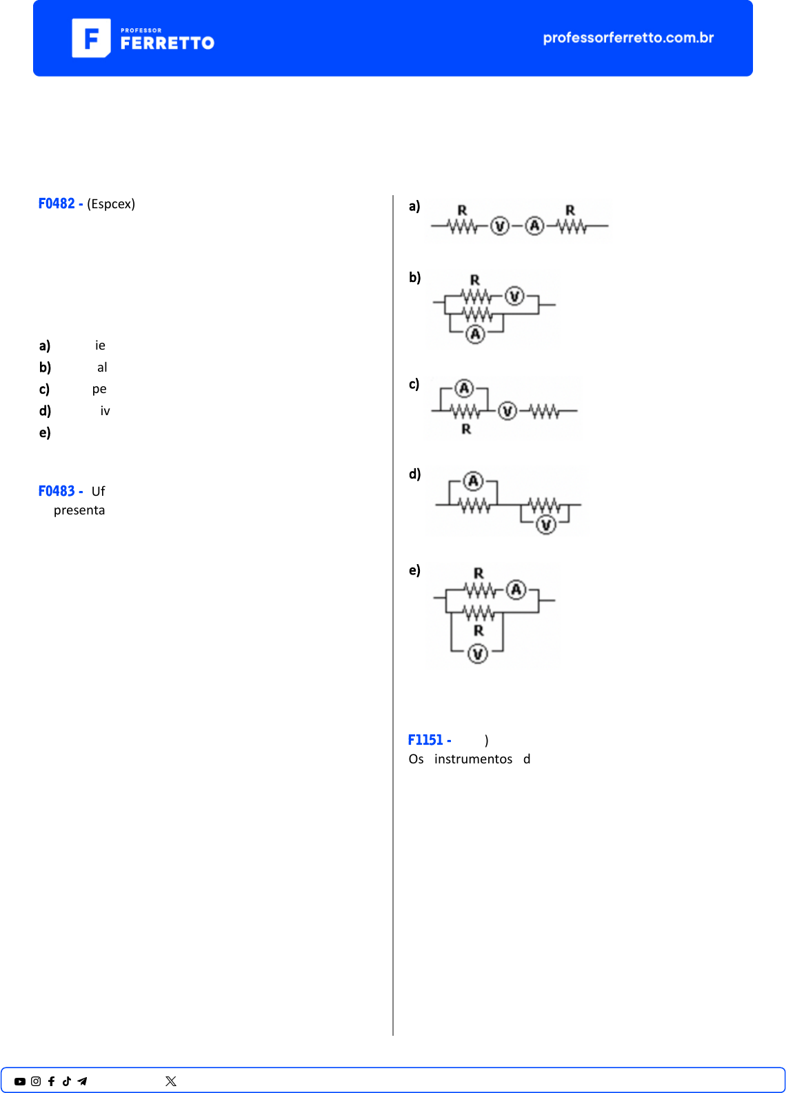Eletrodinâmica Instrumentos F0482 - (Espcex) O amperímetro é um instrumento u�lizado para a medida de intensidade de corrente elétrica em um circuito cons�tuído por geradores, receptores, resistores, etc. A maneira correta de conectar um amperímetro a um trecho do circuito no qual queremos determinar a intensidade da corrente é a) em série b) em paralelo c) na perpendicular d) em equivalente e) mista F0483 - (Ufsm) Representado um amperímetro por - A - e um vol�metro por - V -, o esquema onde aparecem corretamente ligados à respec�va malha é o a) b) c) d) e) F1151 - (Ifsul) Os instrumentos de medidas elétricas que medem corrente elétrica, diferença de potencial elétrico e resistência elétrica são denominados, respec�vamente, amperímetros, vol�metros e ohmímetros. Muitas vezes, eles são reunidos em um único aparelho, denominado mul�metro, o qual tem uma chave que permite selecionar a função desejada. Em relação à forma correta que esses medidores devem ser associados com um resistor em um circuito elétrico, um amperímetro ideal, quando associado 1@professorferretto @prof_ferretto a) em série, mede a corrente elétrica que circula nesse resistor. b) em paralelo, mede a corrente elétrica que circula nesse resistor. c) em série, mede a diferença de potencial elétrico a que o resistor está subme�do. d) em paralelo, mede a diferença de potencial elétrico a que o resistor está subme�do. F1158 - (Ufrgs) Vol�metros e amperímetros são os instrumentos mais usuais para medições elétricas. Evidentemente, para a obtenção de medidas corretas, esses instrumentos devem ser conectados de maneira adequada. Além disso, podem ser danificados se forem conectados de forma incorreta ao circuito. Suponha que se deseja medir a diferença de potencial a que está subme�do o resistor R2 do circuito a seguir, bem como a corrente elétrica que o percorre. Assinale a figura que representa a correta conexão do vol�metro (V) e do amperímetro (A) ao circuito para a realização das medidas desejadas. a) b) c) d) e) F1160 - (Pucmg) Leia atentamente as afirma�vas abaixo. I. Para se medir a queda de potencial em um resistor, deve-se colocar o amperímetro em paralelo com o resistor. II. Para se medir a corrente através de um resistor, deve- se colocar o vol�metro em paralelo com o resistor. III. Para se medir a corrente através de um resistor, deve- se colocar o amperímetro em série com o resistor. Assinale: a) se apenas a afirma�va I é correta. b) se apenas a afirma�va II é correta. c) se apenas a afirma�va III é correta. d) se as afirma�vas I e III são corretas. F0484 - (Upf) Em uma aula no laboratório de Física, o professor solicita aos alunos que meçam o valor da resistência elétrica de um resistor u�lizando um vol�metro ideal e um amperímetro ideal. Dos esquemas abaixo, que representam arranjos experimentais, qual o mais indicado para a realização dessa medição? 2@professorferretto @prof_ferretto a) b) c) d) e) F1157 - (Pucrj) Calcule a corrente em ampères medida no amperímetro (A) do circuito apresentado na figura. a) 1,6 b) 3,3 c) 5,0 d) 8,3 e) 20,0 F0485 - (Pucrj) O arranjo de resistores da figura se chama Ponte de Wheatstone. Escolhendo o resistor R adequadamente, podemos fazer com que não passe nenhuma corrente no resistor de resistência 5,0 Ω. Determine, em Ω, qual é o valor da resistência de R para que a corrente no resistor de 5,0 Ω seja nula. a) 2,0 b) 3,0 c) 4,0 d) 5,0 e) 6,0 F0481 - (Esc. Naval) Considere que um determinado estudante, u�lizando resistores disponíveis no laboratório de sua escola, montou os circuitos apresentados abaixo: 3@professorferretto @prof_ferretto Querendo fazer algumas medidas elétricas, usou um vol�metro (V) para medir a tensão e um amperímetro (A) para medir a intensidade da corrente elétrica. Considerando todos os elementos envolvidos como sendo ideais, os valores medidos pelo vol�metro (situação 1) e pelo amperímetro (situação 2) foram, respec�vamente: a) 2V e 1,2A b) 4V e 1,2A c) 2V e 2,4A d) 4V e 2,4A e) 6V e 1,2A F1163 - (Uece) Um barbeador elétrico, cujos dados nominais são 120V e 8W, deve ser usado em uma tomada disponível de 240V. Para não danificar o aparelho, deve ser instalada em série com este barbeador uma resistência cujo valor, em ohms, é: a) 1800 b) 1200 c) 900 d) 600 F1161 - (Uel) Sobre o funcionamento de vol�metros e o funcionamento de amperímetros, assinale a alterna�va correta: a) A resistência elétrica interna de um vol�metro deve ser muito pequena para que, quando ligado em paralelo às resistências elétricas de um circuito, não altere a tensão elétrica que se deseja medir. b) A resistência elétrica interna de um vol�metro deve ser muito alta para que, quando ligado em série às resistências elétricas de um circuito, não altere a tensão elétrica que se deseja medir. c) A resistência elétrica interna de um amperímetro deve ser muito pequena para que, quando ligado em paralelo às resistências elétricas de um circuito, não altere a intensidade de corrente elétrica que se deseja medir. d) A resistência elétrica interna de um amperímetro deve ser muito pequena para que, quando ligado em série às resistências elétricas de um circuito, não altere a intensidade de corrente elétrica que se deseja medir. e) A resistência elétrica interna de um amperímetro deve ser muito alta para que, quando ligado em série às resistências elétricas de um circuito, não altere a intensidade de corrente elétrica que se deseja medir. F1276 - (Enem) Uma pessoa percebe que a bateria de seu veículo fica descarregada após cinco dias sem uso. No início desse período, a bateria funcionava normalmente e estava com o total de sua carga nominal, de 60 Ah. Pensando na possibilidade de haver uma corrente de fuga, que se estabelece mesmo com os disposi�vos elétricos do veículo desligados, ele associa um am