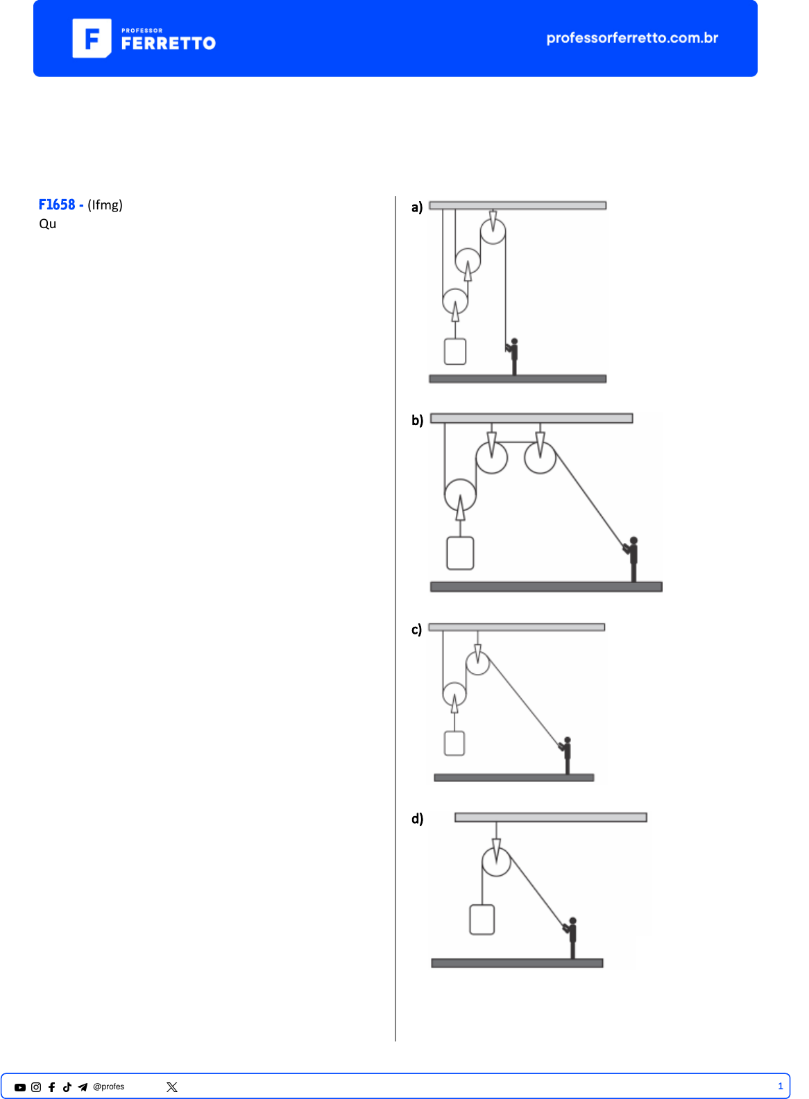 Dinâmica Roldanas F1658 - (Ifmg) Quatro funcionários de uma empresa receberam a tarefa de guardar caixas pesadas de 100 kg em prateleiras elevadas de um depósito. Como nenhum deles conseguiria suspender sozinho pesos tão grandes, cada um resolveu montar um sistema de roldanas para a tarefa. O disposi�vo que exigiu menos força do operário que o montou, foi a) b) c) d) 1@professorferretto @prof_ferretto F1681 - (Unesp) Observe a �rinha Uma garota de 50 kg está em um elevador sobre uma balança calibrada em newtons. O elevador move-se ver�calmente, com aceleração para cima na subida e com aceleração para baixo na descida. O módulo da aceleração é constante e igual a 2 m/s2 em ambas situações. Considerando g = 10 m/s2, a diferença, em newtons, entre o peso aparente da garota, indicado na balança, quando o elevador sobe e quando o elevador desce, é igual a a) 50. b) 100. c) 150. d) 200. e) 250. F1655 - (Fgv) (Adaptado) Dois trabalhadores, (A) e (B), erguem um bloco de massa M a uma altura h do solo. Cada um desenvolve um arranjo diferente de roldanas. Outros trabalhadores começam uma discussão a respeito do que observam e se dividem segundo as ideias: I - O trabalhador (A) exerce a mesma força que o trabalhador (B). II - O trabalhador (B) irá puxar mais corda que o trabalhador (A). III - Não importa o arranjo, em ambos os casos os trabalhadores puxarão a corda com a mesma tensão. A alterna�va correta é: a) Apenas II está correta b) I e II estão corretas c) Apenas III está errada d) Apenas I e III estão corretas e) Somente I está correta F1656 - (Ifce) A figura a seguir mostra um peso de 500 N sustentado por uma pessoa que aplica uma força F, auxiliada pelo sistema de roldanas de pesos desprezíveis e sem atrito. O valor do módulo da força F, que mantém o sistema em equilíbrio, vale, em newtons: 2@professorferretto @prof_ferretto a) 50 b) 500 c) 1000 d) 25 e) 250 F1663 - (Ifce) Na figura a seguir, temos uma combinação de roldanas móveis e fixas, cons�tuindo uma talha exponencial. A força de ação (FA), a ser aplicada para erguer e manter em equilíbrio uma força de resistência (FR) de 500 kgf, será de: a) 125 kgf b) 250 kgf c) 62,5 kgf d) 100 kgf e) 50 kgf F0567 - (Pucmg) Na montagem experimental ilustrada a seguir, os fios e a polia têm massas desprezíveis e pode-se desconsiderar o atrito no eixo da polia. Considere g = 10m/s2 Nessas condições, é CORRETO afirmar: a) Os corpos movem-se com velocidade constante. b) A tensão no fio é de 30 N. c) A força do conjunto sobre a haste de sustentação é de 50 N. d) A aceleração dos corpos é de 5,0 m/s2. F1680 - (Upf) (Adaptado) Um homem de massa 70 kg está apoiado numa balança calibrada em newtons no interior de um elevador que desce à razão de 2 m/s2. Considerando g = 10 m/s2, pode-se afirmar que a intensidade da força indicada pela balança será, em newtons, de: a) 560 b) 840 c) 700 d) 140 e) 480 F1678 - (Ufal) Um bloco de peso igual a 50 N, encontra-se sobre uma balança no piso de um elevador. Se o elevador sobe com aceleração igual, em módulo, à metade da aceleração da gravidade local, pode-se afirmar que: a) A leitura da balança será de 25 N. b) A leitura da balança permanecerá inalterada. c) A leitura da balança será de 75 N. d) A leitura da balança será de 100 N. e) A leitura da balança será de 200 N. F0570 - (Pucrs) Responder à questão com base na figura, na qual R1 representa uma roldana móvel, R2 uma roldana fixa e o 3@professorferretto @prof_ferretto sistema está em repouso. As massas das cordas e das roldanas, bem como os atritos, são desprezíveis. A relação entre as massas m1 e m2 é a) m1 = m2 b) m1 = 2m2 c) m1 = 3m2 d) m2 = 2m1 e) m2 = 3m1 F1659 - (Acafe) Um homem queria derrubar uma árvore que estava inclinada e oferecia perigo de cair em cima de sua casa. Para isso, com a ajuda de um amigo, preparou um sistema de roldanas preso a outra árvore para segurar a árvore que seria derrubada, a fim de puxá-la para o lado oposto de sua suposta queda, conforme figura. Sabendo que para segurar a árvore em sua posição o homem fez uma força de 1.000 N sobre a corda, a força aplicada pela corda na árvore que seria derrubada é: a) 2.000 N. b) 1.000 N. c) 500 N. d) 4.000 N. F1661 - (U�f) Doutor Botelho quer instalar um portão elétrico na garagem de sua casa. O sistema é composto de um contrapeso preso à extremidade de um cabo de aço de massa desprezível, que passa por uma polia, de massa também desprezível. A outra extremidade do cabo de aço é presa ao portão, como mostrado na figura. Sabendo-se que o portão possui uma massa de 100,0 kg, qual deve ser a massa do contrapeso para que o portão suba com aceleração igual a 0,1 g, sendo g a aceleração da gravidade? Desconsidere qualquer outra força externa realizada pelo motor do portão. a) 81,8 kg b) 122,2 kg c) 61,0 kg d) 163,6 kg e) 127,5 kg F1673 - (Ifsul) Uma pessoa de massa igual a 65 kg está dentro de um elevador, inicialmente parado, que começa a descer. Durante um curto intervalo de tempo, o elevador sofre uma aceleração para baixo de módulo igual a 2 m/s2. Considerando-se a aceleração gravitacional no local igual a 10 m/s2, durante o tempo em que o elevador acelera a força normal exercida pelo piso do elevador na pessoa é igual a 4@professorferretto @prof_ferretto a) 520 N. b) 650 N. c) 780 N. d) zero. F1676 - (Uerj) Um passageiro está no interior de um elevador que desce ver�calmente, com aceleração constante "a". Se "a" vale 1/5 da aceleração da gravidade, a razão entre a intensidade da força que o piso do elevador exerce sobre o passageiro e o peso do passageiro é igual a: a) 5 b) 6/5 c) 1 d) 4/5 F1679 - (Uece) Um elevador parte do repouso com uma aceleração constante para cima com relação ao solo. Esse elevador sobe 2,0 m no primeiro segundo. Um morador que se encontra no elevador está segurando um pacote de 3 kg por meio de uma corda ver