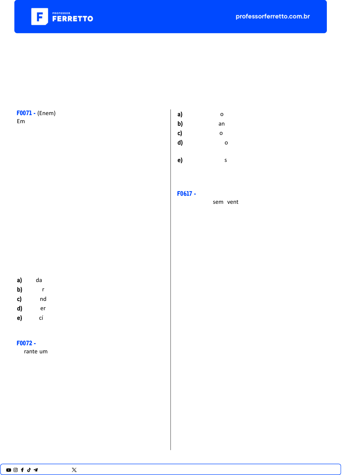 ENEM Dinâmica Leis de Newton F0071 - (Enem) Em 1543, Nicolau Copérnico publicou um livro revolucionário em que propunha a Terra girando em torno do seu próprio eixo e rodando em torno do Sol. Isso contraria a concepção aristotélica, que acredita que a Terra é o centro do universo. Para os aristotélicos, se a Terra gira do oeste para o leste, coisas como nuvens e pássaros, que não estão presas à Terra, pareceriam estar sempre se movendo do leste para o oeste, justamente como o Sol. Mas foi Galileu Galilei que, em 1632, baseando-se em experiências, rebateu a crí�ca aristotélica, confirmando assim o sistema de Copérnico. Seu argumento, adaptado para a nossa época, é se uma pessoa, dentro de um vagão de trem em repouso, solta uma bola, ela cai junto a seus pés. Mas se o vagão es�ver se movendo com velocidade constante, a bola também cai junto a seus pés. Isto porque a bola, enquanto cai, con�nua a compar�lhar do movimento do vagão. O princípio �sico usado por Galileu para rebater o argumento aristotélico foi a) a lei da inércia. b) ação e reação. c) a segunda lei de Newton. d) a conservação da energia. e) o princípio da equivalência. F0072 - (Enem) Durante uma faxina, a mãe pediu que o filho a ajudasse, deslocando um móvel para mudá-lo de lugar. Para escapar da tarefa, o filho disse ter aprendido na escola que não poderia puxar o móvel, pois a Terceira Lei de Newton define que se puxar o móvel, o móvel o puxará igualmente de volta, e assim não conseguirá exercer uma força que possa colocá-lo em movimento. Qual argumento a mãe u�lizará para apontar o erro de interpretação do garoto? a) A força de ação é aquela exercida pelo garoto. b) A força resultante sobre o móvel é sempre nula. c) As forças que o chão exerce sobre o garoto se anulam. d) A força de ação é um pouco maior que a força de reação. e) O par de forças de ação e reação não atua em um mesmo corpo. F0617 - (Enem) Em um dia sem vento, ao saltar de um avião, um paraquedista cai ver�calmente até a�ngir a velocidade limite. No instante em que o paraquedas é aberto (instante TA), ocorre a diminuição de sua velocidade de queda. Algum tempo após a abertura do paraquedas, ele passa a ter velocidade de queda constante, que possibilita sua aterrissagem em segurança. Que gráfico representa a força resultante sobre o paraquedista, durante o seu movimento de queda? 1@professorferretto @prof_ferretto a) b) c) d) e) F0527 - (Enem) Em desenhos animados é comum vermos a personagem tentando impulsionar um barco soprando ar contra a vela para compensar a falta de vento. Algumas vezes usam o próprio fôlego, foles ou ven�ladores. Estudantes de um laboratório didá�co resolveram inves�gar essa possibilidade. Para isso, usaram dois pequenos carros de plás�co. A e B, instalaram sobre estes pequenas ventoinhas e fixaram ver�calmente uma cartolina de curvatura parabólica para desempenhar uma função análoga à vela de um barco. No carro B inverteu-se o sen�do da ventoinha e manteve-se a vela, a fim de manter as caracterís�cas do barco, massa e formato da cartolina. As figuras representam os carros produzidos. A montagem do carro A busca simular a situação dos desenhos animados, pois a ventoinha está direcionada para a vela. Com os carros orientados de acordo com as figuras, os estudantes ligaram as ventoinhas, aguardaram o fluxo de ar ficar permanente e determinaram os módulos das velocidades médias dos carros A (VA) e B (VB) para o mesmo intervalo de tempo. A respeito das intensidades das velocidades médias e do sen�do de movimento do carro A, os estudantes observaram que: a) VA = 0; VB > 0; o carro A não se move. b) 0