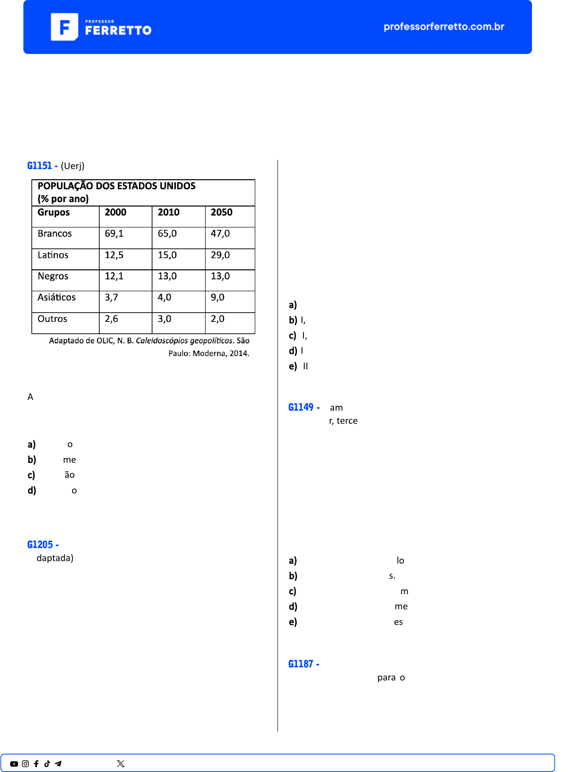 Vestibulares América G1151 - (Uerj) A par�r da análise da tabela, uma importante mudança em processo na demografia estadunidense e a respec�va causa associada ao grupo populacional a�ngido são: a) redução de brancos − alta taxa de mortalidade b) crescimento de negros − diminuição da emigração c) elevação de la�nos − maiores índices de imigração d) aumento de asiá�cos − grande con�ngente de refugiados G1205 - (Uepg) (Adaptada) Sobre problemas econômicos e sociais na América la�na, leia as proposições a seguir: I) O narcotráfico é um grave fator desestabilizador da estrutura econômica e social dos países la�no- americanos, afetando a qualidade de vida das pessoas, aumentando a violência e a insegurança. II) As dívidas externas e internas das economias la�no- americanas têm um baixo custo e, o que seria gasto no pagamento das mesmas, tem sido u�lizado para melhorar o bem-estar das populações. III) Apesar da redução da pobreza absoluta, Brasil, México e Equador não conseguiram avanços na distribuição de renda entre toda a população. IV) O desemprego é um item que não preocupa os governos dos países la�no-americanos, pois os índices são os mais baixos do mundo. V) A região concentra quase toda a produção mundial de coca, a base para obtenção da cocaína, e as áreas de maior produção estão na Colômbia, Peru e Bolívia. Estão CORRETAS apenas as proposições: a) I, II e III. b) I, III e V. c) II, III e IV. d) II, IV e V. e) III, IV e V. G1149 - (Famerp) A Embraer, terceira maior fabricante de aviões comerciais do mundo, anunciou que vai estabelecer equipes no Vale do Silício, nos Estados Unidos. A Embraer não é a primeira fabricante de aviões a se estabelecer nessa região. Em 2015, a Airbus contratou um ex-execu�vo do Google para dirigir seus negócios no Vale do Silício. (h�ps://economia.uol.com.br, 14.03.2017. Adaptado.) O Vale do Silício, importante cenário produ�vo mundial, destaca- se por concentrar a) empresas de alta tecnologia. b) indústrias siderúrgicas. c) empresas de tecnologia militar. d) indústrias de monitoramento por radar. e) agências de pesquisas espaciais. G1187 - (Espm) Com o foco voltado para o petróleo e usando parte do dinheiro arrecadado com as exportações do combus�vel para sus tentar programas sociais, não se preocupou com o desenvolvimento agrícola e industrial do país. 1@professorferretto @prof_ferretto Fonte: h�ps://www.bbc.com/portuguese/internacio nal- 45909515. Acesso: 22/11/2019. O texto retrata a grave crise econômica pela qual está passando a(o): a) Argen�na. b) Venezuela. c) Chile. d) Brasil. e) Uruguai. G1180 - (Uepg) (Adaptada) Sobre problemas econômicos e sociais na América la�na, leia as proposições a seguir: I) O narcotráfico é um grave fator desestabilizador da estrutura econômica e social dos países la�no- americanos, afetando a qualidade de vida das pessoas, aumentando a violência e a insegurança. II) As dívidas externas e internas das economias la�no- americanas têm um baixo custo e, o que seria gasto no pagamento das mesmas, tem sido u�lizado para melhorar o bem-estar das populações. III) Apesar da redução da pobreza absoluta, Brasil, México e Equador não conseguiram avanços na distribuição de renda entre toda a população. IV) O desemprego é um item que não preocupa os governos dos países la�no-americanos, pois os índices são os mais baixos do mundo. V) A região concentra quase toda a produção mundial de coca, a base para obtenção da cocaína, e as áreas de maior produção estão na Colômbia, Peru e Bolívia. Estão CORRETAS apenas as proposições: a) I, II e III. b) II, IV e V. c) I, III e V. d) III, IV e V. e) I, II e IV. G1202 - (Famema) O diagnós�co é do economista Víctor Álvarez, ex-ministro de Indústrias Básicas do governo Hugo Chávez: “A crise econômica, social e polí�ca que está sofrendo o país neste momento é uma nova expressão de esgotamento de um modelo que se impôs na Venezuela há mais de um século”. www.cartacapital.com.br. Adaptado. Considerando o cenário econômico e geopolí�co da Venezuela, é correto afirmar que o modelo citado no excerto se baseia a) no extra�vismo mineral, com a intensa exploração de petróleo. b) na industrialização nacional, com a total subs�tuição das importações. c) no extra�vismo vegetal, com a valorização das especificidades gené�cas da região. d) na inovação industrial, com o financiamento de polos de pesquisa avançada. e) na agricultura de exportação, com o compromisso de abastecer os países la�nos. G1176 - (Ufpr) “No período de 2009 a 2014, a economia de Cuba apresentou baixo crescimento do PIB e do PIB per capita, além de déficit fiscal em quase todos os anos. São evidências de uma profunda crise estrutural ocasionada por deficiências internas e influências externas que limitam fortemente o desempenho da economia, o desenvolvimento e a melhora da qualidade de vida da população” (Rodríguez, 2016). Sobre Cuba, levando em consideração os dados apresentados e os conhecimentos de geografia, é correto afirmar: a) A crise mundial iniciada em 2008 estancou o processo de desenvolvimento acelerado que a economia cubana vinha alcançando desde 1992, quando o fim da URSS livrou Cuba da interferência sovié�ca. b) O baixo ritmo de crescimento do PIB é compensado pelas polí�cas de distribuição de renda adotadas no país, que contribuem para elevar a renda média da população. c) A par�cipação popular na elaboração e execução de polí�cas públicas é um dos fatores estruturais responsáveis pelo déficit fiscal persistente, na medida em que pressiona os gastos sociais para cima. d) A crise internacional de 2008, o bloqueio econômico dos EUA e as deficiências do modelo de economia planificada são fatores externos e internos que contribuem para o baixo dinamismo e