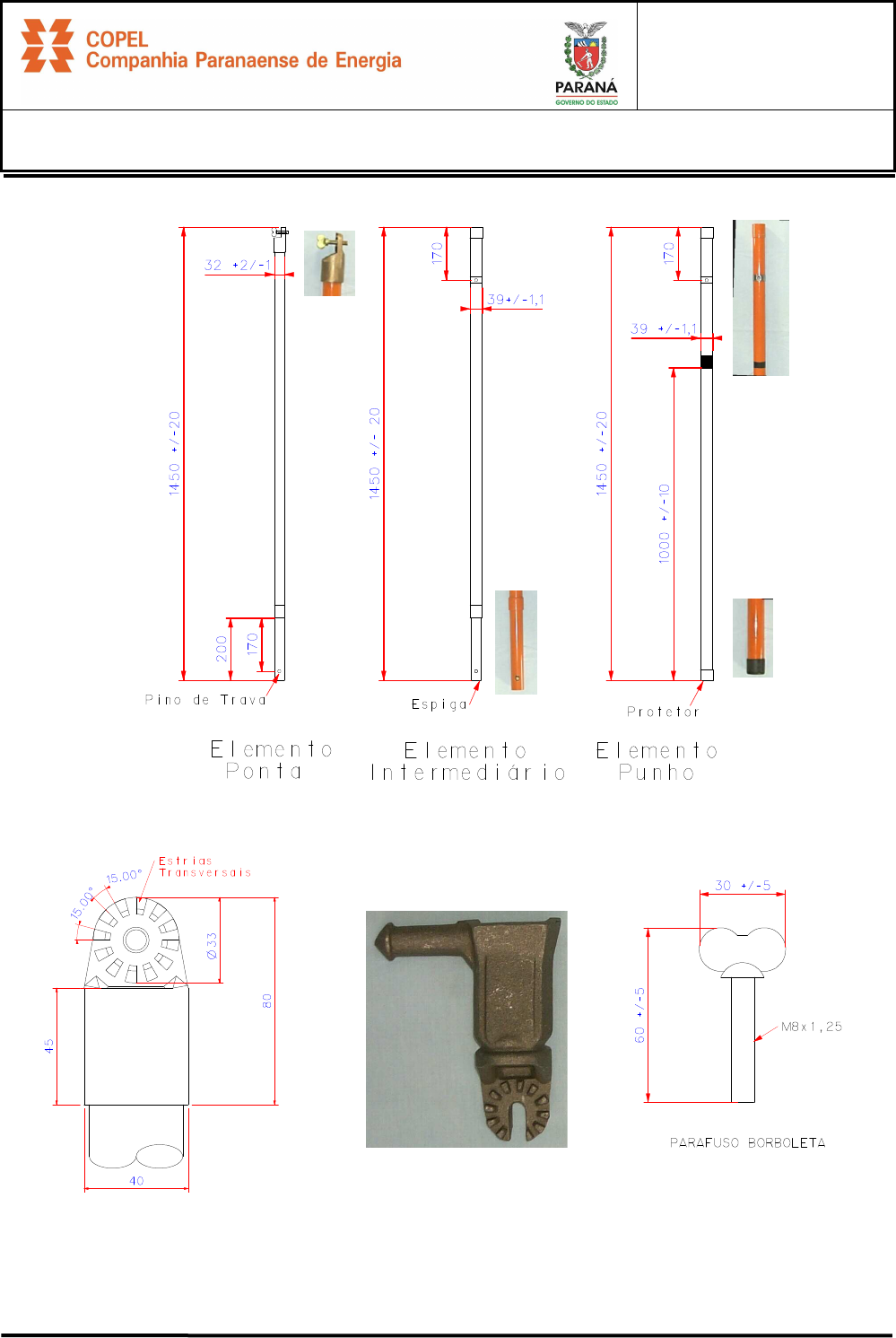 NTC 890585 Ferramentas de Rede de Distribuição VARA DE MANOBRA NOVEMBRO/2014 SEE/DPRD/VPON Volume Especi al Página 1 de 7 Fig. 01 - Medidas em milímetros - Tolerância de +/- 5% Cabeçote de vara de manobra para operação de chave-fusível NTC 890091 Fig.03 Parafuso para fixação do cabeçote ao encaixe Fig.04 Encaixe universal com furo para parafuso borboleta de 8 mm Fig.02 NTC 890585 Ferramentas de Rede de Distribuição VARA DE MANOBRA NOVEMBRO/2014 SEE/DPRD/VPON Volume Especi al Página 2 de 7 Tabela 01 NTC CÓDIGO N. DE ELEMENTOS COMPRIMENTO (mm) PESO MAX. (kg) 890585 15018449 4 (1 PONTA, 2 INTERMEDIÁRIOS E 1 PUNHO) 5200 +/- 80 5 1. DEFINIÇÕES Para os efeitos desta especificação são adotados os seguintes componentes e definições: 1.1 Vara de Manobra É uma ferramenta manual, confeccionada de material isolante, de comprimento suficientemente longo para que, através de uma força aplicada numa das extremidades permite a operação à distância de equipamento. 1.2 Corpo da Vara de Manobra São as seções modulares, constituindo-se de um elemento de ponta, um ou dois elementos intermediários e um elemento punho. 1.3 Elemento Ponta É a parte superior da vara de manobra onde é fixado o cabeçote universal. 1.4 Elemento Intermediário É a parte central da vara de manobra podendo ser constituída de um ou dois elementos, dependendo do comprimento desejado. 1.5 Elemento Punho É a parte inferior da vara de manobra, contendo uma área delimitada para o seu manuseio. 1.6 Enchimento Material sintético destinado a recompor o interior do bastão e evitar acúmulo de poeira e umidade. 1.7 Espiga Parte de menor diâmetro dos elementos de ponta e intermediários destinados a permitir a conexão do elemento adjacente com auxilio dos pinos de engate. 1.8 Receptáculo Parte oca dos elementos de punho e intermediário, destinada a receber a espiga, permitindo uma perfeita conexão entre as seções adjacentes. 1.9 Protetor Peça destinada a proteger a extremidade inferior do elemento de punho contra impactos ou desgastes prematuros. 1.10 Pino de Engate Peça de pressão situada na espiga destinada a evitar qualquer movimento entre elementos da vara de manobra no sentido longitudinal ou giratório. 1.11 Orifício de Encaixe Parte vazada circular, destinada a receber os pinos de engate. NTC 890585 Ferramentas de Rede de Distribuição VARA DE MANOBRA NOVEMBRO/2014 SEE/DPRD/VPON Volume Especi al Página 3 de 7 1.12 Anéis de Reforço Peças fixadas nos elementos de punho e intermediários destinados a reforçarem as furações das varas de manobra para alojamento dos engates. 1.13 Cabeçote Universal Peça fixada na extremidade do elemento ponta, destinada a receber através das estrias do tipo Universal, os respectivos acessórios. 1.14 Parafuso Borboleta Parafuso destinado a permitir o aperto dos acessórios ao cabeçote universal. 1.15 Estrias do tipo Universal Ranhuras com dimensões padronizadas, destinadas a garantir o perfeito acoplamento entre o cabeçote universal e os acessórios de manobra, em posições variadas. 1.16 Cabeçote para vara de manobra Peça complementar para operação da chave-fusível, figura 03 e NTC 890091. 1.17 Sacola de Proteção Sacola para acondicionamento, proteção e transporte conforme NTC 890494 2. CONDIÇÕES GERAIS 2.1 Tipo de Vara de Manobra A vara de manobra aqui especificada é do tipo e quatro elementos. 2.2 Peso A vara de manobra de 4 elementos deve ter peso inferior a 5 kg desconsiderando o cabeçote para chave-fusível. 2.3 Dimensões Devem obedecer as medidas constantes na tabela 1 e nas figura 1, 2 e 4. 2.4 Acabamento As partes metálicas dos elementos da vara de manobra devem ser lisas, isentas de rebarbas, incrustações, trincas, empenamentos ou outras defeitos que possam afetar o desempenha da ferramenta. Os elementos componentes da vara de manobra devem ter seus corpos retos, lisos, uniformes no diâmetro e extensão, limpos, isentos de bolhas, lascas, fendas e irregularidades, cavidades e/ou saliências e serem revestidas por uma camada de verniz protetor compatível com os requisitos dielétricos de modo a oferecer resistência adequada à penetração de umidade e ação do tempo. A cor dos elementos deve ser na tonalidade alaranjada ou avermelhada. 2.5 Identificação Cada vara de manobra fornecida deve ter na superfície do cabeçote universal, impresso em baixo relevo, e nos demais elementos da vara de forma indelével, o nome do fabricante ou marca comercial, a data com mês e ano de fabricação. NTC 890585 Ferramentas de Rede de Distribuição VARA DE MANOBRA NOVEMBRO/2014 SEE/DPRD/VPON Volume Especi al Página 4 de 7 3. CONDIÇÕES ESPECIFÍCAS 3.1 Material 3.1.1 Corpo da Vara de Manobra Os elementos devem ser confeccionados em fibra de vidro, impregnados com resina do tipo epoxi de alta resistência mecânica e elétrica e totalmente guarnecido internamente com, espuma de poliuretano para evitar absorção de umidade. 3.1.2 Pinos de Engate e Mola Os pinos devem ser confeccionados em latão e a mola de aço. 3.1.3 Protetor Deve ser de borracha ou material/plástico de alta resistência, tendo 50 mm de comprimento, 38 mm de diâmetro interno e 2 mm de espessura, aproximadamente. 3.1.4 Parafusos Borboleta e Arruelas Devem ser de aço com tratamento superficial por processo eletrolítico. 3.1.5 Anéis de reforço Devem ser de aço inoxidável 3.1.6 Cabeçote Universal Deve ser confeccionado em liga de bronze ou de alumínio. 3.1.7 Cabeçote para vara de manobra Deve ser confeccionado em liga de bronze conforme NTC 890091, figura 03. 3.2 Características Construtivas Os elementos da vara de manobra devem ter as dimensões de acordo com o indicado na Figura 1. Os elementos devem ser encaixados uns aos outros através da espiga do receptáculo e do engate no orifício de encaixe de forma rápida, precisa e suave, sem apresentar folgas que possam comprometer o correto encaixe dos elementos. A vara de manobra não deve apresent