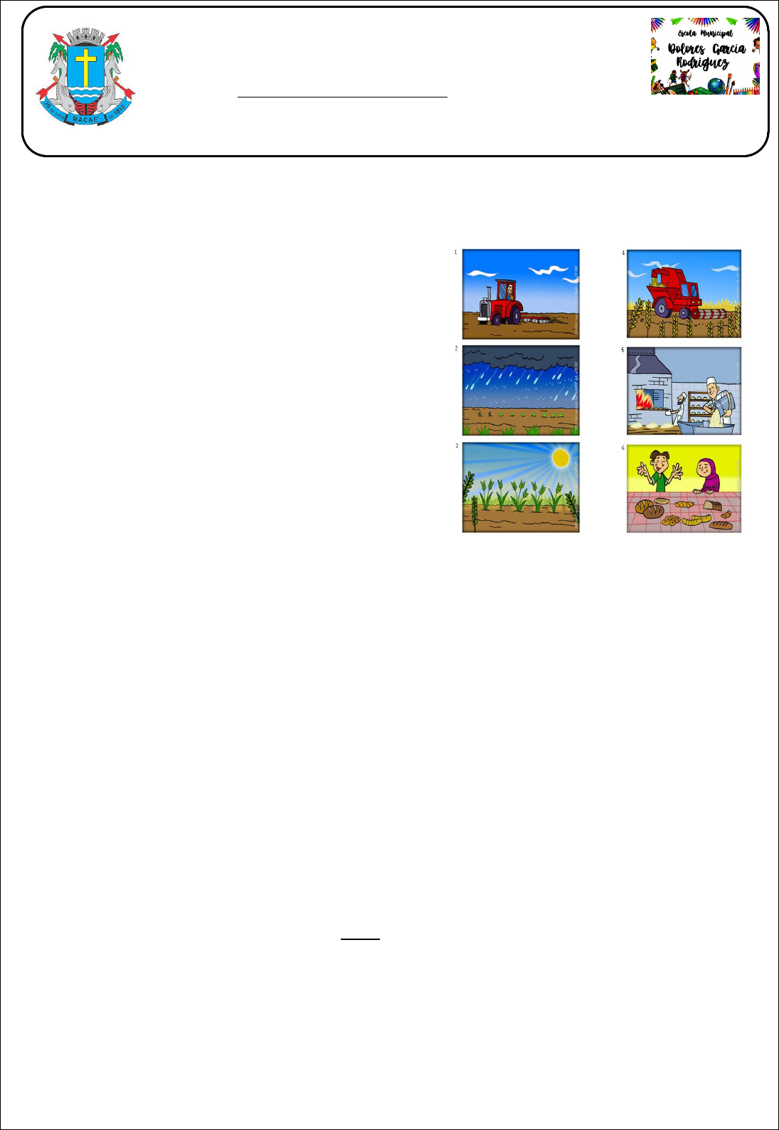 REVISÃO AVALIAÇÃO HISTÓRIA E GEOGRAFIA 4º BIMESTRE 1) Observe a imagem e numere corretamente as etapas de produção que o pão passa até chegar em nossas mesas. ( ) Com a iluminação do Sol, o trigo continua se desenvolvendo. ( ) Com o tempo, o grão de trigo recebe chuva necessária e começa a crescer. ( ) Na época certa, é utilizada máquinas para colheita do trigo. ( ) Depois de ser triturado e transformado em farinha, essa farinha é usada na produção do pão. ( ) O maquinário é utilizado para plantar o grão de trigo. ( ) O pão é comercializado e chega as nossas mesas. 2) Cite TRÊS alimentos: A) In natura: ____________________________________________________________________________ B) Industrializados:_______________________________________________________________________ 3) Por que é importante consumir mais alimentos in natura do que industrializados? _____________________________________________________________________________________ ____________________________________________________________________________________ ____________________________________________________________________________________ 4) Cite dois objetos feito de madeira: a) na sua escola: ________________________________________________________________________ b) na sua casa:__________________________________________________________________________ 5) Qual é a consequência da retirada de forma ilegal de árvores para produção de objetos: ( ) Causa a destruição das florestas, prejudicando o meio ambiente. ( ) Não provoca nenhum dando as florestas e nem ao meio ambiente. Escola Municipal Dolores Garcia Rodriguez. Macaé, _____de________________2024. Professora: Renata dos S.L.de Santana Turma: __________ Aluno (a):______________________________________________ 6) Cite DUAS atitudes que podemos ter para diminuir o uso de plásticos. 1______________________________________________________________________________________ 2______________________________________________________________________________________ 7) Onde podemos encontrar a água na natureza? _______________________________________________________________________________________ _______________________________________________________________________________________ 8) Explique a frase: “ÁGUA É VIDA!”. _______________________________________________________________________________________ _______________________________________________________________________________________ _______________________________________________________________________________________ 9) Quais são as utilizadas da água no cotidiano das pessoas? Cite TRÊS ações que utilizamos a água. 1______________________________________________________________________________________ 2______________________________________________________________________________________ 3______________________________________________________________________________________ 10) Marque as opções que podem causar a poluição das águas: ( ) lixo ( ) peixes ( ) esgoto ( ) plantas ( ) agrotóxicos 11) Para ser consumida a água precisa ser tratada. Observe a imagem. a) Todas as pessoas tem acesso a água tratada no Brasil? Por quê? ____________________________________________________ ____________________________________________________ ____________________________________________________ 12) Faça desenhos e uma lista de atitudes que apresente o uso consciente da água 1_____________________________________________________ ______________________________________________________ 2_____________________________________________________ ______________________________________________________ 3_____________________________________________________ ______________________________________________________ 4_____________________________________________________