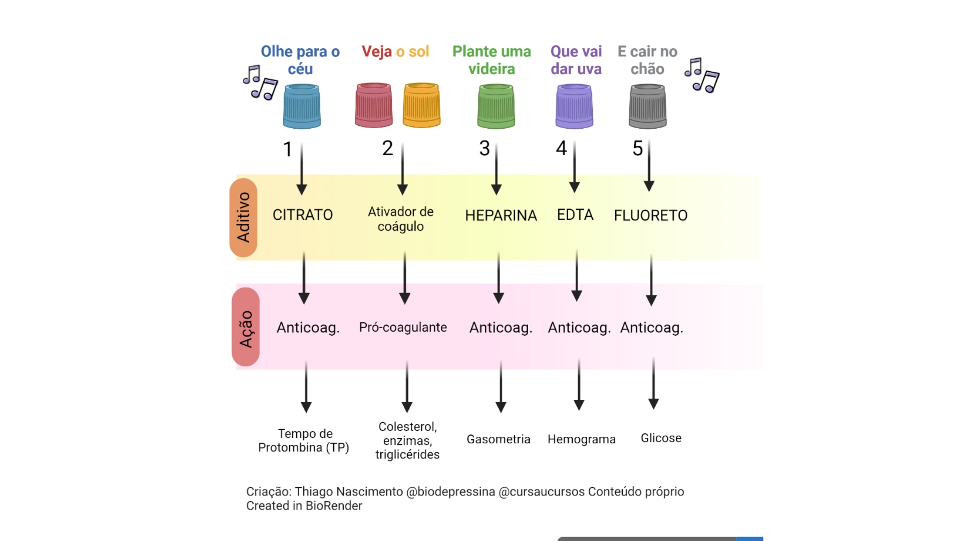 TUBO ADITIVO EXAMES TAMPA AZUL CLARO CITRATO Anticoagulante citrato de sódio 3,2% Tempo de Protombina (TP) e Tempo de Tromboplastina ativada (TTPa) VERMELHO - Possui ativador de coágulo (sílica) jateado na parede do tubo Bioquímica e Sorologia. Exemplos: Colesterol, Triglicérides, Amilase, Lipase, AST, ALT, bilirrubina; AMARELO - Contém ativador de coágulo jateado na parede do tubo que faz com que o processo de coagulação seja acelerado e gel separador, para obtenção de um soro com melhor qualidade É um tubo vermelho de melhor qualidade e um pouquinho mais caro, Bioquímica e Sorologia. Exemplos: Colesterol, Triglicérides, Amilase, Lipase, AST, ALT, bilirrubina, é comum preferir o tubo amarelo para dosagem de marcadores cardíacos como CK-MB e troponinas VERDE HEPARINA DE LITIO Heparina de Lítio jateada na parede do tubo Usado para determinações Bioquímicas, como marcadores cardíacos também, é muito utilizada em hospitais para gasometria (pH, pCO2, pO2 e etc) TUBO ADITIVO EXAMES ROXO EDTA EDTA jateado na parede do tubo e são utilizados em bancos de sangue. O EDTA é o anticoagulante recomendado para rotinas de hematologia por ser o melhor anticoagulante para a preservação da morfologia celular. Ex: hemograma CINZA FLUORETO Fluoreto de Sódio é utilizado como inibidor glicolítico e o EDTA como anticoagulante, preservando a morfologia celular. É utilizado na dosagem de glicose, lactato e hemoglobina glicada no plasma. OUTROS TUBOS ADITIVO EXAMES VERDE ESCURO anticoagulante de heparina sódica Cariótipo e FISH (Fluorescence In Situ Hybridization). AZUL ESCURO Este tubo pode conter ativador de coágulo ou os anticoagulantes EDTA ou heparina sódica São tubos sem traços de metais (trace), os que contêm o ativador de coágulo são utilizados para análises toxicológicas de metais séricos e os que contêm o anticoagulante (EDTA ou heparina) são utilizados para análises toxicológicas de metais sanguíneos. BRANCO Não contém Este tubo não contém aditivo e é utilizado para o transporte de amostras ou na análise dos metais séricos. Também pode ser utilizado para transporte de líquidos nobres, como o LCR OUTROS TUBOS ADITIVO EXAMES PAXGENE Este tubo contém um estabilizador de RNA utilizado para análises do Gene BCR- ABL p190 t(9;22)(Cromossomo Philadelphia). TUBO ÂMBAR Protegido de radiação UV Este tubo possui uma cor que protege a amostra da exposição à luz e é utilizado para os analitos fotossensíveis que precisam da proteção da luz (ex.: vitaminas). PEROLADO Este tubo contém o anticoagulante EDTA e o gel separador. . A presença do gel separador permite um plasma puro e sem interferentes dos elementos sanguíneos do sangue. É utilizado para detecção e quantificação de agentes infecciosos, sexagem fetal entre outras análises por PCR. TAMPA AMARELA CLARA (ACD) Este tubo contém ácido cítrico, citrato de sódio e dextrosee Uttilizado para contagem de plaquetas de pacientes EDTA-dependentes. Para estes pacientes formam grumos plaquetários impossibilitando a realização do teste. Também é utilizado para os testes de Histocompatibilidade (Crossmatch para fertilidade e transplante de órgãos). Slide 1 Slide 2 Slide 3 Slide 4 Slide 5