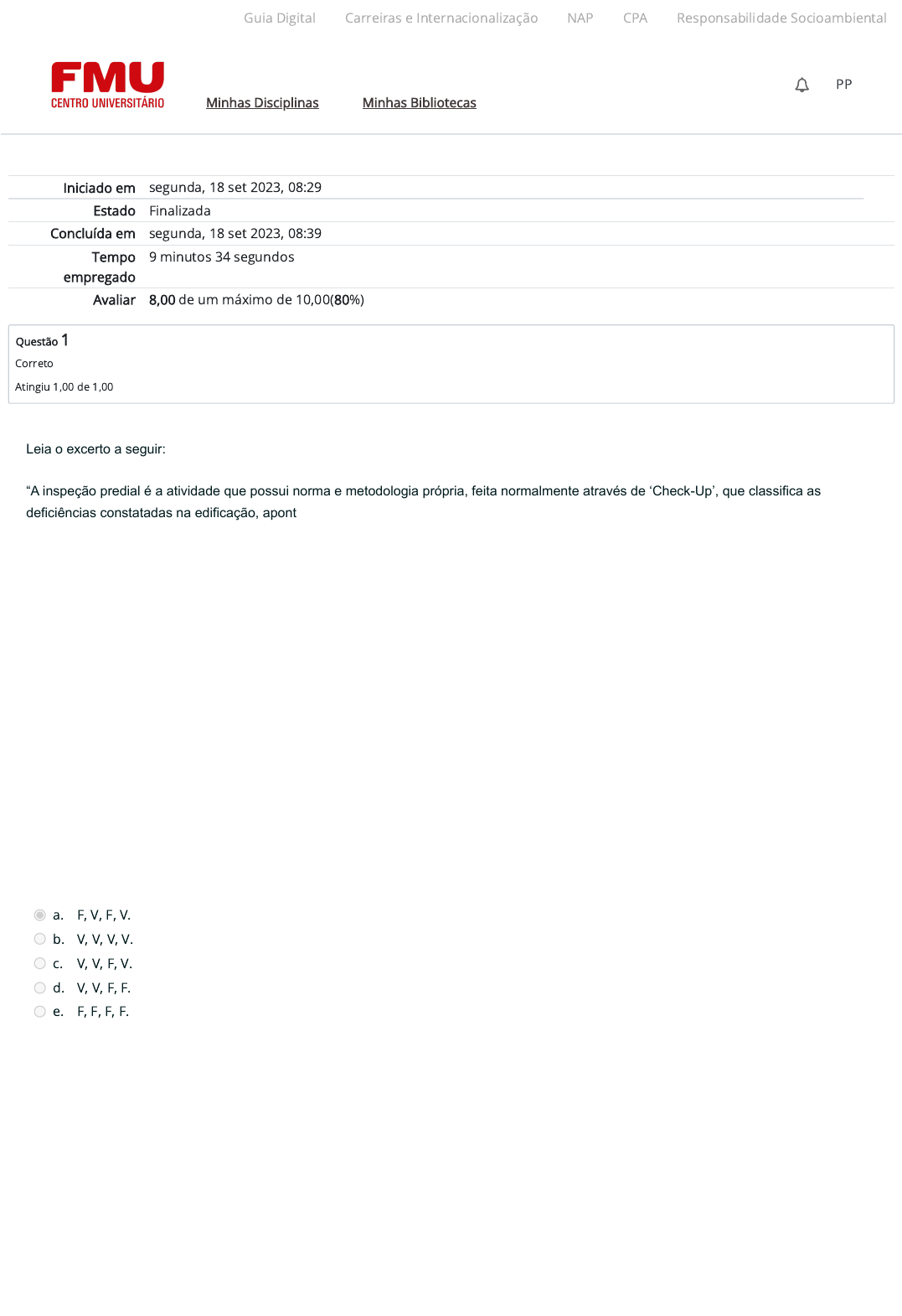 Iniciado em segunda, 18 set 2023, 08:29 Estado Finalizada Concluída em segunda, 18 set 2023, 08:39 Tempo empregado 9 minutos 34 segundos Avaliar 8,00 de um máximo de 10,00(80%) Questão 1 Correto Atingiu 1,00 de 1,00 Leia o excerto a seguir: “A inspeção predial é a atividade que possui norma e metodologia própria, feita normalmente através de ‘Check-Up’, que classifica as deficiências constatadas na edificação, aponta o grau de risco observado para cada uma delas e gerando a ordem de prioridades técnicas com orientações ou recomendações para sua correção” (IBAPE-PR, 2016, p. 11). IBAPE-PR – INSTITUTO BRASILEIRO DE AVALIAÇÕES E PERÍCIAS DE ENGENHARIA DO PARANÁ. Inspeção e manutenção predial. 2016. p. 11. A respeito da inspeção predial, analise as afirmativas a seguir, e assinale V para a(s) Verdadeira(s) e F para a(s) Falsa(s). I. ( ) A aplicação da inspeção predial se limita a edificações de uso residencial, prioritariamente a edifícios de médio a grande porte, não sendo aplicada a estabelecimentos comerciais ou industriais. II. ( ) A inspeção predial determina decisões e responsabilidades ao profissional de engenharia. III. ( ) A inspeção predial melhora a qualidade de vida e a segurança das pessoas, no entanto, não leva em consideração a sustentabilidade e o meio ambiente, sendo a cargo de órgãos específicos. IV. ( ) Os profissionais de engenharia e arquitetura são os únicos responsáveis pela inspeção predial. Analisam os sistemas construtivos da edificação (alvenaria, estrutura, esquadrias e outros), as instalações prediais e os equipamentos como elevadores e bombas. Assinale a alternativa que apresenta a sequência correta: a. F, V, F, V. b. V, V, V, V. c. V, V, F, V. d. V, V, F, F. e. F, F, F, F. Guia Digital Carreiras e Internacionalização NAP CPA Responsabilidade Socioambiental Minhas Disciplinas Minhas Bibliotecas PP https://codely-fmu-content.s3.amazonaws.com/Moodle/GuiaDigital/Guia+digital/index.html https://carreiras.fmu.br/ https://codely-fmu-content.s3.amazonaws.com/Moodle/NAP/inicial/nap/fmu/index.html https://codely-fmu-content.s3.amazonaws.com/Moodle/CPA/landing_CPA/index.html https://portal.fmu.br/sustentabilidade https://ambienteacademico.com.br/ https://ambienteacademico.com.br/ https://ambienteacademico.com.br/course/view.php?id=236 Questão 2 Incorreto Atingiu 0,00 de 1,00 Leia o excerto a seguir: “Dependendo do tipo de estrutura e dos problemas avaliados inicialmente, é importante que se realize uma averiguação mais detalhada na estrutura, a fim de poder realizar um diagnóstico preciso. As etapas de uma inspeção predial podem ser divididas entre inspeção preliminar e detalhada” (TUTIKIAN; PACHECO, 2013, p. 6). TUTIKIAN, B.; PACHECO, M. Inspección, diagnóstico y prognóstico em la construcción civil. Boletim técnico. Mérida: ALCONPAT Internacional, 2013. A respeito da inspeção predial preliminar e detalhada, analise as afirmativas a seguir, e assinale V para a(s) Verdadeira(s) e F para a(s) Falsa(s). I. ( ) A inspeção preliminar tem por objetivo determinar a natureza do problema e servir para uma inspeção detalhada do edifício. Esse estudo não somente avalia os antecedentes da estrutura e do meio em que a edificação está inserida, mas também realiza ensaios experimentais in loco como a pacometria. II. ( ) O exame visual geral da estrutura determina a gravidade do problema. Por ser um teste visual, apenas registros descritivos são necessários, dispensando o fotográfico, pois esse será realizado em inspeções detalhadas. III. ( ) A inspeção detalhada é originada da inspeção preliminar e é um estudo criterioso da estrutura danificada. Nessa etapa, são elaboradas de fichas ou formulários de avaliação. IV. ( ) Para a finalização da inspeção, a realização da inspeção detalhada é feita com a convocação de uma assembleia dos condôminos, por meio do síndico, para avaliar os resultados dos testes já realizados na inspeção preliminar. Assinale a alternativa que apresenta a sequência correta: a. V, V, F, F. b. F, V, F, V. c. F, F, F, F. d. V, V, V, V. e. V, V, F, V. Guia Digital Carreiras e Internacionalização NAP CPA Responsabilidade Socioambiental Minhas Disciplinas Minhas Bibliotecas PP https://codely-fmu-content.s3.amazonaws.com/Moodle/GuiaDigital/Guia+digital/index.html https://carreiras.fmu.br/ https://codely-fmu-content.s3.amazonaws.com/Moodle/NAP/inicial/nap/fmu/index.html https://codely-fmu-content.s3.amazonaws.com/Moodle/CPA/landing_CPA/index.html https://portal.fmu.br/sustentabilidade https://ambienteacademico.com.br/ https://ambienteacademico.com.br/ https://ambienteacademico.com.br/course/view.php?id=236 Questão 3 Correto Atingiu 1,00 de 1,00 Questão 4 Correto Atingiu 1,00 de 1,00 Leia o excerto a seguir: “A Perícia é a atividade que envolve apuração das causas que motivaram determinado evento ou da asserção de direitos. [...] Por sua vez, o perito é o profissional legalmente habilitado pelos Conselhos Regionais de Engenharia, Arquitetura e Agronomia, com atribuições para proceder a perícia” (ABNT, 1996, p. 4). ABNT – ASSOCIAÇÃO BRASILEIRA DE NORMAS TÉCNICAS. NBR 13752: perícias de engenharia na construção civil. Rio de Janeiro: ABNT, 1996. Considerando o excerto apresentado, assinale a alternativa correta: a. O exame é uma classi�cação de perícia e é de�nido como a constatação de um fato e descrição minuciosa dos elementos constituintes. b. Sempre que solicitado, o perito não deverá comunicar, antecipadamente, o início das diligências com os assistentes técnicos, pois elas podem in�uenciar na decisão judicial. c. Os peritos são solicitados quando surgem dúvidas técnicas entre duas partes, as quais não chegam em uma conclusão. d. Um perito pode ser suspenso por ser parente de uma das partes, a menos que o pro�ssional pertença ao órgão que é parte da causa. e. As perícias em engenh