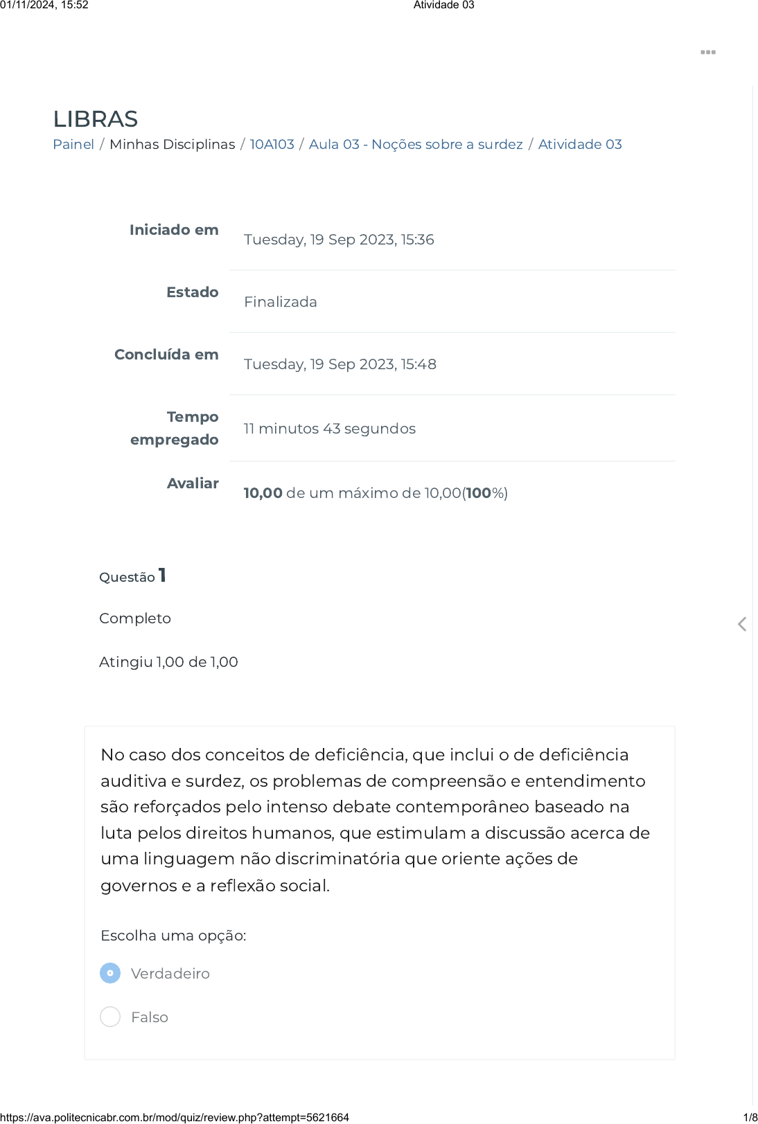 Painel / Minhas Disciplinas / 10A103 / Aula 03 - Noções sobre a surdez / Atividade 03 LIBRAS Iniciado em Tuesday, 19 Sep 2023, 15:36 Estado Finalizada Concluída em Tuesday, 19 Sep 2023, 15:48 Tempo empregado 11 minutos 43 segundos Avaliar 10,00 de um máximo de 10,00(100%) Questão 1 Completo Atingiu 1,00 de 1,00 No caso dos conceitos de de�ciência, que inclui o de de�ciência auditiva e surdez, os problemas de compreensão e entendimento são reforçados pelo intenso debate contemporâneo baseado na luta pelos direitos humanos, que estimulam a discussão acerca de uma linguagem não discriminatória que oriente ações de governos e a re�exão social. Escolha uma opção: Verdadeiro Falso 01/11/2024, 15:52 Atividade 03 https://ava.politecnicabr.com.br/mod/quiz/review.php?attempt=5621664 1/8 https://ava.politecnicabr.com.br/my/ https://ava.politecnicabr.com.br/my/ https://ava.politecnicabr.com.br/course/view.php?id=830 https://ava.politecnicabr.com.br/course/view.php?id=830#section-4 https://ava.politecnicabr.com.br/mod/quiz/view.php?id=21124 https://ava.politecnicabr.com.br/ Questão 2 Completo Atingiu 1,00 de 1,00 O ensino da Libras, como a modalidade linguística mais adaptada às condições físicas da surdez, tornou-se fator fundamental para que se reconheça e estimule o desenvolvimento pleno das capacidades dos surdos, na escola e fora dela. Escolha uma opção: Questão 3 Completo Atingiu 1,00 de 1,00 A Organização Mundial da Saúde (OMS), integrada por 191 países, é a instituição de referência internacional para as convenções de termos e orientação para políticas e estudos cientí�cos sobre a saúde, e ela constantemente vem buscando de�nições mais claras e de aceitação geral. Escolha uma opção: Verdadeiro Falso Verdadeiro Falso 01/11/2024, 15:52 Atividade 03 https://ava.politecnicabr.com.br/mod/quiz/review.php?attempt=5621664 2/8 https://ava.politecnicabr.com.br/ Questão 4 Completo Atingiu 1,00 de 1,00 Quando há prejuízo na transmissão do som entre o conduto auditivo do ouvido externo, o ouvido médio (tímpano, bigorna e estribo) e o ouvido interno (cóclea e nervo auditivo). A a�rmativa se refere a: Escolha uma opção: a. De�ciência auditiva condutiva. b. De�ciência auditiva neurossensorial. c. De�ciência auditiva mista. d. De�ciência auditiva sensorial. 01/11/2024, 15:52 Atividade 03 https://ava.politecnicabr.com.br/mod/quiz/review.php?attempt=5621664 3/8 https://ava.politecnicabr.com.br/ Questão 5 Completo Atingiu 1,00 de 1,00 A CIF (OMS, 2001) relaciona funcionalidade e incapacidade através de conceitos interativos, são eles, EXCETO: Escolha uma opção: Questão 6 Completo Atingiu 1,00 de 1,00 Faça a associação do grau de audição com o nível no audiômetro: De�ciência moderada Audição normal De�ciência leve De�ciência profunda (surdez) a. As funções e estruturas do corpo das pessoas e o seu estado de saúde. b. Os fatores contextuais (ambientais e pessoais) que in�uenciam essas experiências (fatores contextuais). c. Um conjunto complexo relacionado à interação. d. As atividades e as tarefas que a pessoa exerce nas diferentes áreas da sua vida (atividades e participação). 41 – 60 dB. 25 dB ou menos. 26 – 40 dB. 81 dB ou mais. 01/11/2024, 15:52 Atividade 03 https://ava.politecnicabr.com.br/mod/quiz/review.php?attempt=5621664 4/8 https://ava.politecnicabr.com.br/ Questão 7 Completo Atingiu 1,00 de 1,00 A denominação de surdo é o que tem signi�cado médico correto, ao invés de surdo-mudo, pois a perda da audição refere-se exclusivamente às de�ciências do ouvido e não às cordas vocais (pregas vocais, na terminologia cientí�ca), que mantêm a sua funcionalidade. Escolha uma opção: Questão 8 Completo Atingiu 1,00 de 1,00 A funcionalidade e a incapacidade são vistas como atributos pessoais, como um conjunto complexo relacionado à interação, positiva ou negativa, entre as condições próprias da pessoa, a sua participação como indivíduo e o seu meio social. Escolha uma opção: Verdadeiro Falso Verdadeiro Falso 01/11/2024, 15:52 Atividade 03 https://ava.politecnicabr.com.br/mod/quiz/review.php?attempt=5621664 5/8 https://ava.politecnicabr.com.br/ Questão 9 Completo Atingiu 1,00 de 1,00 Assinale a alternativa correta. O termo de�ciente auditivo é empregado para: Escolha uma opção: a. Os indivíduos que não ouvem nem falam. b. Os indivíduos com perda auditiva muito grave. c. Os indivíduos com perda leve, moderada ou grave. d. Os indivíduos com perda auditiva e di�culdade na fala. 01/11/2024, 15:52 Atividade 03 https://ava.politecnicabr.com.br/mod/quiz/review.php?attempt=5621664 6/8 https://ava.politecnicabr.com.br/ Questão 10 Completo Atingiu 1,00 de 1,00 Indivíduos com perda auditiva muito grave, para os quais não há benefício por meios de ampli�cação sonora. A a�rmativa acima se refere a: Escolha uma opção: a. De�ciente auditivo. b. Surdez. c. Surdo-mudo. d. Mudo. Entre em Contato https://www.politecnicabr.com.br 0800 084 2627 0800 084 2627 Links Úteis Dicas da nossa Diretora Acadêmica Planner de Estudos Declaração de Matrícula Orientações do AVA Abertura de Ticket Fale com o Tutor Cronograma de Estudos Manual de Estágio Manual de Competência Siga-nos nas redes sociais 01/11/2024, 15:52 Atividade 03 https://ava.politecnicabr.com.br/mod/quiz/review.php?attempt=5621664 7/8 https://www.politecnicabr.com.br/ https://soundcloud.com/user-501638417/sets/escola-politecnica-brasileira https://soundcloud.com/user-501638417/sets/escola-politecnica-brasileira https://storage.googleapis.com/sirius-pubstore/semestre_plannerdeestudo%20poli.pdf https://storage.googleapis.com/sirius-pubstore/semestre_plannerdeestudo%20poli.pdf https://storage.googleapis.com/sirius-pubstore/declaracao_matricula.pdf https://storage.googleapis.com/sirius-pubstore/declaracao_matricula.pdf https://storage.googleapis.com/sirius-pubstore/orientacoes_ava.pdf https://storag