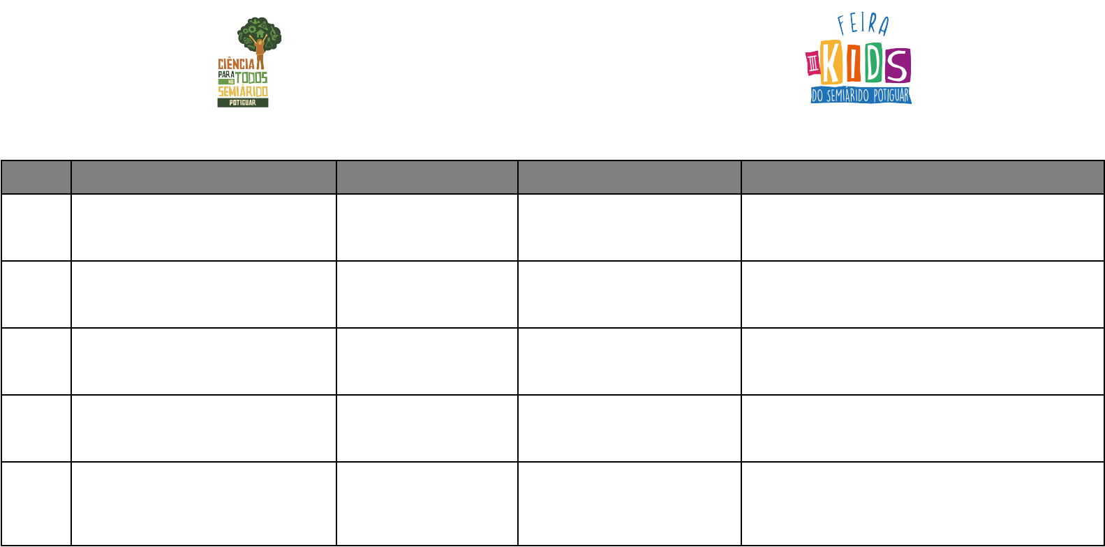 Pág. 1 Finalistas FCSP 2024 Modalidade KIDS 03 de dezembro de 2024 Estande Título Escola Orientador Autores K-101 TIPOS DE POLUIÇÃO. ESCOLA ESTADUAL DE TEMPO INTEGRAL POETA RENATO CAL... MILDACYR ALVES PEREIRA SILVA APARECIDA VITÓRIA DE SOUZA PAMELA MARYE DA SILVA OLIVEIRA EMILLY GABRIELLE FERNANDES CARNEIRO K-102 EVITANDO A POLUIÇÃO DA TERRA ESCOLA ESTADUAL DESEMBARGADOR FELIPE GUERRA EDNA MARIA DE OLIVEIRA ADRIEL MESAQUE MENDES DANTAS KASSIO JOSÉ DUARTE DE FREITAS JÚNIOR K-103 DESENVOLVIMENTO DE CRIANÇAS AUTISTAS: BRINQUEDOS E... ESCOLA ESTADUAL DESEMBARGADOR FELIPE GUERRA MAYARA LEYLANE EUFRAZIO NERIS HELLEN VITÓRIA RODRIGUES CASTRO LAYSA MABEL BATISTA VIEIRA MARIA CECILIA MEDEIROS EUFRAZIO K-104 A EVOLUÇÃO DA ESCOLA ESTADUAL DESEMBARGADOR FELIPE... ESCOLA ESTADUAL DESEMBARGADOR FELIPE GUERRA MAYARA LEYLANE EUFRAZIO NERIS AYLLA MONIQUE AZEVEDO SILVA JOYCE RAYSLLANE EUFLOZINO DA SILVA K-105 AS CORES E OS SENTIMENTOS ESCOLA ESTADUAL PROFESSORA ADALGISA EMÍDIA DA COST... LUANA VALENTIN DOS SANTOS ITÁLIA SANTOS CAVALCANTE MARIA CECÍLIA ALVES MENDES MARIA ISIS TAVARES DIAS Pág. 2 Estande Título Escola Orientador Autores K-106 O FUTEBOL COMO ALIADO NA ALFABETIZAÇÃO DE CRIANÇAS ESCOLA ESTADUAL PROFESSORA ADALGISA EMÍDIA DA COST... LUANA VALENTIN DOS SANTOS ISAAC ARAÚJO SOUSA ISRAEL CUNHA MANCIO JOÃO GUILHERME ROCHA LEONÊZ K-107 A IMPORTÂNCIA DOS ANIMAIS DE ESTIMAÇÃO PARA A CONS... ESCOLA ESTADUAL PROFESSORA ADALGISA EMÍDIA DA COST... LUANA VALENTIN DOS SANTOS ALLAN OLIVIER LIRA SILVA ANNA ESTHER LIRA GOMES ANTONIA NADJA DEYSE OLIVEIRA SOUSA K-108 MARTE: O PLANETA VERMELHO, O QUE SE SABE SOBRE ESS... ESCOLA ESTADUAL PROFESSORA ADALGISA EMÍDIA DA COST... MARIA ADEGNELVA FERREIRA SILVA ANA BEATRIZ OLIVEIRA DE MELO ANNELY CECÍLIA NOGUEIRA FERNANDES ELIZA ANDRYSLA MARINHO RODRIGUES K-109 CONHECER PARA ACOLHER: ENTENDENDO AS CARACTERÍSTIC... ESCOLA ESTADUAL PROFESSORA ADALGISA EMÍDIA DA COST... MARIA SELMA CUNHA EMILLY RAQUEL SOUZA MATIAS MARYANE SOUSA MARQUES K-110 ALIMENTAÇÃO SAUDÁVEL: O AÇÚCAR NAO FAZ FALTA ESCOLA ESTADUAL TEMPO INTEGRAL LUIS GONDIM MARIA VANDA DE OLIVEIRA AQUINO ANNA FLÁVIA DO NASCIMENTO ALVES JENNYFER MAYARA ZACARIAS DOS SANTOS SILVA MARIA EDUARDA RODRIGUES DA SILVA K-111 SINALÁRIO DE ANIMAIS DA CAATINGA CENTRO ESTADUAL DE CAPACITAÇÃO DE EDUCADORES E ATE... ANA PAULA SOUZA LIRA DA SILVA LARA NICOLE LIMA DO NASCIMENTO ALEXIA VITÓRIA DUARTE VASCONCELOS GIOVANNY RUAN DA COSTA MORAIS K-112 A CONTRIBUIÇÃO DOS BONECOS RECICLÁVEIS PARA O PROC... CENTRO REGIONAL DE EDUCAÇÃO ESPECIAL DE MOSSORÓ- C... LEILA SILMARA DE MORAIS NOGUEIRA RENAN VITOR DE OLIVEIRA SILVA Pág. 3 Estande Título Escola Orientador Autores K-113 MAGNETISMO E E PROFESSOR HERMÓGENES NOGUEIRA DA COSTA ANA CATARINA DA SILVA ISAC MARCOS DOMINGUES COSTA FELIPE MARINHO TRAJANO JOÃO GABRIEL DE LIMA DANTAS K-114 A INTERNET NO FUNDO DO MAR E E PROFESSOR HERMÓGENES NOGUEIRA DA COSTA ANA CATARINA DA SILVA IASMYM BARBARA DA SILVA MARIA JÚLIA DANTAS MONTEIRO PHELYPE GABRIEL DA SILVA PEREIRA K-115 A DANÇA NO COMBATE A DEPRESSÃO E E PROFESSOR HERMÓGENES NOGUEIRA DA COSTA ELINEUZA SOARES DE SOUSA LÍVIA BIANCA VENTURA DE SOUZA ANA LUÍSA COSTA DOS SANTOS LAVÍNEA REBECA RODRIGUES K-116 AS BORBOLETAS: METAMORFOSE E PERCEPÇÕES E E PROFESSOR HERMÓGENES NOGUEIRA DA COSTA LIDIANY FREIRE DA SILVA ANA BEATRIZ HOLANDA DOS SANTOS ÂNGELA VALENTINA LIMA SIQUEIRA ALVES LUNA ESTHER OLIVEIRA DA SILVA K-117 COMO ACONTECEM OS TERREMOTOS. ESCOLA ESTADUAL ABOLIÇÃO IV ANTONIA MARIA DA SILVA ALVES GABRIEL SAUL DE LIMA FILGUEIRA MATHEUS WALYSON MARCELINO PEREIRA DA SILVA RAPHAEL RENAN DE MEDEIROS K-118 MUDANÇAS CLIMÁTICAS ESCOLA ESTADUAL ABOLIÇÃO IV FRANCISCA DE FÁTIMA OLIVEIRA SANTOS ANA CECILIA LEÃO ALVES DA CRUZ LUIZ MIGUEL OLIVEIRA DE MEDEIROS MARIA CECILIA OLIVEIRA DE MEDEIROS K-119 COLETA SELETIVA ESCOLA ESTADUAL ALFA VILLE LUANA CRISTINA MEDEIROS BEZERRA BERNARDO RODRIGUES GONÇALVES DOS SANTOS LHAYRA EVELIM OLIVEIRA DA COSTA GUILHERME EVANGELISTA REIS K-120 DESMATAMENTO ESCOLA ESTADUAL ALFA VILLE LUANA CRISTINA MEDEIROS BEZERRA NICOLE MARTINS DE CARVALHO JULIANY JÁCOME RIBEIRO DAVYD JANILSON RODRIGUES Pág. 4 Estande Título Escola Orientador Autores K-121 MAGNETISMO ESCOLA ESTADUAL ALFA VILLE LUANA CRISTINA MEDEIROS BEZERRA EVA YANIS NUNES LOPES JÚLIA VITÓRIA SOUZA DOS SANTOS MELO BERNARDO KENNEDY SENA NOGUEIRA K-122 EXPERIÊNCIA TÁTIL: FERRAMENTAS PARA INTEGRAÇÃO SEN... ESCOLA ESTADUAL DE TEMPO INTEGRAL AMBULATÓRIO CARD... ALLANA MINELLY TARGINO SILVA MARIA CLARA DA SILVA TAIZA LORRANA FERREIRA SIQUEIRA TAMYRES RAQUEL DA SILVA K-123 CIRCUITO ELÉTRICO: TESTANDO POSSIBILIDADES ESCOLA ESTADUAL DE TEMPO INTEGRAL AMBULATÓRIO CARD... BRENA EMANUELE DA SILVA HERCULES HENRIQUE DAS NEVES SILVA JOÃO FELIPE ARRUDA LOPES PEDRO VINICIUS NUNES CAMPELO K-124 A INCLUSÃO DO ALUNO COM DIFICIÊNCIA MULTIPLA: QUEB... ESCOLA ESTADUAL EDUCANDÁRIO PROFESSOR PAULO FREIRE YURYANA RAKELE MORAES DA SILVA ANTONIO NATANAEL LIMA PEREIRA DHAFNY NICOLLE FERNANDES DE OLIVEIRA NICOLAS CAUAN PEREIRA DE SOUZA K-125 DESVENDANDO O CLIMA: A INFLUÊNCIA DAS AÇÕES HUMANA... ESCOLA ESTADUAL JERÔNIMO ROSADO WILLKIA BARBOSA DE MENEZES OLIVEIRA IGOR SAMUEL DE MORAIS PEREIRA ALEXIA BIANCA PEREIRA SALES ANA CLARA DA SILVA FREITAS K-126 VENTOS GIRATÓRIOS: A CIÊNCIA POR TRÁS DOS FURACÕES... ESCOLA ESTADUAL JERÔNIMO ROSADO WILLKIA BARBOSA DE MENEZES OLIVEIRA JOÃO FELIPE BEZERRA DE MORAES NICKSON DAVI MEDEIRO DOS SANTOS ANTHONY PYETRO SOARES DA SILVA K-127 O MUNDO DAS AVES E SUAS CURIOSIDADES ESCOLA ESTADUAL LUIZ DANTAS CAVALCANTI LUANA OLIVEIRA FERREIRA LIMA SARAH JULIANA PONTES AUGUSTO DE MELO PIERRY SAMUEL DE SOUSA SOLON K-128 O FANTÁSTICO MUNDO DAS FORMIGAS ESCOLA ESTADUAL LUÍZ DANTAS CAVALCANTI POLIANA LINHARES DA SILVA DE OLIVEIRA JOÃO GABRIEL PEREIRA BRITO SILVA GUSTAVO COSTA SOUZA Pág. 5 Estande Título Escola Orientador Autores K-129 A IMPORTÂNCIA DA SUSTENTABILIDADE PARA O EQUILÍBRI... E