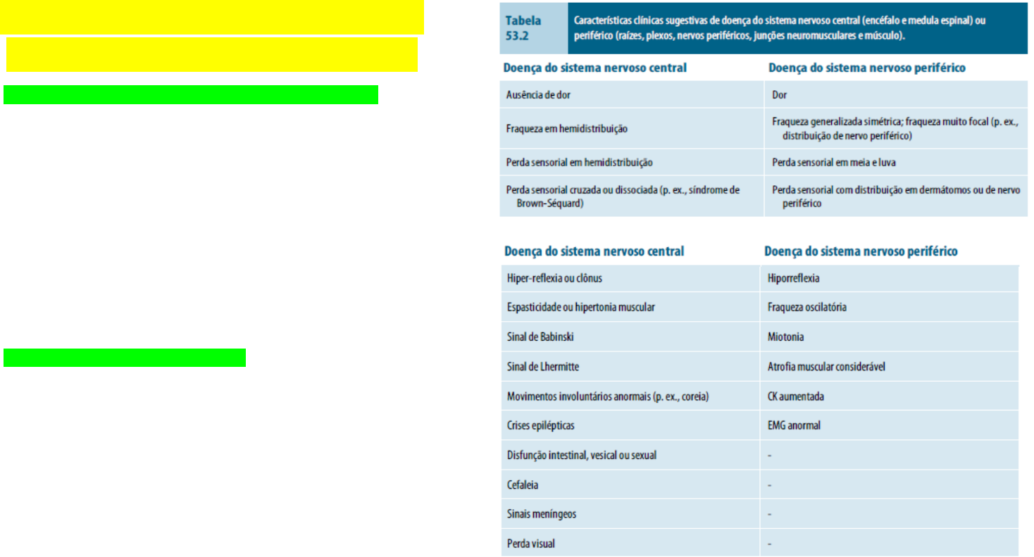 THAMIRES JUNGER – 5D - NEURO DIAGNÓSTICOS E LOCALIZAÇÃO DAS DOENÇAS NEUROLÓGICAS 1) DIAGNÓSTICO DIFERENCIAL NEUROLÓGICO - Onde está a lesão: localização - O que é a lesão: Fisiopatologia/causa Destruição: lesão do nervo periférico Liberação: liberação piramidal Irritação: crise convulsiva - Doença neurológica Primária: esclerose multipa, Guillain Barré e cefaléia Secundária a outra patologia Intoxicação por substâncias exógenas: neurotoxicidade dos quimioterápicos 2) DIAGNÓSTICO ANATÔMICO DE FORA PARA DENTRO: - Músculo - Junção neuromuscular - Nervo periférico - Medula espinjal - Raízes nervosas - Tronco encefálico - Hemisférios cerebrais THAMIRES JUNGER – 5D - NEURO 3) MANIFESTAÇÕES CLÍNICAS DAS DOENÇAS - Disfunção primária do músculo esquelético Fraqueza proximal simétrica Preservação de reflexos Sensibilidade preservada Sem comprometimento de funções corticais superiores THAMIRES JUNGER – 5D - NEURO - Distúrbios da junção neuromuscular Fraqueza por comprometimento da transmissão neuromuscular Miastenia gravias Síndrome miastênica de Lambert Eaton Botulismo Fraqueza proximal simétrica Sinais bulbares: sinais oculares, disfagia e dificuldade para fala - Neuropaticas periféricas Afeta axônio e/ou bainha de mielina dos neurônios periféricos Fraqueza Diminuição de sensibilidade Diminuição de reflexos DM, alcoolismo, Sindrome de Guillain Barré Polineuropatias (vários nervos acometidos, não respeita o trajeto do nervo) x Mononeuropatias (acomete um nervo THAMIRES JUNGER – 5D - NEURO específico. Pode ter mononeuropatias múltiplas: a hanseníase causa patologia no nervo ulnar e mediano, mais de um nervo em diferentes regiões) - Plexopatias Plexo braquial mais comum que plexo lombossacro Fraqueza Perda de sensibilidade Diminuição de reflexos Radiculopatias Hérnias de disco Déficit motor, sensitivo, diminuição de reflexos Dor Sinal de Laségue THAMIRES JUNGER – 5D - NEURO - Mielopatias Transversa, Síndrome de Brown Sequard, Síndrome Medular anterior, Síndrome Medular central, Esclerose póstero lateral, Síndrome do corno anterior da medula. Fraqueza, perda de sensibilidade, reflexos aumentados, reflexos patológicos Presença de nível (umbigo para baixo, pescoço para baixo) - Doenças do tronco encefálico Déficits cruzados com disfunção de ipsilateral de nervo craniano. AVC, EM, Neoplasias - Doenças do cerebelo Tremor Incoordenação Ataxia de marcha Disartria Nistagmo - Distúrbios dos hemisférios cerebrais “Hemi” Hiperreflexia e reflexos patológicos Sinal de lesão cortical Afasia, agnosia, perda de memória, disfunção cognitiva, crise epilética THAMIRES JUNGER – 5D - NEURO A: Paciente perda de sensibilidade no hemi corpo esquerdo, onde a lesão é no cérebro no hemisfério direito. B: Paciente perda de sensibilidade em hemiface esquerda, e perda de sensibilidade corporal hemi corpo direito, onde a lesão é no tronco encefálico. Lesão na ponte em lado esquerdo. Quando tem decussão das pirâmides e via sensitiva faz lesão contralateral. C: Lesão com nível medular. A nível de T10. D: Lesão cervical, ocorre uma obstrução e tem dilatação do canal central da medula, e comprime tudo que está em volta: motor, sensorial, sensitivo sensorial. A lesão vai evoluir, e vai lesando região lombar, sacral. Síndrome medular central. E: Lesão de luva e bota, vasculite lesando nervoso mais finos e na extremidade: caso de neuropatia diabética F: Parte azul é perda de sensibilidade térmica e dolorosa, o vermelho é perda de sensibilidade tátil. Doença de Brown Sequard, síndrome de hemissecção da medula. Paciente do mesmo lado da hemissecção tem perda de sensibilidade tátil que são transmitidas pelos fascículos grácil e cuneiforme, porém a perda da sensibilidade dolorosa e temperatura é contralateral, porque a fibra cruza na medula. Lesão em T4. G: Dermatomo é comprometido, então a doença é na raiz de L5. Casos de hérnia de disco. H: Dermatomoto é comprometido, alguma situação comprometendo raiz lombossacra. 4) DIAGNÓSTICO DIFERENCIAL POR ETIOLOGIA