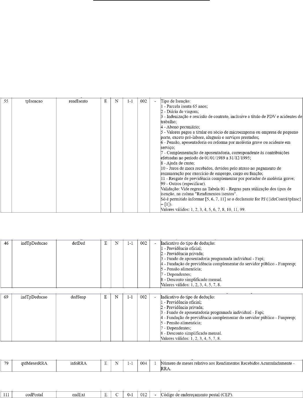 1 NOTA TÉCNICA EFD-REINF 03/2023 Essa Nota Técnica tem como objetivo apresentar os seguintes ajustes nos leiautes da versão 2.1.2 da EFD- Reinf: Leiaute do R-4010: Campo {tpIsencao}: alteração da validação “Só é permitido informar [5, 6, 7, 11] se o declarante for PJ ({ideContri/tpInsc}=[1])”. Campo {indTpDeducao}: inclusão do tipo de dedução “8 – Desconto simplificado mensal” nos grupos de informações {detDed} e {dedSusp}. Campo {qtdMesesRRA}: retirada da validação “Se for maior que zero, {vlrRendTrib} deve ser maior que zero”. Campo {codPostal}: retirada da validação “Devem ser informados apenas caracteres numéricos”. 2 Leiaute do R-4020: Campo {codPostal}: retirada da validação “Devem ser informados apenas caracteres numéricos”. “Tabela 01 – Natureza de Rendimentos” do anexo I dos leiautes: Código de natureza do rendimento 11005: alteração da coluna “País Exterior – PF” para “F”. Código de natureza do rendimento 13002: alteração da descrição para “Rendimentos de Aluguéis, Locação ou Sublocação”. Código de natureza de rendimento 13026: acrescentado o declarante “PJ/PF”. Código de natureza de rendimento 15001: alteração da coluna “Tributos” para “IR, COFINS, PP e Agreg”. Código de natureza de rendimento 15002: alteração da coluna “Tributos” para “IR, CSLL, COFINS, PP e Agreg”. Grupo 17: alteração da descrição para “Rendimentos pagos/creditados por órgãos da administração pública na forma da IN RFB 1234/2012”. Grupo 18: alteração da descrição para “Rendimentos pagos/creditados EXCLUSIVAMENTE por órgãos, autarquias e fundações dos estados, do Distrito Federal e dos municípios mediante convênio”. Incluído o tipo de dedução “8 – Desconto simplificado mensal” nos parâmetros dos códigos de natureza de rendimentos 10001 a 10003, 10005, 10006, 11001, 11003, 11004, 12004, 12009 a 12011, 12045, 13001 a 13023, 13025, 13098 e 13099. 3 Tabela 01 – Natureza de Rendimentos Importante: as retenções de imposto de renda decorrentes do rendimento de trabalho devem ser enviadas pelo eSocial. No entanto, para situações específicas em que não seja possível fazer o envio pelo eSocial, a EFD-Reinf deve ser a escrituração utilizada para essa apuração. Maiores detalhes a respeito estão informados nos manuais de orientação do eSocial e da EFD-Reinf. Cód. da natureza do rendi- mento Natureza de rendimento FC I 13º RR A DED Rendim. isento País Exterior Decla- rante TRIBUTO * PF PJ Grupo 10 – Rendimentos do trabalho e da previdência social 10001 Rendimento decorrente do trabalho com vínculo empregatício N S S 1;2;3;4; 5;7;8 2;3;4;5; 8; 99 F N/A PJ/PF IR 10002 Rendimento decorrente do trabalho sem vínculo empregatício N N S 1;5;7;8 2;3;4;8; 99 F N/A PJ IR 10003 Rendimento decorrente do trabalho pago a trabalhador avulso N S S 1;5;7;8 2;3;4;8; 99 F N/A PJ IR 10005 Benefício de Regime Próprio de Previdência Social N S S 1;2;3;5; 7;8 1;6;99 F N/A PJ IR 10006 Benefício do Regime Geral de Previdência Social N S S 1;2;3;5; 7;8 1;6;99 F N/A PJ IR Grupo 11 - Rendimentos decorrentes de decisão judicial 11001 Decorrente de Decisão da Justiça do Trabalho N S S 1;5;7;8 10;99 F F PJ/PF IR 11003 Decorrente de Decisão da Justiça dos Estados/Distrito Federal N S S 1;2;3;4; 5;7;8 6;10 F F PJ/PF IR 11004 Responsabilidade Civil - juros e indenizações por lucros cessantes, inclusive astreinte N N S 1;2;3;4; 5;7;8 F F PJ/PF IR Grupo 12 - Rendimentos do capital 12004 Resgate de Previdência Complementar - Modalidade Benefício Definido - Não Optante pela Tributação Exclusiva N N N 8 7;11 F N/A PJ IR 12009 Benefício de Previdência Complementar - Modalidade Contribuição Definida/Variável - Não Optante pela Tributação Exclusiva N S S 2;3;4;5; 7;8 1,6,7,99 F N/A PJ IR 12010 Benefício de Fundo de Aposentadoria Programada Individual (Fapi)- Não Optante pela Tributação Exclusiva N S S 2;3;4;5; 7;8 1,6,7,99 F N/A PJ IR 12011 Benefício de Previdência Complementar - Modalidade Benefício Definido - Não Optante pela Tributação Exclusiva N S S 2;3;4;5: 7;8 1,6,7,99 F N/A PJ IR 12045 Rendimentos de Partes Beneficiárias ou de Fundador N N N 1;5;7;8 F F PJ IR Grupo 13 – Rendimentos de direitos 13001 Rendimentos de Aforamento N N S 1;5;7;8 F O PJ/PF IR 13002 Rendimentos de Aluguéis, Locação ou Sublocação N N S 1;5;7;8 F O PJ/PF IR 13003 Rendimentos de Arrendamento ou Subarrendamento N N S 1;5;7;8 F O PJ/PF IR 13004 Importâncias pagas por terceiros por conta do locador do bem (juros, comissões etc.) N N S 1;5;7;8 F O PJ/PF IR 13005 Importâncias pagas ao locador pelo contrato celebrado (luvas, prêmios etc.) N N S 1;5;7;8 F O PJ/PF IR 13006 Benfeitorias e quaisquer melhoramentos realizados no bem locado N N S 1;5;7;8 F O PJ/PF IR 13007 Juros decorrente da alienação a prazo de bens N N S 1;5;7;8 F O PJ/PF IR 13008 Rendimentos de Direito de Uso ou Passagem de Terrenos e de aproveitamento de águas N N S 1;5;7;8 F O PJ/PF IR 13009 Rendimentos de Direito de colher ou extrair recursos vegetais, pesquisar e extrair recursos minerais N N S 1;5;7;8 F O PJ/PF IR 13010 Rendimentos de Direito Autoral N N S 1;5;7;8 2;3;4;8 e 99 F O PJ/PF IR 13011 Rendimentos de Direito Autoral (quando não percebidos pelo autor ou criador da obra) N N S 1;5;7;8 F O PJ/PF IR 13012 Rendimentos de Direito de Imagem N N S 1;5;7;8 F O PJ/PF IR 13013 Rendimentos de Direito sobre películas cinematográficas, Obras Audiovisuais, e Videofônicas N N S 1;5;7;8 F O PJ/PF IR 4 13014 Rendimento de Direito relativo a radiodifusão de sons e imagens e serviço de comunicação eletrônica de massa por assinatura N N S 1;5;7;8 F O PJ/PF IR 13015 Rendimentos de Direito de Conjuntos Industriais e Invenções N N S 1;5;7;8 F O PJ/PF IR 13016 Rendimento de Direito de marcas de indústria e comércio, patentes de invenção e processo ou fórmulas de fabricação N N S 1;5;7;8 F O PJ/PF IR 1301
