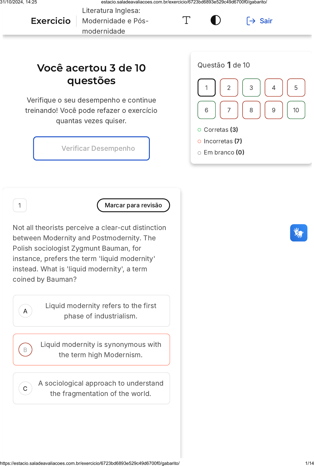 Você acertou 3 de 10 questões Verifique o seu desempenho e continue treinando! Você pode refazer o exercício quantas vezes quiser. Verificar Desempenho A B C 1 Marcar para revisão Not all theorists perceive a clear-cut distinction between Modernity and Postmodernity. The Polish sociologist Zygmunt Bauman, for instance, prefers the term 'liquid modernity' instead. What is 'liquid modernity', a term coined by Bauman? Liquid modernity refers to the first phase of industrialism. Liquid modernity is synonymous with the term high Modernism. A sociological approach to understand the fragmentation of the world. Questão 1 de 10 Corretas �3� Incorretas �7� Em branco �0� 1 2 3 4 5 6 7 8 9 10 Exercicio Literatura Inglesa: Modernidade e Pós- modernidade Sair 31/10/2024, 14:25 estacio.saladeavaliacoes.com.br/exercicio/6723bd6893e529c49d6700f0/gabarito/ https://estacio.saladeavaliacoes.com.br/exercicio/6723bd6893e529c49d6700f0/gabarito/ 1/14 D E A period characterized by technologically developed, capitalist global cities. A term that refers to modernity and its instabilities in the beginning of the 20 century. th Resposta incorreta Opa! A alternativa correta é a letra D. Confira o gabarito comentado! Gabarito Comentado Resposta correta: Um período caracterizado por cidades globais capitalistas e tecnologicamente desenvolvidas. Explicação: A modernidade líquida é caracterizada por sociedades globais altamente desenvolvidas, marcadas por economias capitalistas globais com sua crescente privatização de serviços e um sistema econômico baseado em tecnologia da informação. Outro termo para este período é a modernidade tardia. A primeira fase do industrialismo começou no século XVIII. O alto modernismo refere-se ao início do século XX e foi uma reação a uma sociedade corrompida, marcada por descobertas e avanços na ciência e tecnologia. 2 Marcar para revisão Modernism is an aesthetic movement in visual arts, music, drama, and literature, which 31/10/2024, 14:25 estacio.saladeavaliacoes.com.br/exercicio/6723bd6893e529c49d6700f0/gabarito/ https://estacio.saladeavaliacoes.com.br/exercicio/6723bd6893e529c49d6700f0/gabarito/ 2/14 A B C D E rejected standards and criteria of previous art forms. Why are Modernist works said to be inaccessible to the general public? Because the majority of people were illiterate. Because of the acceptance of new technologies. Because art was not appreciated by the general public. Because they were vulgar and people¿s taste was more sophisticated. Because of the rejection of Victorian moral values and middle-class assumptions. Resposta incorreta Opa! A alternativa correta é a letra E. Confira o gabarito comentado! Gabarito Comentado Right answer: Because of the rejection of Victorian moral values and middle-class assumptions. Feedback: Because of the rejection of Victorian values and middle-class assumptions, there was a breach between the artist and the public. Besides, the Act of Education of 1870, that made elementary schooling compulsory and universal, allowed a mass literate population to emerge, and the segmentation of the 31/10/2024, 14:25 estacio.saladeavaliacoes.com.br/exercicio/6723bd6893e529c49d6700f0/gabarito/ https://estacio.saladeavaliacoes.com.br/exercicio/6723bd6893e529c49d6700f0/gabarito/ 3/14 A B C D E reading public created a gap between popular art and art appreciated only by the sophisticated people or the experts. The acceptance of new technologies was welcomed by a society that believed in the progress those technologies could bring, and, thus, it would not be a reason for the non-accessibility to works of art. 3 Marcar para revisão There are two main trends in contemporary Irish literature. One school of writing responds to the lessons taught by Modernism, and key issues to their works are language, memory and perception. The other school is concerned with Irishness. Which Irish contemporary writer would you associate with experimentalism in writing? John MacGahern Dermot Bolger Roddy Doyle Tolm Cóibim John Banville Resposta correta Parabéns, você selecionou a alternativa correta. Confira o 31/10/2024, 14:25 estacio.saladeavaliacoes.com.br/exercicio/6723bd6893e529c49d6700f0/gabarito/ https://estacio.saladeavaliacoes.com.br/exercicio/6723bd6893e529c49d6700f0/gabarito/ 4/14 A B C D E gabarito comentado! Gabarito Comentado Right answer: John Banville Feedback: From the selection presented, John Banville is the contemporary writer who does not write about Irishness, images of Ireland or Irish identity, as the others do. He is, therefore, the only one to be associated with experimentalism. 4 Marcar para revisão The romantic poet Samuel Coleridge used the phrase 'the suspension of disbelief' in 1817 to account for the experience of the audience of literary works. What is the idea of 'the suspension of disbelief'? Readers believe in what they are reading, as if it was reality. Suspicion raised by reading a text which brings unreal characters. Feeling of incredulity when reading a text with supernatural events. The sensation of being entrapped in a narrative that is unbelievable. Readers feel in doubt and question the veracity of the plot and narrative. 31/10/2024, 14:25 estacio.saladeavaliacoes.com.br/exercicio/6723bd6893e529c49d6700f0/gabarito/ https://estacio.saladeavaliacoes.com.br/exercicio/6723bd6893e529c49d6700f0/gabarito/ 5/14 A B C Resposta incorreta Opa! A alternativa correta é a letra A. Confira o gabarito comentado! Gabarito Comentado Right answer: Readers believe in what they are reading, as if it was reality. Feedback: It means that you read a text as if it was real; you believe in it. Suspicion, incredulity, perception of being entrapped and feeling doubts are the opposite of 'suspension of disbelief'. 5 Marcar para revisão Modernism in Scotland was marked by a cultural revival that took place after World War I. Even though Scottish modernist writers may not be as renowned as James Joyce, Scottish and I