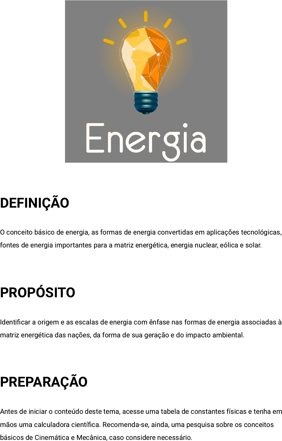 DEFINIÇÃO O conceito básico de energia, as formas de energia convertidas em aplicações tecnológicas, fontes de energia importantes para a matriz energética, energia nuclear, eólica e solar. PROPÓSITO Identificar a origem e as escalas de energia com ênfase nas formas de energia associadas à matriz energética das nações, da forma de sua geração e do impacto ambiental. PREPARAÇÃO Antes de iniciar o conteúdo deste tema, acesse uma tabela de constantes físicas e tenha em mãos uma calculadora científica. Recomenda-se, ainda, uma pesquisa sobre os conceitos básicos de Cinemática e Mecânica, caso considere necessário. OBJETIVOS MÓDULO 1 Relacionar o conceito físico de energia ao funcionamento de tecnologias utilizadas para geração de energia elétrica MÓDULO 2 Identificar o conceito de energia nuclear e como explorá-la MÓDULO 3 Identificar o conceito de energia eólica e como explorá-la MÓDULO 4 Identificar o conceito de energia solar e como explorá-la INTRODUÇÃO A definição de energia em Física é surpreendentemente complicada. Apesar de ser um dos conceitos mais intuitivos — todos nós sabemos comparar um sistema com muita energia e outro com pouca –, a definição científica de energia se dá por meio da descrição de trabalho. Logo, a energia de um corpo é a capacidade desse corpo em realizar trabalho. MÓDULO 1 Relacionar o conceito físico de energia ao funcionamento de tecnologias utilizadas para geração de energia elétrica CONCEITOS SOBRE TRABALHO E ENERGIA Trabalho, do ponto de vista científico, é uma definição matemática: Dado um corpo que segue uma certa trajetória retilínea de comprimento sob ação de uma força externa paralela à trajetória, o trabalho é definido como: � Atenção! Para visualização completa da equação utilize a rolagem horizontal ATENÇÃO Note que particularizamos bastante essa definição, pois nem toda trajetória será retilínea, nem toda força externa é paralela à trajetória. Em breve utilizaremos essa definição para um caso mais geral. Mas vamos primeiro interpretar essa equação. Em um exemplo simples, podemos analisar o caso de um tijolo de 3kg abandonado de uma altura de 5 metros. Nesse caso, o movimento se dá sob a ação da força-peso, a qual é paralela ao movimento do tijolo, que é retilíneo. Podemos, então, dizer que . Calculando a força-peso baseado na aceleração da gravidade na superfície da Terra temos , em que N é a unidade de força Δs F ∥ ext τ = F ∥ ext Δs τ = F ∥ ext Δs g ≈ 9,8m/s² P = mg ≈ 3kg ⋅ 9, 8m/s2 = 29, 4N no Sistema Internacional, chamada de newton. Assim, o trabalho vale . Com relação à unidade usada aqui, utilizamos a definição de trabalho (que incidentalmente servirá também para energia) de acordo com o Sistema Internacional. Essa unidade é o joule, sendo representada por J. Ela é equivalente ao trabalho realizado por uma força de 1N em um corpo que se desloca por 1m. Note que, entretanto, quase todas as áreas da ciência utilizam outras definições de energia, de acordo com sua conveniência. Alguns exemplos incluem: ergs (comum em astronomia). elétron-volts (em Química e Física de Materiais). kWh ou quilowatt-hora (comum em aplicações comerciais e Engenharia de Produção). SAIBA MAIS Comumente, utiliza-se tabelas de conversão entre unidades de energia, que podem ser facilmente encontradas na internet ou em livros. O Sistema Internacional permanece sendo o mais conveniente por ser aquele que é compreendido por quaisquer cientistas e engenheiros, além de ser naturalmente resultante das equações quando utilizado de forma consistente. ENERGIA E SUA CONSERVAÇÃO De posse de uma boa compreensão do significado de trabalho, o significado de energia segue como a capacidade de um corpo em realizar trabalho. A energia de um corpo é, então, quantificada como todas as formas possíveis de trabalho que tal corpo pode realizar. τ = F || extΔs = 29, 4N ⋅ 5m = 147J Tal capacidade de realizar trabalho em última análise pode vir de duas formas: energia cinética ou potencial. COMENTÁRIO Veremos que os múltiplos exemplos de energia, como, eólica, elétrica, gravitacional, térmica etc., são representações diferentes dessas duas formas de energia. O principal resultado que dá significativo peso ao conceito de energia é o teorema energia- trabalho. Ele relaciona as mudanças na energia cinética de um corpo à realização de trabalho. Assim, a quantidade de energia total de um corpo sempre se conserva, pois, em todo movimento, qualquer perda de energia potencial se converte em energia cinética e vice-versa. TRABALHO E CONSERVAÇÃO DE ENERGIA Em outras palavras, em qualquer fenômeno da natureza a energia se conserva. ENERGIA MECÂNICA A energia mecânica é aquela associada ao movimento e posição dos objetos. Ela é composta de energia cinética e potencial. ATENÇÃO A soma dessas duas quantidades, conforme dito anteriormente, é mantida constante de uma forma universal, entretanto, apenas se estudarmos todos os corpos envolvidos nas interações, o que geralmente não é o caso de interesse. Assim, na prática, sempre há desvios da conservação de energia perfeita para qualquer sistema, devido ao fato de ele não estar isolado do seu ambiente. A ENERGIA CINÉTICA É A PARTE DA ENERGIA ASSOCIADA À VELOCIDADE DOS CORPOS. Ela é definida como , em que m é a massa e v a velocidade do corpo. Note que a velocidade aparece como um quadrado, de modo que o caráter vetorial da velocidade não aparece aqui ( ), e que seu valor é sempre um número positivo. Sua unidade, assim como qualquer outra forma de energia e trabalho, é o joule (pode pronunciar-se “jaule” ou “jule”). Ecin = mv2 2 →v ⋅ →v = |→v|2 Fonte: ShutterStock A energia potencial, como o próprio nome diz, é devida à posição do corpo que permite que as forças que atuam sobre ele, potencialmente, realizem trabalho, caso o corp
