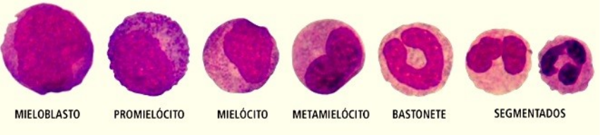 Leucopoese Células do sangue que podemos chamar de série branca, estão envolvidos diretamente no sistema imunológico do organismo, combatem infecções virais, bacterianas, parasitárias e fúngicas; Granulopoiese MIELOBLASTO: · Alta ou média relação núcleo citoplasma; · Citoplasma escasso de coloração lilás escuro ou basofílico; · Pode apresentar bastonete de Auer; · Núcleo com cromatina frouxa por vezes apresenta nucléolos visíveis; PROMIELOCITO: · Núcleo discretamente excêntrico; · Núcleo com cromatina frouxa, por vezes apresenta nucléolos visíveis; · Pode apresentar complexo de golgi de cor mais Clara; · Granulação primária de cor acastanhada ou azurófila; MIELÓCITO · Núcleo excêntrico; · núcleo arredondado com cromatina intermediária; · Citoplasma lilás ou fracamente basofílico; · Granulação começa a se tornar específica; METAMIELÓCITO · Citoplasma com granulação fina, mais intensa; · Grânulos específicos maduros; · Núcleo em forma de rim ou feijão cromatina condensada; · Núcleo com proporção maior pode pegar pouco mais da metade do citoplasma; BASTONETES · Citoplasma com fina granulação; · O núcleo em formato de C ou S; · Grânulos específicos ou maduros; · Ligeiramente menos maduros que os neutrófilos segmentados; Leucócito NEUTRÓFILO: · Valor de referência, 1600 a 8000 mm; · Citoplasma de granulação lilás com grânulos específicos lilás ou azul; · Núcleo com cromatina densa, de 3 a 4 lóbulos; · Defesa bacteriana; EOSINÓFILO: · Valor de referência, zero a 500 mm³; · Citoplasma coberto de granulação grosseira, de coloração alaranjada; · Defesa parasitária ou alérgica; · Núcleo com cromatina densa e 2 lóbulos; BASÓFILO: · Valor de referência Zero a 200 mm³; · Presente em Alergias; · Granulação grosseira, de coloração arroxeada; · Núcleo com cromatina densa 2 lóbulos; LINFÓCITO: · Valor de referência, 900 a 4000 mm³; · Tipos B e T; · Citoplasma escasso e basofílico; · Defesa viral; · Núcleo esférico com cromatina densa; MONÓCITO: · Valor de referência, 100 a 1000 mm³; · Célula Fagocítica; · Classificação como a granulócito, porém possui granulação extremamente fina, praticamente imperceptível em microscopia; · Defesa viral e bacteriana; · Núcleo de várias formas; Granulação tóxica dos neutrófilos - Ocorre a infecção bacteriana Linfócito reativos - Infecções virais; Desvio à esquerda. Consideramos desvio à esquerda quando temos granulócitos imaturos no sangue periférico, ocorrem processos infecciosos, leucemias ou tratamentos de patologia relacionados à medula óssea. São eles: bastonetes, metamielócito, mielócito, promielócito e até mesmo blastos. image4.png image5.png image1.jpeg image2.jpeg image3.png