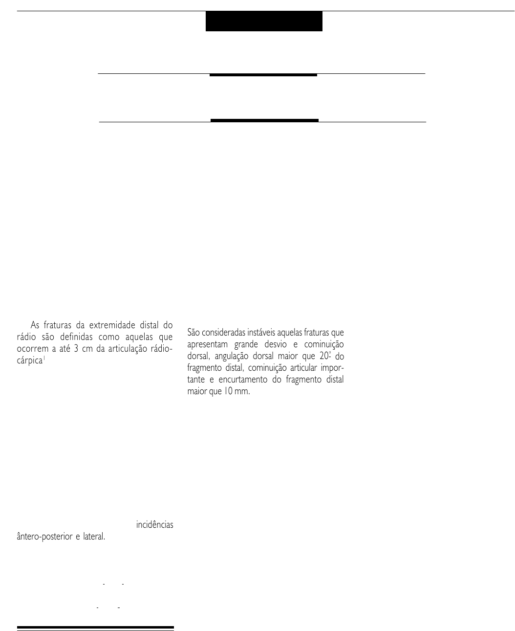 Rev Assoc Med Bras 2004; 50(1): 55-61 55 FRATURAS DO RÁDIO DISTAL RESUMO – OBJETIVOS. O objetivo deste trabalho foi determinar o grau de reprodutibilidade intra e interobservador em relação às classificações de Frykman, AO e Universal para as fraturas distais do rádio. MÉTODOS. Neste estudo foram selecionadas 40 radiografias de fraturas distais do rádio que foram classificadas por ortopedistas de centros e nível de experiência diferentes, determinando-se o grau de reprodutibilidade intra e interobservador através do método estatístico Kappa. RESULTADOS. A concordância intra-observador média observada INTRODUÇÃO As fraturas da extremidade distal do rádio são definidas como aquelas que ocorrem a até 3 cm da articulação rádio- cárpica1. São de grande importância e inte- resse, pois correspondem a um sexto de todas as fraturas atendidas nas salas de emergências. Nos Estados Unidos e no Reino Unido uma em cada grupo de 500 pessoas sofre essa fratura por ano, causan- do um alto custo socioeconômico. A faixa etária mais acometida é entre 60 e 69 anos, principalmente em mulheres, mas nota-se uma elevação da prevalência entre jovens devido aos acidentes de trânsito e traumas esportivos2. Para se determinar o perfil radiográfico das fraturas do rádio distal são necessárias radio- grafias de boa qualidade nas incidências ântero-posterior e lateral. Três medidas rela- cionadas ao eixo longitudinal do rádio podem ser avaliadas e servem de parâmetros para a redução. A inclinação volar da superfície arti- cular do rádio varia de 11º a 12º, sendo obser- vada na incidência em perfil. A inclinação radial tem, em média, de 22º a 23º, e, juntamente com altura radial, que mede de 11 a 12 mm, são avaliadas na incidência ântero-posterior3. São consideradas instáveis aquelas fraturas que apresentam grande desvio e cominuição dorsal, angulação dorsal maior que 20º do fragmento distal, cominuição articular impor- tante e encurtamento do fragmento distal maior que 10 mm. Fraturas com essas caracte- rísticas tendem a perder a redução4. Certos padrões de fraturas como fraturas- luxações rádio-cárpicas e fraturas do processo estilóide radial muito desviadas têm, obrigato- riamente, lesões concomitantes de ligamentos intrínsecos ou extrínsecos do carpo, que devem ser consideradas quando classificamos as fraturas do rádio distal, uma vez que influen- ciarão no resultado5. Existem inúmeras classificações para fraturas da extremidade distal do rádio. Segundo Müller et al. (1987), qualquer siste- ma de classificação realmente útil deve considerar o tipo e a gravidade da fratura, servir como base para o tratamento e de guia para a avaliação do resultado6. Frykman (1967) estabeleceu uma classifi- cação que levava em conta o envolvimento ou não da articulação rádio-cárpica e rádio-ulnar e a presença ou ausência de fratura do pro- cesso estilóide ulnar. Apesar de ser mundial- mente conhecida e muito citada na literatura, falha porque não considera o desvio inicial da fratura, nem o encurtamento do rádio. *Correspondência: Rua Emílio Ribas, 800 – Apt. 1 Cep: 13025-141 – Campinas – SP Fone: (19) 3788-7750/3254-0220 E-mail: belanger@sigmanet.com.br foi moderada para as classificações de Frykman e Universal e leve para o sistema AO. A reprodutibilidade média interobservador foi leve nas duas leituras para as classificações de Frykman e Universal e desprezível na segunda leitura da classificação AO. CONCLUSÃO. Todas as classificações utilizadas apresentaram reprodutibilidade interobservador questionável, comprometendo o uso dos três sistemas avaliados UNITERMOS: Classificação. Rádio distal. Fraturas. Reprodutibilidade. Artigo Original FRATURAS DO RÁDIO DISTAL: AVALIAÇÃO DAS CLASSIFICAÇÕES OSVALDO MENDES DE OLIVEIRA FILHO, WILLIAM DIAS BELANGERO*, JOÃO BATISTA MENDES TELES Trabalho realizado na Faculdade de Ciências Médicas da Universidade Estadual de Campinas (Unicamp), Campinas, SP, e Centro de Ciências da Saúde da Universidade Federal do Piauí, Teresina, Piauí, PI. A classificação de Frykman tem uma importân- cia fundamental por ter chamado a atenção à ulna distal e à articulação rádio-ulnar distal, muitas vezes relegada a um segundo plano durante a redução7 (Figura 1). A classificação AO foi criada em 1986 e revisada em 1990. Ela considera a gravidade da lesão óssea e serve como base para o trata- mento e avaliação dos resultados. Existem três tipos básicos: extra-articular, articular parcial e articular completa. Os três grupos são organi- zados em ordem crescente de gravidade com relação à complexidade morfológica, dificulda- de de tratamento e prognóstico. É, sem dúvi- da, a classificação mais completa, mas sua reprodutibilidade intra e interobservador tem sido um problema quando o grupo e subgrupo estão sendo avaliados8,9. Às vezes, não é pos- sível determinar todas as linhas de fraturas através de radiografias simples, sendo neces- sárias incidências radiográficas especiais ou tomografia. O grupo A (extra-articular) não envolve a articulação rádio-cárpica, o grupo B (fraturas articulares parciais) envolve a articula- ção rádio-cárpica, mas uma porção da super- fície articular permanece em continuidade com a diáfise e o grupo C (articular completa) apresenta separação completa da articulação com a diáfise. Estes três principais tipos são subdivididos em três grupos, e cada grupo, em três subgrupos. Dessa forma, existem 27 dife- rentes padrões de fraturas que dependem da Poliana Realce Poliana Sublinhado Poliana Realce Poliana Realce Poliana Sublinhado Rev Assoc Med Bras 2004; 50(1): 55-6156 OLIVEIRA FILHO OM ET AL. estabilidade, impacto, cominuição, redu- tibilidade e localização dos fragmentos2,10. Esta classificação é a adotada pela Associa- ção de Trauma Ortopédico dos Estados Unidos e uma das mais usadas 