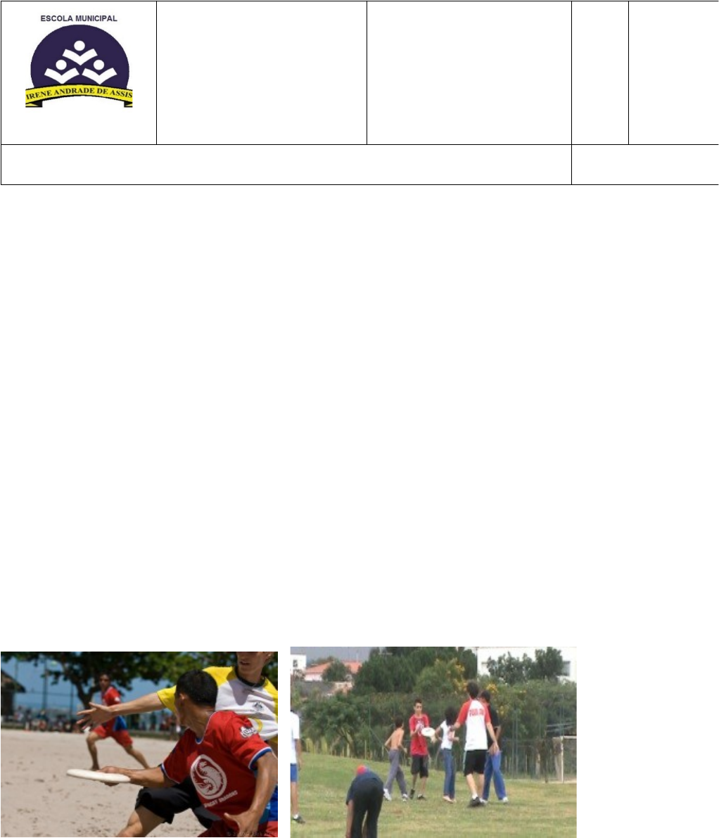 Escola Municipal Irene Andrade de Assis Professor (as): Josicleide Jesus e Marcela Barreto Ano: 8º Turmas: MA, MB, VA, VB Esporte de Invasão – FRISBEE 1ª Unidade História do Frisbee O Frisbee surgiu na cidade de Connecticut (Estados Unidos), quando William Russel Frisbie cria sua confeitaria, a “Frisbie Pie” (Tortas Frisbie) em 1871. Após comerem as tortas alguns universitários divertiam-se ao atirar as formas de papel ao céu. Deu tão certo virou competição. Walter Frederick Morrisson trocou o papel pelo plástico, para dar maior durabilidade e tornar a brincadeira mais emocionante. Em 1955 uma grande fábrica americana compra a ideia e começa a comercializar o brinquedo com o nome de Frisbee. Devido ao termo Frisbee ser uma marca registada, o nome da modalidade foi alterado para evitar conflitos futuros, passando-se a chamar: ultimate. O ultimate chegou ao Brasil em meados de 1980, sendo utilizado como uma brincadeira. Inicialmente era apenas um disco lançado, para alguém, e hoje em dia se tornou um esporte que vem ganhando espaço com o passar do tempo. Como é o Frisbee? O frisbee é um esporte coletivo de invasão praticado com um disco. O objetivo do jogo é marcar pontos passando o disco para o companheiro de equipe na área adversária. Pode ser jogado em campo/relva, com 100 m de comprimento e 37 m de largura, na praia ou ao ar livre são 2 equipes com 7 jogadores, no pavilhão, o piso parece com o handebol contendo 5 jogadores em cada equipe. Cada modalidade tem regras e dimensões de área de jogo diferentes, as equipes podem ser mistas (homens e mulheres). Regras · O Ultimate não possui juiz, · Para marcar um ponto, os jogadores devem lançar o disco para um membro da sua equipe e este deve apanhar o disco dentro da zona de marcação no campo adversário, compreendida entre a linha de fundo, antes que o disco caia ao chão. · Uma coisa é garantida: se gosta de correr e de se entregar totalmente ao jogo, o ultimate frisbee não o irá dececionar! Os adeptos de exercícios fracionados encontrarão o seu desafio. · O princípio do jogo é muito simples: para marcar um ponto, os jogadores devem lançar o disco para um membro da sua equipa e este deve apanhar o disco dentro da zona de marcação no campo adversário, compreendida entre a linha de fundo (com 37 m de largura) e outra linha situada a 16 m desta. Ganha a primeira equipa a marcar 17 pontos (ou menos pontos, consoante a categoria). · À semelhança do tchoukball ou do flag football, não pode haver contacto físico entre os adversários. O jogador que estiver na posse do disco tem 10 segundos para o lançar a outro membro da sua equipa. Não pode correr com o disco, mas pode fazer rotação sobre o seu pé de apoio. O disco pode ser lançado em qualquer direção (para a frente, para trás ou para os lados), conforme as oportunidades de jogo. Se o disco cair ou for intercetado, mudará de mão: os atacantes passarão a ser defesas e vice-versa. * Os benefícios do ultimate do Frisbee Este desporto permite também apurar o sentido de estratégia: uma excelente noção de espaço em campo e um bom posicionamento são fatores essenciais para vencer. Por último, e como cereja no topo de um bolo já de si bem recheado, o ultimate frisbee permite desenvolver o espírito de equipa, muito importante para alcançar o objetivo da vitória. Atividade sobre o Frisbee 1ª) Em qual cidade surgiu o Frisbee? O Frisbee surgiu na cidade de Connecticut (Estados Unidos). 2ª) Em qual ano Russel Frisbie cria sua confeitaria, a “Frisbie Pie”? No ano de 1871 3ª) O termo Frisbee é uma marca registada, o nome da modalidade foi alterado para evitar conflitos futuros, passando-se a ser chamado de que? ultimate 4ª) Em qual ano o ultimate chegou no Brasil? No ano de 1980 5ª) Marque a alternativa correta: O Frisbee é um esporte de? a) De parede b) Invasão c) Marca d) De rede 6ª) Qual o objetivo do jogo Frisbee? O objetivo do jogo é marcar pontos passando o disco para o companheiro de equipe na área adversária. 7ª) Qual campo é indicado para jogar o Frisbee ? E qual a metragem desse campo? Campo/relva, com 100 m de comprimento e 37 m de largura. image3.jpeg image4.jpeg image1.jpeg image2.jpeg