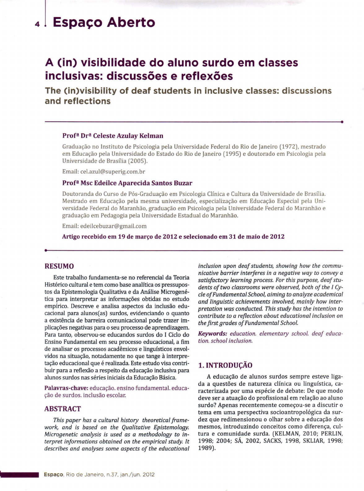Espaço Aberto A (in) visibilidade do aluno surdo em classes inclusivas: discussões e reflexões The (in)visibility of deaf students in inclusive classes: discussions and reflections Profª Drª Celeste Azulay Kelman Graduação no Instituto de Psicologia pela Universidade Federal do Rio de Janeiro (1972) , mestrado em Educação pela Universidade do Estado do Rio de Janeiro (1995) e doutorado em Psicologia pela Universidade de Brasília (2005) . Email: cel.azul@superig.com.br Profª Msc Edeilce Aparecida Santos Buzar Doutoranda do Curso de Pós-Graduação em Psicologia Clínica e Cultura da Universidade de Brasília. Mestrado em Educação pela mesma universidade, especialização em Educação Especial pela Uni versidade Federal do Maranhão, graduação em Psicologia pela Universidade Federal do Maranhão e graduação em Pedagogia pela Universidade Estadual do Maranhão. Email: edeilcebuzar@gmail.com Artigo recebido em 19 de março de 2012 e selecionado em 31 de maio de 2012 RESUMO Este trabalho fundamenta-se no referencial da Teoria Histórico cultural e tem como base analítica os pressupos tos da Epistemologia Qualitativa e da Análise Microgené tica para interpretar as informações obtidas no estudo empírico. Descreve e analisa aspectos da inclusão edu cacional para alunos(as) surdos, evidenciando o quanto a existência de barreira comunicacional pode trazer im plicações negativas para o seu processo de aprendizagem. Para tanto, observou-se educandos surdos do 1 Ciclo do Ensino Fundamental em seu processo educacional, a fim de analisar os processos acadêmicos e linguísticos envol vidos na situação, notadamente no que tange à interpre tação educacional que é realizada. Este estudo visa contri buir para a reflexão a respeito da educação inclusiva para alunos surdos nas séries iniciais da Educação Básica. Palavras-chave: educação. ensino fundamental. educa ção de surdos. inclusão escolar. ABSTRACT This paper has a cultural history theoretical frame work, and is based on the Qualitative Epistemology. Microgenetic analysis is used as a methodology to in terpret informations obtained on the empirical study. lt describes and analyses some aspects of the educational Espaço, Rio de Janeiro, n.37, jan./jun . 2012 inclusion upon deaf students, showing how the commu nicative barrier interferes in a negative way to convey a satisfactory learning process. For this purpose, deaf stu dents oftwo classrooms were observed, both of the I Cy cle of Fundamental School, aiming to analyze academical and linguistic achievements involved, mainly how inter pretation was conducted. This study has the intention to contribute to a reflection about educational inclusion on the first grades of Fundamental School. Keywords: education. elementary school. deaf educa tion. school inclusion. 1. INTRODUÇÃO A educação de alunos surdos sempre esteve liga da a questões de natureza clínica ou linguística, ca racterizada por uma espécie de debate: De que modo deve ser a atuação do profissional em relação ao aluno surdo? Apenas recentemente começou-se a discutir o tema em uma perspectiva socioantropológica da sur dez que redimensionou o olhar sobre a educação dos mesmos, introduzindo conceitos como diferença, cul tura e comunidade surda. (KELMAN, 2010; PERLIN, 1998; 2004; SÁ, 2002, SACKS, 1998, SKLIAR, 1998; 1989). r Ainda nos inquieta a indagação "Como o aluno sur do aprende a partir de suas singularidades?", o que nos faz seguir pesquisando em diferentes áreas das ciências humanas, como a pedagogia, a linguística, a psicologia e as ciências sociais. Estas áreas constituem o "caldo" onde se estudam os processos de ensino e aprendiza gem, principalmente quando se percebe a necessidade de redimensionar a educação de surdos. A Política Nacional de Educação Especial na Pers pectiva da Educação Inclusiva (MEC, 2008) prevê que a educação para alunos surdos se dê em escolas co muns, em uma perspectiva bilíngue - Língua Portu guesa/Língua Brasileira de Sinais (Libras), isto é, o ensino escolar deve ser desenvolvido em duas línguas. Este documento ressalta ainda que o ensino da Língua Portuguesa na modalidade escrita deve ser entendida como segunda língua, que os serviços de tradutor/ intérprete de Libras e Língua Portuguesa e o ensino da Libras para os demais alunos da escola devem ser ofertados. A questão que se coloca é como tem sido entendida a educação para surdos em nosso país? Como aparece ou subtende-se o sujeito surdo nas políticas públicas? Que concepção de inclusão escolar está sendo adota da? Esta forma de organização do ensino escolar, em classes comuns, tem atendido de fato as especificida des do aluno surdo? O bilinguismo, previsto pela legis lação, é o mesmo proposto pelas Ong's representativas da comunidade surda? As escolas públicas que tentam implementar a educação de surdos em escolas regula res, ainda com a presença de tradutores e intérpretes de Libras, estão efetivamente assegurando a inclusão escolar do aluno. surdo? Ou seja, o acesso à comuni cação, à informação e principalmente ao aprendizado está sendo garantido? Neste estudo, descrevemos e analisamos condições de salas de aulas comuns do primeiro ciclo do Ensino Fundamental, em que os estudantes surdos são mui tas vezes ignorados, isolados, geográfica ou linguisti camente, ressaltando as implicações para o processo educacional. Observamos em muitas ocasiões, que estes estudan tes não têm acesso a diversas informações veiculadas na sala de aula, entre elas, de cunho acadêmico científi co e de valores ético-morais, ou possuem acesso restri to, quando um dos profissionais ou estudantes ouvintes tentam traduzir o que está sendo dito para a Língua Brasileira de Sinais. O presente artigo nos propõe repensar a educação para surdos, a partir de um alicerce linguístico, onde a Língua Brasileira de Sinais deixe de ser coadjuvante do proce
