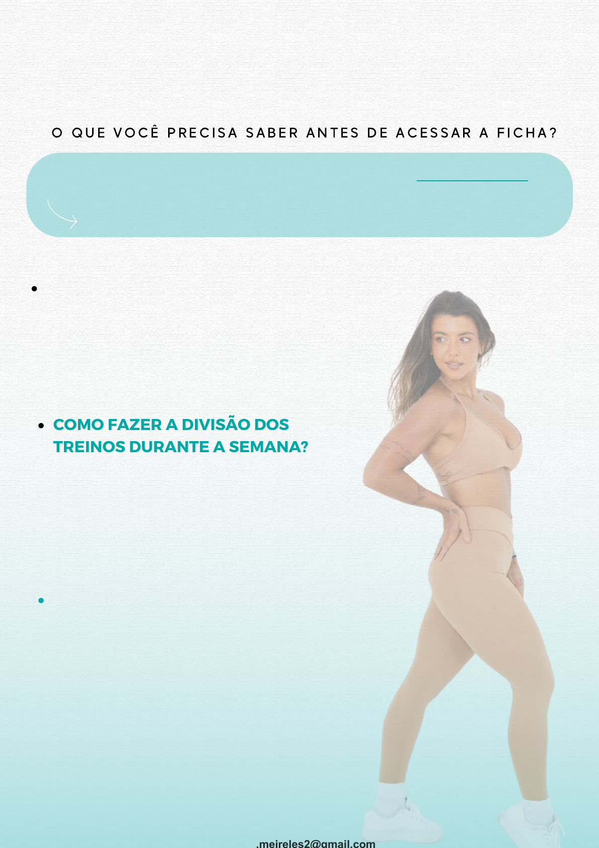 COM O IDENTIFICAR O SEU NÍVEL? Para identificar o seu nível, é necessário que você assista o vídeo que está dentro desse módulo "SAIBA AQUI SE VOCÊ É INTERMEDIÁRIO". HIPERTROFIA REDUZIDO ANTES DE QUALQUER COISA: acesse a temporada "COMECE AQUI" e clique no ep. 3 - Como funcionam os treinos de academia?" É de extrema importância que você, antes de tudo, conheça nossa metodologia. ------------------------------------------------------------------------------------------------------------------------------------------------------------ O Q U E V O C Ê P R E C I S A S A B E R A N T E S D E A C E S S A R A F I C H A ? C OMO FAZER A DIVISÃO DOS TREINOS DURANTE A SEMANA? Basta você acessar a temporada 2: "SUA AGENDA DE TREINO" e baixar os materiais que disponibilizamos para vocês! As divisões são feitas para quem treina 3x, 4x, 5x e 6x na semana. CASO NÃO TENHA ALGUM APARELHO NA MINHA ACADEMIA, COMO FAÇO A SUBSTITUIÇÃO? Disponibilizamos pra vocês aqui nessa mesma temporada uma lista com as substituições dos exercícios, mas caso o seu exercício não esteja nela você pode estar deixando um comentário aqui e o nosso profissional vai auxiliar você da melhor forma. CONTINUA NA PRÓXIMA FOLHA A V A N Ç A D O Licensed to Tatiane de Oliveira Meireles - tatiane.meireles2@gmail.com O treino B3 é uma junção do treino B1 e B2, então caso você tenha dúvida na execução de algum exercício, basta você assistir um dos dois vídeos (b1 ou b2) que a execução estará lá. - Parte de ombro, peito ou tríceps do B3 - estará no vídeo de execução do B1 - Parte de costas e bíceps do treino B3 - estará no vídeo de execução do B2 ------------------------------------------------------------------------------------------------------------------------------------------------------------ O treino D é uma junção do treino A e C, então caso você tenha dúvida na execução de algum exercício, basta você assistir um dos dois vídeos (A ou C) que a execução estará lá. - Parte de quadríceps do D - estará no vídeo de execução do A - Parte de glúteo e posterior do treino D - estará no vídeo de execução do C VOCÊ NÃO ENCONTRARÁ O VÍDEO DE EXECUÇÃO DOS TREINOS B3 E D, MAS VOU TE EXPLICAR O MOTIVO: Qualquer outra dúvida que você tenha, pode deixar um comentário aqui, ou nos contatar pelo inbox do insta! Estamos à disposição. Um beijo, meus amores e bom treinãaaao! A V A N Ç A D O HIPERTROFIA REDUZIDO Licensed to Tatiane de Oliveira Meireles - tatiane.meireles2@gmail.com ALONGAMENTO - INFERIORES 1x 10 repetições 2x 8 repetições cada lado Caso sua academia não tenha elástico, faça com a sua mão. A outra mão você usará para empurrar sua coxa garantindo que seu joelho fique estendido (não empurre seu joelho). OU Faça 10 movimentos e, no ultimo, sustente 10 segundos na frente para cada lado. V O C Ê V A I I N C L U I R E S S E S A L O N G A M E N T O S A N T E S D E T O D O T R E I N O A , C E D ( E M T O D O S O S N I V E I S ) MOBILIDADE DINÂMICA DE QUADRIL + ABERTURA DE QUADRIL1. ------------------------------------------------------------------------------------------------------------------------------------------------------------ 2. ALONGAMENTO POSTERIOR, TORNOZELO + ADUTOR DE COXA - 1 SÉRIE 3. ALONGAMENTO POSTERIOR DE COXA - 2 SÉRIES DE 40 SEG CADA PERNA Licensed to Tatiane de Oliveira Meireles - tatiane.meireles2@gmail.com Faça 30 segundos para cada lado. OU Faça por 30 segundos o primeiro alongamento e 40 segundos o segundo alongamento tentando forçar sua perna para baixo (devagar e com cuidado). Faça 20 repetições no total (10 para cada lado) e tente encostar a ponta do seus dois joelhos no chão (pode apoiar a mão atrás para equilibrar). 4. ALONGAMENTO RETO FEMURAL - 2 SÉRIES 5. ALONGAMENTO DE ADUTORES - 1 SÉRIE 6. MOBILIDADE DINÂMICA - 1 SÉRIE Licensed to Tatiane de Oliveira Meireles - tatiane.meireles2@gmail.com 2 séries de 30 segundos do primeiro e 1 série de 8 movimentos do segundo. 1 série de 16 repetições totais do primeiro + 2 séries de 20 seg para cada lado do segundo. 2 séries de 30 segundos cada braço. ALONGAMENTO - SUPERIORES V O C Ê V A I I N C L U I R E S S E S A L O N G A M E N T O S A N T E S D E T O D O T R E I N O B , B 1 , B 2 E B 3 ( E M T O D O S O S N I V E I S ) ------------------------------------------------------------------------------------------------------------------------------------------------------------ 1. ALONGAMENTO PARA LOMBAR - 1 SÉRIE 2. ALONGAMENTO PARA OMBROS - 2 SÉRIES 3 . A L O N G A M E N T O P A R A T R I C E P S - 2 S É R I E S Licensed to Tatiane de Oliveira Meireles - tatiane.meireles2@gmail.com 1 série de 15 movimentos indo para frente e para trás (sem tirar a palma da mão do chão). 1 série de 40 segundos do primeiro + 20 segundos para cada lado do segundo. 16 repetições totais (8 para cada lado) 4 . A L O N G A M E N T O D E P U N H O - 1 S É R I E 5 . A L O N G A M E N T O P E I T O R A L - 1 S É R I E 6 . A L O N G A M E N T O D I N Â M I C O - 1 S É R I E Licensed to Tatiane de Oliveira Meireles - tatiane.meireles2@gmail.com N Í V E L - A V A N Ç A D O I N F E R I O R E S C O M F O C O E M Q U A D R Í C E P S H I P E R T R O F I A F I C H A R E D U Z I D A D E A C A D E M I A N A T F L I X F I C H A A M A I O - 2 0 2 4 Licensed to Tatiane de Oliveira Meireles - tatiane.meireles2@gmail.com H I P E R T R O F I A - A V A N Ç A D O FORTALECIMENTO DE CORE E ATIVAÇÃO MUSCULAR T R E I N O A - ( I N F E R I O R C O M F O C O E M Q U A D R Í C E P S ) 1ª série: apenas com peso corporal, comece realizando um total de 10 repetições do agachamento unipodal com joelho encostando o solo e subindo e, sem descanso, repita as 10 repetições com a outra perna. Para finalizar, pegue um halter leve, coloque na sua frente e finalize realizando 10 repetições totais do agachamento com retrocesso alternado (1 agachamento + 1 retrocesso com cada 
