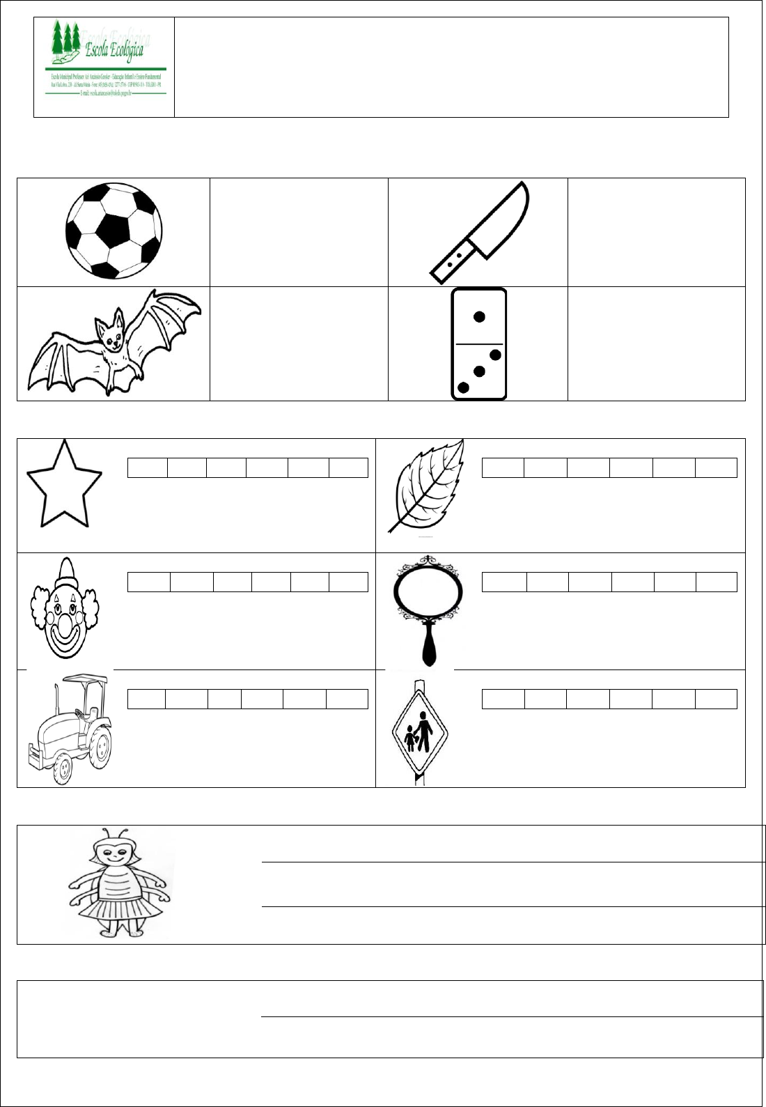 ESCOLA MUNICIPAL ECOLÓGICA PROFESSOR ARI ARCÁSSIO GOSSLER ALUNO(A): ____________________________________________________________ TURMA: 1 º ANO C PROFESSORA: JANETE DATA: _____ / _____/2019 AVALIAÇÃO DE LÍNGUA PORTUGUESA - LEITURA 1 – CIRCULE O NOME DA PALAVRA DE ACORDO COM O NOME DA FIGURA. BOCA BODE BOLA FADA FALA FACA MORDIDA MORCEGO MACACO DOMINÓ DOIDO DITADO 2 - PINTE AS SíLABAS E REESCREVA A PALAVRA: CA ES BE TRE DO LA - _______________________________ _ CI LHA VO TRE FO LA - _________________________________ _ LHA NHA BA TO PA ÇO - _______________________________ _ NHO ES LHO TRE PE LA - _________________________________ _ BA DRA LI TOR DOR TRA - _______________________________ _ PA CA BLA DA PLA FA - _________________________________ _ 3 – PINTE O TÍLULO DA CANTIGA: O GALO E A GALINHA A BARATA DIZ QUE TEM ATIREI OPAU NO GATO O SAPO NÃO LAVA O PÉ A DONA ARANHA O GALO E A GALINHA