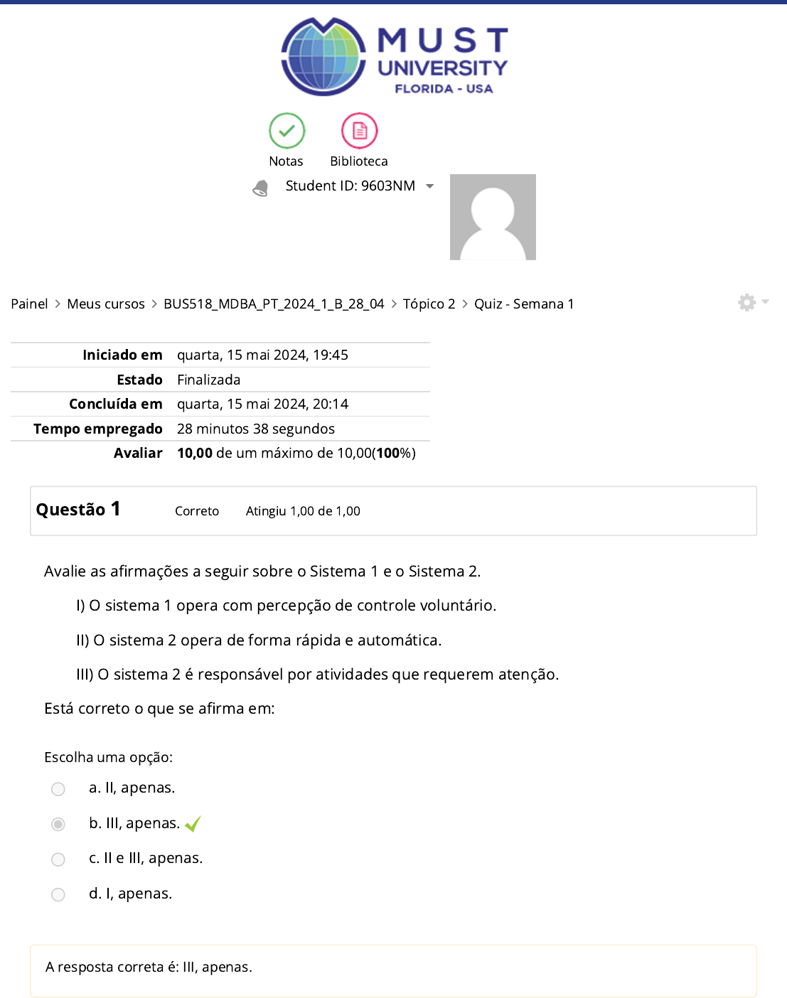 Painel Meus cursos BUS518_MDBA_PT_2024_1_B_28_04 Tópico 2 Quiz - Semana 1 Student ID: 9603NM Notas Biblioteca Iniciado em quarta, 15 mai 2024, 19:45 Estado Finalizada Concluída em quarta, 15 mai 2024, 20:14 Tempo empregado 28 minutos 38 segundos Avaliar 10,00 de um máximo de 10,00(100%) Questão 1 Correto Atingiu 1,00 de 1,00 Avalie as a�rmações a seguir sobre o Sistema 1 e o Sistema 2. I) O sistema 1 opera com percepção de controle voluntário. II) O sistema 2 opera de forma rápida e automática. III) O sistema 2 é responsável por atividades que requerem atenção. Está correto o que se a�rma em: Escolha uma opção: a. II, apenas. b. III, apenas. c. II e III, apenas. d. I, apenas. A resposta correta é: III, apenas. https://my.mustedu.com/my/ https://my.mustedu.com/course/view.php?id=1118 https://my.mustedu.com/course/view.php?id=1118#section-2 https://my.mustedu.com/mod/quiz/view.php?id=89915 https://my.mustedu.com/ https://my.mustedu.com/ https://my.mustedu.com/user/view.php?id=9392&course=1118 https://my.mustedu.com/custom/minhas_notas.php Questão 2 Correto Atingiu 1,00 de 1,00 Observe os exemplos de análise de negócios na coluna A e suas de�nições apresentadas na Coluna B. Coluna A Coluna B 1. Relatórios ( ) A previsão de eventos futuros usando dados históricos 2. Tendências ( ) O resumo de dados histórico 3. Segmentação ( ) A identi�cação de padrões subjacentes em dados de séries temporais 4. Modelagem preditiva ( )A identi�cação de semelhanças nos dados Assinale a alternativa que adequadamente relaciona os exemplos a suas de�nições (de cima para baixo). Escolha uma opção: a. 1 – 2 – 3 – 4 b. 2 – 1 – 3 - 4 c. 4 – 3 – 2 – 1 d. 4 – 1 – 2 - 3 A resposta correta é: 4 – 1 – 2 - 3 Questão 3 Correto Atingiu 1,00 de 1,00 Assinale a alternativa que apresenta uma das estratégias para melhorar o processo de tomada de decisão. Escolha uma opção: a. Raciocinar intuitivamente b. Entender seus vieses e não dos outros c. Tomar a visão do agente interno d. Usar ferramentas de análise de decisão A resposta correta é: Usar ferramentas de análise de decisão Questão 4 Correto Atingiu 1,00 de 1,00 Em seus estudos Kahneman (2012) explica que situação extremas ou excepcionais costumam ser seguidas de situações médias. Ou seja, se um aprendiz de piloto de avião se sai muito bem ou muito mal em um voo, o mais provável é que o próximo voo seja “normal”, ou seja, na média. A heurística que explica esse fenômeno é denominada: Escolha uma opção: a. Regressão à média b. Lei dos pequenos números c. Causas que superam as estatísticas d. Âncoras A resposta correta é: Regressão à média Questão 5 Correto Atingiu 1,00 de 1,00 A heurística de�nida como o processo de julgar a frequência segundo a facilidade com que as ocorrências vêm à mente é a: Escolha uma opção: a. Representatividade b. Lei dos pequenos números c. Ciência da disponibilidade d. Âncoras A resposta correta é: Ciência da disponibilidade Questão 6 Correto Atingiu 1,00 de 1,00 Assinale a alternativa que completa adequadamente as lacunas do texto a seguir: A análise de negócios pode ser considerada como um processo que visa transformar ________________ em informação para que se possa agregar ____________ às organizações por meio de insights. Alguns dos exemplos mais comuns de análise de negócios incluem ____________, tendências, segmentação e modelagem preditiva. Escolha uma opção: a. dados, valor, relatórios. b. intuição, valor, relatórios c. intuição, subjetividade, cálculos. d. dados, intuição, relatórios. A resposta correta é: dados, valor, relatórios. Questão 7 Correto Atingiu 1,00 de 1,00 Identi�que a alternativa correta sobre o papel das heurísticas na tomada de decisões: Escolha uma opção: a. As heurísticas podem levar a erros graves de julgamento, pois, embora sejam úteis para enfrentar ambientes complexos, elas simpli�cam o processo de decisão de maneira que pode ignorar informações relevantes. b. As heurísticas garantem que as decisões tomadas sejam sempre racionais e livres de vieses, uma vez que são regras práticas baseadas em experiências anteriores.II, apenas. c. As heurísticas são estratégias complexas que exigem um alto nível de processamento cognitivo e análise detalhada de todas as informações disponíveis. d. As heurísticas só são aplicadas em contextos individuais, sendo ine�cazes em ambientes competitivos onde decisões rápidas são menos prevalentes. A resposta correta é: As heurísticas podem levar a erros graves de julgamento, pois, embora sejam úteis para enfrentar ambientes complexos, elas simpli�cam o processo de decisão de maneira que pode ignorar informações relevantes. Questão 8 Correto Atingiu 1,00 de 1,00 Apesar dos estereótipos poderem nos ajudar em algumas situações em muitas outras elas podem nos levar a erros sérios de julgamento. Indique a alternativa que apresenta a heurística que explica por que os estereótipos podem nos levar a problemas de decisão. Escolha uma opção: a. Lei dos pequenos números b. Âncoras c. Representatividade d. Ciência da disponibilidade A resposta correta é: Representatividade Questão 9 Correto Atingiu 1,00 de 1,00 Avalie as a�rmações a seguir sobre business analytics e vantagem competitiva. I) Tomar melhores decisões levam a melhores resultados. II) O business analytics utiliza ferramentas como análise SWOT e Cinco Forças de Porter. III) o Business Analytics possibilita que a empresa se diferencie, gera economia de escala e escopo. É correto o que se a�rma em: Escolha uma opção: a. I, apenas b. I, II, III c. I e III, apenas d. I e II, apenas A resposta correta é: I e III, apenas Questão 10 Correto Atingiu 1,00 de 1,00 Identi�que a alternativa que apresenta adequadamente os passos do processo de tomada de decisão. Escolha uma opção: a. De�na o problema; identi�que os