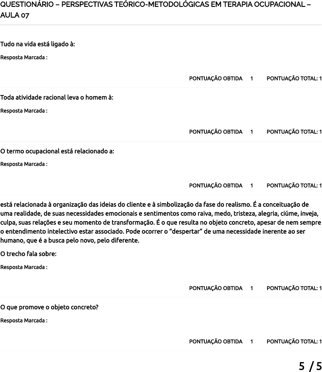 5 / 5 QUESTIONÁRIO – PERSPECTIVAS TEÓRICO-METODOLÓGICAS EM TERAPIA OCUPACIONAL – AULA 07 PONTUAÇÃO TOTAL: 1PONTUAÇÃO OBTIDA 1 Tudo na vida está ligado à: Resposta Marcada : cultura. PONTUAÇÃO TOTAL: 1PONTUAÇÃO OBTIDA 1 Toda atividade racional leva o homem à: Resposta Marcada : compreensão de algo. PONTUAÇÃO TOTAL: 1PONTUAÇÃO OBTIDA 1 O termo ocupacional está relacionado a: Resposta Marcada : emprego do tempo PONTUAÇÃO TOTAL: 1PONTUAÇÃO OBTIDA 1 está relacionada à organização das ideias do cliente e à simbolização da fase do realismo. É a conceituação de uma realidade, de suas necessidades emocionais e sentimentos como raiva, medo, tristeza, alegria, ciúme, inveja, culpa, suas relações e seu momento de transformação. É o que resulta no objeto concreto, apesar de nem sempre o entendimento intelectivo estar associado. Pode ocorrer o “despertar” de uma necessidade inerente ao ser humano, que é a busca pelo novo, pelo diferente. O trecho fala sobre: Resposta Marcada : Elaboração ou insight. PONTUAÇÃO TOTAL: 1PONTUAÇÃO OBTIDA 1 O que promove o objeto concreto? Resposta Marcada : a dinâmica da atividade na relação terapêutica ocupacional. Total de Pontos