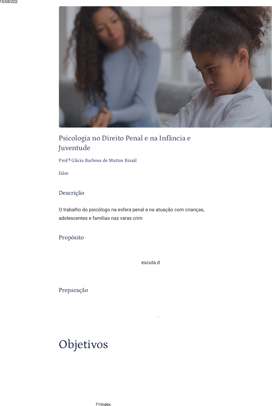 Psicologia no Direito Penal e na Infância e Juventude Prof.ª Glicia Barbosa de Mattos Brazil false Descrição O trabalho do psicólogo na esfera penal e na atuação com crianças, adolescentes e famílias nas varas criminais. Propósito Ampliar o conhecimento acerca dos contextos de atuação do psicólogo na Justiça, atuando em presídios e na escuta de crianças e adolescentes vítimas, por meio do Depoimento Especial. Preparação Antes de começar este conteúdo, tenha em mãos a Lei 10.792 de 2003, a Lei nº 7.210 de 1984, e a Lei 13.431 de 2017. Objetivos 15/08/2024, 08:13 Psicologia no Direito Penal e na Infância e Juventude https://stecine.azureedge.net/repositorio/00212hu/03271/index.html?brand=estacio# 1/33 Módulo 1 Psicologia e Direito Penal Analisar as formas de atuação do psicólogo no sistema penal. Módulo 2 Psicologia na infância e juventude Identificar os diferentes contextos e formas de atuação do psicólogo com crianças e adolescentes na Justiça. Este conteúdo descreve o papel do psicólogo no âmbito do Direito Penal, ressaltando a importância de sua atuação na garantia dos direitos. Para isso, apresenta-se um contexto histórico da atuação dos psicólogos nos presídios, que faziam parte das Comissões Técnicas de Classificação, e atualmente nas Audiências de Custódia. Em seguida, abordaremos os princípios do Estatuto da Criança e do Adolescente (ECA) e os direitos fundamentais das crianças e dos adolescentes, dando ênfase ao trabalho com esse grupo social. Discutiremos também o caminho percorrido por crianças e adolescentes testemunhas ou vítimas de violência, e a importância da escuta especializada como forma de promover uma escuta ética e não revitimizada. Ressaltamos a importância do psicólogo nos dois contextos, principalmente como uma ferramenta de garantia dos direitos e como figura promotora de intervenções sociais. Introdução 15/08/2024, 08:13 Psicologia no Direito Penal e na Infância e Juventude https://stecine.azureedge.net/repositorio/00212hu/03271/index.html?brand=estacio# 2/33 1 - Psicologia e Direito Penal Ao �m deste módulo, você será capaz de analisar as formas de atuação do psicólogo no sistema penal. Introdução da Psicologia na esfera penal Psicologia e Direito Penal A professora Glícia Brazil traz um panorama geral do papel do psicólogo no Direito Penal. Primórdios da Psicologia na esfera penal A atuação do psicólogo no Direito Penal surge em paralelo a uma mudança de paradigma relacionada ao senso de justiça e de direitos humanos, quando o Direito Penal passou a tratar dos fatos criminosos, 15/08/2024, 08:13 Psicologia no Direito Penal e na Infância e Juventude https://stecine.azureedge.net/repositorio/00212hu/03271/index.html?brand=estacio# 3/33 mas com a preocupação com o autor do fato, para que houvesse um mecanismo de controle a respeito dos direitos, da progressão de regime ou da necessidade de regressão de regime. A Comissão Técnica de Classificação (CTC), prevista na Lei de Execução Penal, tinha a função de averiguar o apenado no início do cumprimento da pena, por uma junta de profissionais, incluindo o psicólogo, para certificar sobre a progressão ou regressão de regime (antes da Lei nº 10.792/2003). A lei retirou da Comissão Técnica de Classificação o papel de acompanhamento da execução penal, deixando a cargo da Comissão o programa individualizador da pena privativa de liberdade do condenado ou preso provisório. A psicologia jurídica surgiu no sistema penitenciário brasileiro com a atuação do psicólogo na CTC: Art. 7º A Comissão Técnica de Classificação existente em cada estabelecimento será presidida pelo Diretor e composta, no mínimo, por 2 chefes de serviço, 1 psiquiatra, 1 psicólogo e 1 assistente social, quando se tratar de condenado à pena privativa de liberdade. Parágrafo único - nos demais casos a Comissão atuará junto ao Juízo da Execução e será integrada por fiscais do serviço social. (LEI 7.210/84) A mais recente forma de intervenção do psicólogo no sistema penal é na escuta do preso em flagrante antes das audiências de custódia, no sentido de elaborar relatório que auxilia o juízo criminal na sua convicção a respeito de manter ou não a prisão: Lançadas em 2015, as audiências de custódia consistem na rápida apresentação da pessoa que foi presa a um juiz, em uma audiência onde também são ouvidos Ministério Público, Defensoria Pública ou advogado do preso. O juiz analisa a prisão sob o aspecto da legalidade e a regularidade do flagrante, da necessidade e da adequação da continuidade da prisão, de se aplicar alguma medida cautelar e qual seria cabível, ou da 15/08/2024, 08:13 Psicologia no Direito Penal e na Infância e Juventude https://stecine.azureedge.net/repositorio/00212hu/03271/index.html?brand=estacio# 4/33 eventual concessão de liberdade, com ou sem a imposição de outras medidas cautelares. A análise avalia, ainda, eventuais ocorrências de tortura ou de maus-tratos, entre outras irregularidades. A implementação das audiências de custódia está prevista em pactos e tratados internacionais de direitos humanos internalizados pelo Brasil, como o Pacto Internacional de Direitos Civis e Políticos e a Convenção Americana de Direitos Humanos. Além disso, a realização das audiências de custódia foi confirmada pelo Supremo Tribunal Federal ao julgar, em 2015, a ADI 5240 e a ADPF 347. (CONSELHO NACIONAL DE JUSTIÇA, s. d.) Desde a entrada formal do psicólogo no Poder Judiciário, o Juízo Criminal dispõe de auxílio técnico de peritos psicólogos dos quadros dos tribunais que realizam avaliação psicológica da criança ou adolescente vítima do crime de estupro de vulnerável. Nesse caso, a perícia psicológica rege-se pelo art. 159 do Código de Processo Civil e encontra fundamento constitucional no art. 5º da Constituição Federativa da república do Brasil (CRFB): A
