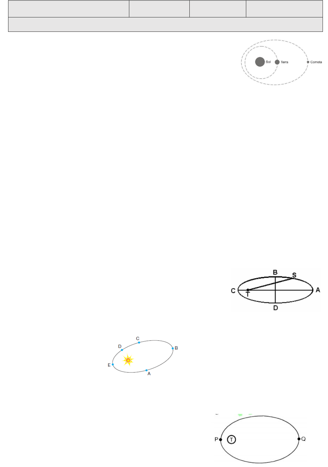 Escola: Padre Carlos Casavecchia Disciplina: Física Bimestre: 2º Ano/Série: 1º Série EM Professor: Adicleison Vela da Silva EXERCÍCIOS LEIS DE KEPLER 1º) (UFSM) Os avanços nas técnicas observacionais têm permitido aos astrônomos rastrear um número crescente de objetos celestes que orbitam o Sol. A figura mostra, em escala arbitrária, as órbitas da Terra e de um cometa (os tamanhos dos corpos não estão em escala). Com base na figura, analise as afirmações: I. Dada a grande diferença entre as massas do Sol e do cometa, a atração gravitacional exercida pelo cometa sobre o Sol é muito menor que a atração exercida pelo Sol sobre o cometa. II. O módulo da velocidade do cometa é constante em todos os pontos da órbita. III. O período de translação do cometa é maior que um ano terrestre. Está(ão) correta(s): a) apenas I b) apenas III c) apenas I e II d) apenas II e III e) I, II e III 2º) Com base nos seus conhecimentos acerca da Primeira Lei de Kepler, assinale a alternativa correta. a) A velocidade de translação de um planeta que orbita o Sol é sempre constante ao longo da órbita. b) A razão entre o quadrado do período orbital dos planetas que orbitam a mesma estrela e o cubo do raio médio de suas órbitas é constante. c) A órbita dos planetas em torno do Sol é elíptica e tem o Sol em um de seus focos. d) A linha imaginária que liga a Terra até o Sol varre áreas iguais em períodos iguais. e) A velocidade de translação dos planetas depende da distância em que o planeta se encontra do Sol. 3º) De acordo com a Terceira Lei de Kepler, conhecida como lei dos períodos, é falso afirmar que: a) o cubo do raio médio das órbitas é proporcional ao quadrado do período orbital. b) a razão entre o quadrado do período orbital e o cubo do raio médio da órbita terrestre é inversamente proporcional à massa do Sol. c) o quadrado do raio médio das órbitas é proporcional ao cubo do período orbital. d) a razão entre o quadrado do período orbital e o cubo do raio médio da órbita terrestre é inversamente proporcional à constante da gravitação universal. e) todas são falsas. 4º) Um satélite artificial S descreve uma órbita elíptica em torno da Terra, sendo que a Terra está no foco, conforme a figura adiante. Indique a alternativa correta: a) A velocidade do satélite é sempre constante. b) A velocidade do satélite cresce à medida que o satélite caminha ao longo da curva ABC. c) A velocidade do ponto B é máxima. d) A velocidade do ponto D é mínima. e) A velocidade tangencial do satélite é sempre nula 5º) (UFSE) Na figura, que representa esquematicamente o movimento de um planeta em torno do Sol, a velocidade do planeta é maior em: a) A b) B c) C d) D e) E 6º) Um satélite artificial move-se em torno da Terra T, numa órbita elíptica estacionária, como mostra a figura abaixo. Qual das alternativas apresenta uma opção correta, sendo as grandezas vetoriais envolvidas consideradas em módulo? a) O peso do satélite em P é o mesmo que em Q e diferente de zero b) O peso do satélite em P e em Q é zero c) A aceleração do satélite em P é maior do que em Q d) A aceleração do satélite em P é menor do que em Q e) A energia cinética do satélite em P é a mesma que em Q image1.jpeg image2.png image3.png image4.png