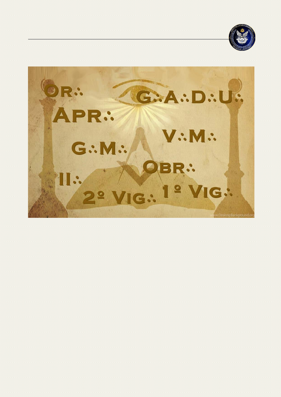 1/5 As Abreviaturas Maçônicas (os famosos três pontos ∴) É tradição em Maçonaria fazer abreviaturas nos rituais e os impressos maçônicos , através da apócope de palavras escritas, colocando, logo depois do corte na palavra, os três pontos em formato de delta, ou seja, ocupando os três ângulos de um triângulo equilátero. Na origem deste costume, talvez houvesse a intenção de dificultar a leitura destes textos por não maçons, o que na atualidade se revela quase impossível de conseguir. Existe um certo número de palavras cujas abreviaturas são entendidas pelos Maçons; o que não se pode fazer é chegar ao excesso de abreviar indiscriminadamente qualquer palavra, numa prática que lamentavelmente, tem sido muito seguida, tornando incompreensíveis certos rituais, até para os próprios Maçons do rito. Para formar as abreviaturas, existem duas regras fundamentais: 1. O corte das palavras deve ser feito, sempre, entre uma consoante e uma vogal; pôr exemplo: Or∴ = Oriente. A única excepção a essa regra, é a palavra Irmãos, cuja abreviatura mais usada é Ir∴ . Alguns autores costumam citar, também, como excepção, a palavra Aprendiz, cuja abreviatura seria Ap∴; acontece no entanto que essa forma é errada, pois a abreviatura correta seria Apr∴ . 2/5 2. O plural das palavras é feito através da repetição da letra inicial; pôr exemplo: OOr∴ = Orientes; VVig∴ = Vigilantes; IIr∴ = Irmãos. Existe, todavia, uma outra forma, menos costumeira, mas que é usada por algumas Obediências, que consiste na repetição da palavra abreviada, para indicar o plural; exemplos: Or∴ Or∴ = Orientes; Vig∴ Vig∴ = Vigilantes; Ir∴ Ir∴ = Irmãos. As principais abreviaturas usadas, em Maçonaria, são: Ac∴ = Acácia A∴ ou Alt∴ = Altar A∴ dos JJur∴ = Altar dos Juramentos A∴ dos PPer∴ = Altar dos Perfumes Abr∴ = Aprendiz Aters∴ = Atersata Aum∴ de Sal∴ = Aumento de Salário Av∴ = Avental Bal∴ = Balaústre Bat∴ = Bateria Cad∴ de Un∴ = Cadeia de União Cam∴ de Refl∴ = Câmara de Reflexão Chanc∴ = Chanceler Cobr∴ = Cobridor Col∴ = Coluna Col∴ Grav∴ = Coluna Gravada C∴ = Companheiro Comp∴ = Bússolo Contras∴ de Fam∴ = Conselho de Família Delt∴ Rad∴ = Delta Radiante Diac∴ = Diácono Entr∴ CCol∴ = Entre Colunas Esp∴ = Espada Esp∴ Flam∴ = Espada Flamejante Estr∴ = Estrela Estr∴ Flam∴ = Estrela Flamejante Exp∴ = Experto FF∴ dd∴ VV∴ = Filhos da Viúva G∴ d∴ L∴ = Guarda da Lei G∴ d∴ T∴ = Guarda do Templo Gr∴ = Grande, ou grão Gr∴ M∴ = Grão Mestre Gl∴ = Glória Hosp∴ = Hospitaleiro Hospit∴ = Hospitalaria In∴ = Iniciação Ir∴ ou Irm∴ = Irmão 3/5 J∴ e P∴ = Justo e Perfeito Livr∴ ou L∴ = Livro (L∴ sozinho é mais para indicar a Luz) L∴ da L∴ = Livro da Lei L∴ das SS∴ EE∴ = Livro das Sagradas Escrituras Loj∴ = Loja Maç∴ = Maçom Maçon∴ = Maçonaria Maçon∴ Fil∴ = Maçonaria Filosófica Maçon∴ Simb∴ = Maçonaria Simbólica M∴ de CCer∴ = Mestre de Cerimónias M∴ de Harm∴ = Mestre de Harmonia M∴ I∴ = Mestre Instalado M∴ M∴ = Mestre Maçom N∴ = Nível Obr∴ = Obreiro Ob∴ = Obediência Of∴ = Oficina Ofic∴ = Oficial Ord∴ = Ordem Or∴ = Oriente Orad∴ = Orador Orat∴ = Oratória Oc∴ = Ocidente Pain∴ = Painel P∴ de P∴ = Palavra de Passe P∴ S∴ = Palavra Sagrada P∴ Sem∴ = Palavra Semestral P∴ M∴ = Past Master P∴ M∴ I∴ = Past Master Imediato (mais recente) P∴ Mos∴ = Pavimento Mosaico Peç∴ de Arq∴ = Peça de Arquitetura Pot∴ = Potência Pr∴ = Prancha Pranch∴ = Prancheta Prof∴ = Profano Prop∴ = Proposta Perp∴ = Perpendicular Q∴ P∴ = Quite-Placet Reg∴ = Régua Rit∴ = Ritualística Rit∴ e Lit∴ = Ritualística e Liturgia Sagr∴ = Sagração Sal∴ dos PP∴ PPerd∴ = Sala dos Passos Perdidos Seren∴ = Sereníssimo Sess∴ Br∴ = Sessão Branca 4/5 Sess∴ Econ∴ = Sessão Económica Sess∴ Esp∴ = Sessão Especial Sess∴ Magn∴ = Sessão Magna Simb∴ = Símbolo Secret∴ = Secretaria Secr∴ = Secretário Sin∴ = Sinal Sin∴ de Ord∴ = Sinal de Ordem Saud∴ = Saudação Sin∴ Gut∴ = Sinal Gutural Sin∴ Cord∴ = Sinal Cordial Sin∴ Ventr∴ = Sinal Ventral Sin∴ Pen∴ = Sinal Penal Sob∴ = Soberano Sob∴ Gr∴ Com∴ = Soberano Grande Comendador Subl∴ Ord∴ = Sublime Ordem T∴ de Del∴ ou T∴ de D∴ = Tábua de Delinear Telh∴ = Telhar Telhad∴ = Telhador T∴ de J∴ = Templo de Jerusalém Tr∴ = Tronco Traç∴ = Traçado Tr∴ de Benef∴ = Tronco de Beneficência Tr∴ GGr∴ LL∴ EEmblem∴ = Três Grandes Luzes Emblemáticas Tr∴ Fr∴ Abr∴ = Tríplice Fraternal Abraço Triang∴ = Triângulo Tr∴ de Sol∴ = Tronco de Solidariedade Trolh∴ = Trolhar Un∴ = Universo V∴ M∴ = Venerável Mestre Vig∴ = Vigilante Além destas palavras, rigorosamente de acordo com a regra número um, para abreviaturas, existem certas utilizações que, embora em desacordo com a referida regra, foram consagradas pelo uso, tais como: G∴ A∴ D∴ U∴ = Grande Arquiteto do Universo; o correto Seria Gr∴ A∴ do U∴ , ou Gr∴ Arq∴ do Un∴. Antigos impressos maçônicos registram Gr∴ Arch∴ do Un∴ (na ortografia antiga, e de maneira absolutamente correta; mais modernamente é que surgiu a forma incorreta). À∴ G∴ D∴ G∴ A∴ D∴ U∴ = À Glória do Grande Arquiteto do Universo; a abreviatura é duplamente incorreta: primeiro porque coloca os três pontos depois da “`a”, onde não houve corte de palavra; e segundo, porque a abreviatura correta de Glória é Gl∴ (assim como de Grande é Gr∴ ). Desta maneira, o correto seria: À Gl∴ do Gr∴ A∴ do U∴ , ou À Gl∴ do Gr∴ Arq∴ do Un∴ . 5/5 T∴ e F∴ A∴ = Tríplice e Fraternal Abraço; a abreviatura é incorreta, pois o certo seria Tr∴ e Fr∴ Abr∴ (abreviatura A∴ é mais utilizada para Altar). A∴ R∴ L∴ S∴ = Augusta e Re
