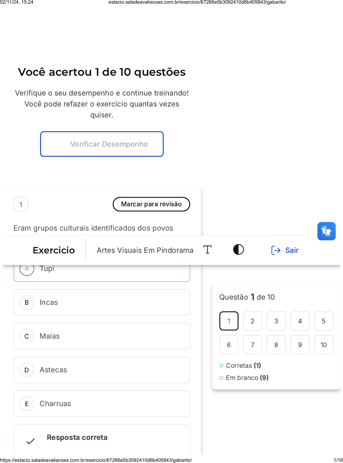 Você acertou 1 de 10 questões Verifique o seu desempenho e continue treinando! Você pode refazer o exercício quantas vezes quiser. Verificar Desempenho A B C D E 1 Marcar para revisão Eram grupos culturais identificados dos povos originários: Tupi Incas Maias Astecas Charruas Resposta correta Questão 1 de 10 Corretas �1� Em branco �9� 1 2 3 4 5 6 7 8 9 10 Exercicio Artes Visuais Em Pindorama Sair 02/11/24, 15:24 estacio.saladeavaliacoes.com.br/exercicio/67266e5b3092410d6b405843/gabarito/ https://estacio.saladeavaliacoes.com.br/exercicio/67266e5b3092410d6b405843/gabarito/ 1/16 Parabéns, você selecionou a alternativa correta. Confira o gabarito comentado! Gabarito Comentado Todas as alternativas apresentam denominações de grupos culturais originários da América. No entanto, apenas os Tupi são identificados como um grupo cultural que habitava o território que hoje conhecemos como Brasil. Os Incas, Maias e Astecas são civilizações pré-colombianas que se localizavam na América Central e do Sul, mas fora do território brasileiro. Os Charruas, por sua vez, eram um grupo étnico que habitava a região do atual Uruguai e parte do Brasil, Argentina e Paraguai. Portanto, a alternativa correta é a "A", que menciona os Tupi, um dos principais grupos culturais dos povos originários do Brasil. 2 Marcar para revisão O processo de produção da arte plumária demanda uma série de procedimentos. Os índios saem à caça, levam os homens mais jovens para aprenderem a escolher a ave, capturá-las e escolher suas penas. Assim, há um preparo para essa criação: desde a seleção da ave até a montagem do artefato. Pensando na diversidade de processos que giram em torno dessa arte, quais são os outros materiais encontrados nessa produção? 02/11/24, 15:24 estacio.saladeavaliacoes.com.br/exercicio/67266e5b3092410d6b405843/gabarito/ https://estacio.saladeavaliacoes.com.br/exercicio/67266e5b3092410d6b405843/gabarito/ 2/16 A B C D E A arte plumária não pode ser desenvolvida com outros materiais. Nesse processo é usado apenas penas das aves. A arte plumária é feita somente com penas e peles das aves encontradas. Com o intuito de se conectarem com esses animais, os índios não utilizam nenhum outro material a não ser da própria ave. Na arte plumária, o trançado faz parte para segurar as penas como um diadema. Em alguns desses diademas, podemos encontrar peles, sementes, garras e dentes de animais, e outros elementos específicos da fauna e da flora. Na arte plumária, o único elemento encontrado além das penas é o látex. Essa cola serve para juntar as penas e colá-las para formar o diadema. Na arte plumária, as mulheres não permitem o uso de qualquer material, mas somente de penas e tintas, tendo em vista que são artefatos usados especialmente para rituais. Questão não respondida Opa! A alternativa correta é a letra C. Confira o gabarito comentado! 02/11/24, 15:24 estacio.saladeavaliacoes.com.br/exercicio/67266e5b3092410d6b405843/gabarito/ https://estacio.saladeavaliacoes.com.br/exercicio/67266e5b3092410d6b405843/gabarito/ 3/16 Gabarito Comentado A arte plumária, tradicionalmente produzida pelos povos indígenas, não se limita ao uso de penas de aves. Além das penas, que são o elemento principal, outros materiais da fauna e da flora são incorporados na produção desses artefatos. O trançado, por exemplo, é uma técnica utilizada para segurar as penas, formando um diadema. Em alguns desses diademas, é possível encontrar peles, sementes, garras e dentes de animais. Portanto, a alternativa correta é a C, que menciona a diversidade de materiais utilizados na arte plumária, refletindo a riqueza e a complexidade dessa expressão cultural indígena. 3 Marcar para revisão Ter um espaço e ferramentas para produzir arte não é um luxo dos ateliês de artistas contemporâneos. Há séculos, os pindoramenses também tinham suas ferramentas e organização própria na confecção de artefatos e criações. Imagine a mesa do pindoramense com diversos materiais para seus processos de criação. Os pigmentos naturais, a argila, a palha, dentre tantos outros estão sobre a mesa. Junto a isso existem diversas ferramentas que auxiliam na confecção desses artefatos. Dentre essas ferramentas, temos: 02/11/24, 15:24 estacio.saladeavaliacoes.com.br/exercicio/67266e5b3092410d6b405843/gabarito/ https://estacio.saladeavaliacoes.com.br/exercicio/67266e5b3092410d6b405843/gabarito/ 4/16 A B C D E Facas de pedras ou ossos, cuias da casca do coco que ajudavam a raspagem de impurezas e sobras. Não existiam materiais extras. Todo processo era feito somente com as mãos. Somente ossos para talhar a argila. Pincéis, tintas acrílicas, solventes e canetas auxiliavam na produção dos desenhos e projetos das cerâmicas. Somente pedras. Questão não respondida Opa! A alternativa correta é a letra A. Confira o gabarito comentado! Gabarito Comentado O conceito de etnocentrismo é crucial para entendermos essa questão. Etnocentrismo é a tendência de avaliar outras culturas a partir dos valores e padrões da própria cultura, considerando-a superior. Nesse sentido, é importante ressaltar que cada cultura tem suas próprias técnicas e ferramentas para a produção de arte, e não devemos desvalorizá-las por serem diferentes das nossas. No caso dos pindoramenses, eles utilizavam facas de pedras ou ossos e cuias da casca do coco para auxiliar na confecção de seus artefatos, demonstrando uma organização e um desenvolvimento técnico 02/11/24, 15:24 estacio.saladeavaliacoes.com.br/exercicio/67266e5b3092410d6b405843/gabarito/ https://estacio.saladeavaliacoes.com.br/exercicio/67266e5b3092410d6b405843/gabarito/ 5/16 A B C D E em suas práticas. A arqueologia nos mostra que essas práticas não eram fruto de improviso, mas sim de uma clara organização voltada ao desenvolvimento dessas técnicas. 4 Marcar para revisão As criações plumárias indígenas são os trabalhos mais 