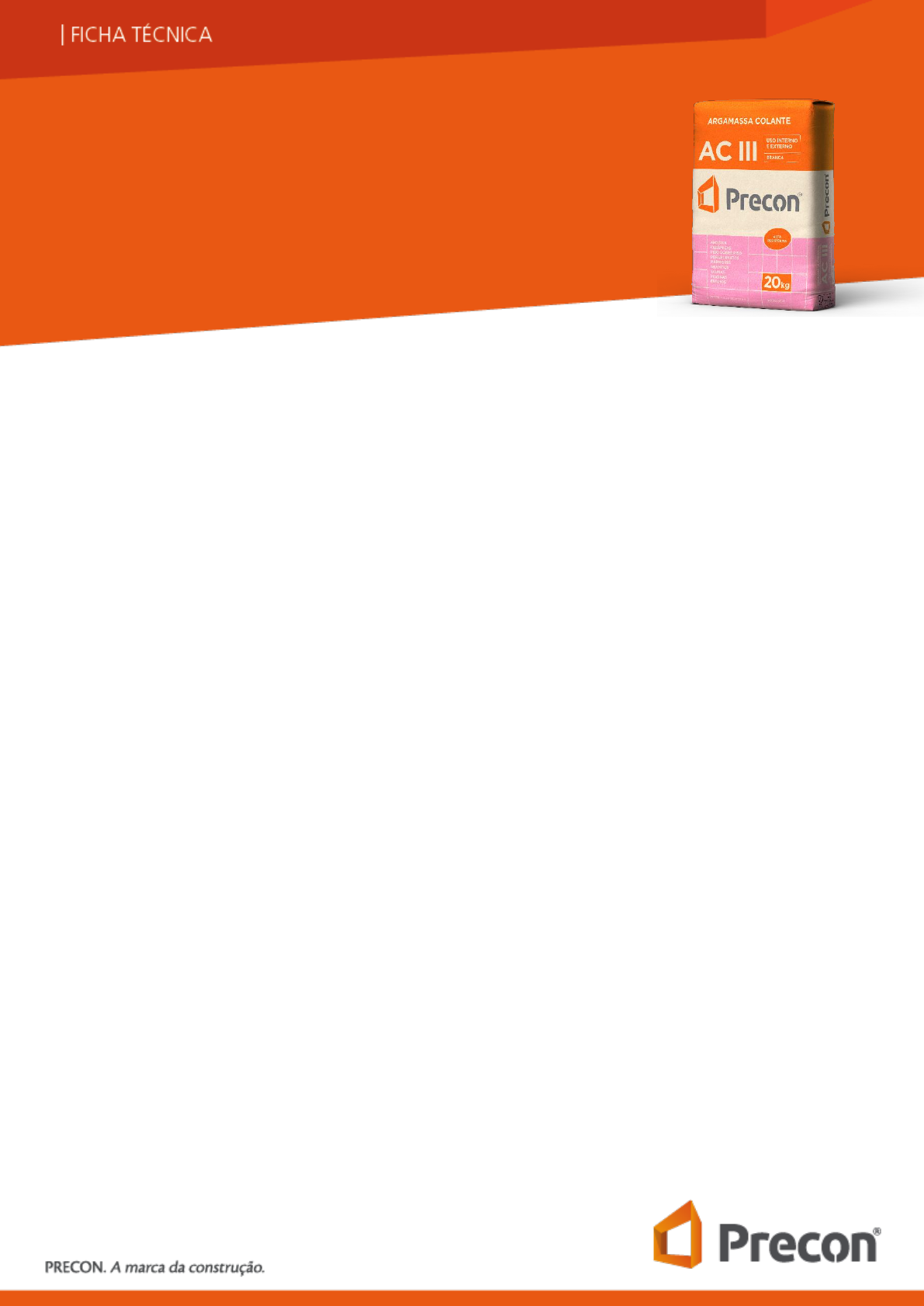 DESCRIÇÃO A ARGAMASSA COLANTE TIPO AC III BRANCA PRECON é uma argamassa industrializada de altíssima qualidade, fabricada com matérias-primas selecionadas, bastando apenas adicionar água. INDICAÇÕES DE USO É recomendada para assentamento de peças cerâmicas, azulejos e ardósias de até 80x80cm, peças de porcelanato e cerâmica, sempre sobre cerâmica, para pisos e paredes em ambientes externos e internos. Esta argamassa é indicada para uso especial (assentamento de porcelanatos, pastilhas, pedras de granito e mármore e revestimento em ambientes especiais: saunas, piscinas e estufas) e também para locais de tráfego intenso. COMPOSIÇÃO Cimento Portland, agregados minerais selecionados, aditivos especiais não tóxicos. ESPECIFICAÇÃO Atende às especificações da Norma Técnica Brasileira como AC-III– NBR 14081 – Argamassa Colante Industrializada para Assentamento de Placas Cerâmicas – Especificação. PRAZOS MÍNIMOS PARA TRÁFEGO Pessoas com cuidado: 72 horas. Utilização Normal: 14 dias REJUNTAMENTO Após 72 horas, no mínimo. CARACTERÍSTICAS TÉCNICAS Resistência de aderência por tempo em aberto 20 min: > 0,5 MPa. Resistência de aderência (cura normal): > 1,0 MPa. Resistência de aderência (cura submersa): > 1,0 MPa. Resistência de aderência (cura em estufa): > 1,0 MPa. TEMPERATURA DE TRABALHO PARA APLICAÇÃO Do ambiente: 5° a 40°C. Da base: 5° a 27°C. RENDIMENTO Aproximadamente 4 kg/m² em aplicação de camada simples e aproximadamente 8 kg/m² em aplicação de camada dupla, conforme NBR 13754, que preconiza a aplicação do sistema dupla face para placas cerâmicas com área igual ou maior que 900 cm². COR Branca. EMBALAGEM Sacos de 20 kg. VALIDADE 240 (duzentos e quarenta) dias a partir da data de fabricação impressa na embalagem, se respeitada as condições de estocagem. CONDIÇÕES DE ESTOCAGEM Pilhas de até 1,5 m em local protegido, arejado, seco, sobre estrado e distante da parede em pelo menos 15 a 30 cm. PREPARO DA BASE E DA PEÇA CERÂMICA O contrapiso e o emboço/reboco internos deverão estar secos e curados. Para bases executadas sem adição de cal hidratada ou com argamassas de revestimento, o prazo é de pelo menos 14 dias. Já no caso de bases com adição de cal hidratada ou concreto curado, o prazo é de pelo menos 28 dias. A base de aplicação para piso sobre piso (sempre peças cerâmicas) deve estar firme, sólida, livre de som cavo e perfeitamente limpa, isenta de poeira, óleos e gorduras e livre de qualquer substância que possa comprometer a adesão, para contribuir ainda mais para a aderência do sistema, a base deve ser escovada/desgastada com escova de cerdas de aço ou similar. Feito esse procedimento, realizar limpeza novamente, de forma eficiente, isentando essa base preparada de qualquer partícula solta. As tolerâncias de prumo e planeza deverão estar conforme NBR 13749 e a superfície isenta de pó e totalmente limpa, para não prejudicar a aderência. A peça cerâmica também deve estar limpa e seca e deve-se efetuar a limpeza e remoção do engobe da cerâmica para melhor aderência da argamassa, caso este esteja se desprendendo da peça cerâmica. Argamassa Colante AC III Branca Precon PREPARO DO PRODUTO Verifique se você está com todas as ferramentas de trabalho e a base já esteja preparada. Promova a mistura em um recipiente estanque e limpo, protegido de sol, vento e chuva. Adicione a quantidade de água limpa conforme indicado na tabela abaixo, a um saco de 20 kg da Argamassa Colante PRECON, devendo a mistura apresentar uma consistência pastosa e firme sem grumos ou material seco. A quantidade de água pode variar + ou - 5%, ou seja, a quantidade de água a ser utilizada é de 4,7 a 5,3 litros. Para promover uma melhor ação dos aditivos da mistura sugere-se deixar a argamassa, já homogeneizada, em repouso por 10 minutos, bastando remisturar antes do uso. Nota: Não adicionar mais água. Tempo para utilização: Avaliando-se as condições de exposição do caixote, de temperatura e umidade relativa do ar, a argamassa poderá ser utilizada no prazo máximo de 2 horas e 30 minutos, contadas a partir do início da mistura. É recomendada a colocação de um pano úmido sobre o recipiente para contribuir com o tempo de utilização. APLICAÇÃO DA ARGAMASSA A argamassa é aplicada com desempenadeira dentada, observando-se os critérios das normas brasileiras. Cerâmica a ser assentada Tamanho do dente da desempenadeira Aplicação da Argamassa Até 20 x 20 cm 6 x 6 x 6 Na base De 20 x 20 até 30 x 30 cm 8 x 8 x 8 Na base Maior que 30 x 30 cm 8 x 8 x 8 Na base e no verso da cerâmica Com garras maiores que 1 mm 8 x 8 x 8 Na base e no verso da cerâmica Aplique argamassa sobre a base preparada utilizando o lado liso da desempenadeira e imediatamente, aplique o lado com os dentes, levemente inclinado. Abra pequenos panos para se evitar secagem dos cordões (tempo em aberto). Aplique a cerâmica sobre os cordões de Argamassa Colante Tipo AC III BRANCA PRECON, pressionando a peça cerâmica sobre a base e promovendo o esmagamento dos cordões de argamassa e em seguida, movimentar a peça no sentido contrário dos cordões através de um movimento de vai e vem deslizando até a posição final. Bata levemente com um martelo de borracha. A argamassa deverá estar completamente preenchida ao verso da cerâmica. ATENÇÃO Utilize equipamentos de proteção, como óculos e luvas de borracha. Em caso de contado com os olhos, lave imediatamente com água em abundância e procure orientação médica. Em caso de ingestão, procure imediatamente orientação médica. BOAS PRÁTICAS • Armazene o produto em local seco, arejado, protegido de intempéries, sobre estrados de madeira e longe da parede em pelo menos 15 a 30 cm, aconselha-se ter atenção à altura das pilhas que deve estar entre 1,2 a 1,5m; •Confira o prazo de validade, não utilize o produto fora do prazo; •Recomenda-se utilização de 