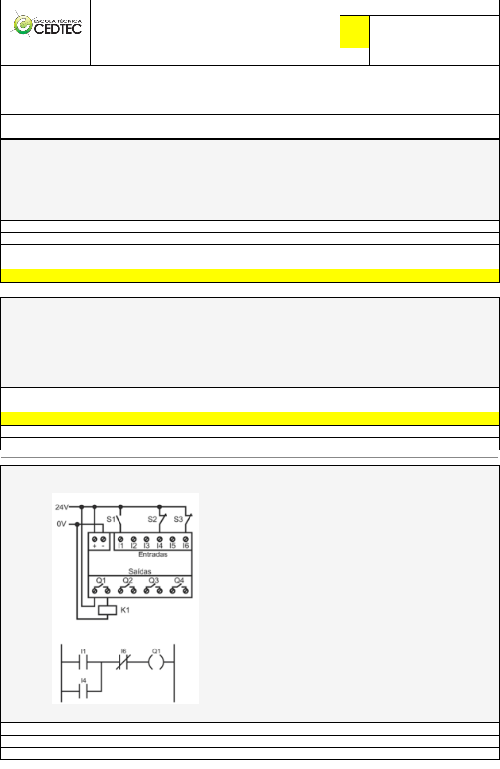 Pincel Atômico - 30/03/2024 11:32:27 1/2 RAIKY ROSA DE OLIVEIRA Exercício Caminho do Conhecimento - Etapa 10 (27866) Atividade finalizada em 24/01/2024 19:25:48 (1579798 / 1) LEGENDA Resposta correta na questão # Resposta correta - Questão Anulada X Resposta selecionada pelo Aluno Disciplina: PROJETOS DE AUTOMAÇÃO [796069] - Avaliação com 4 questões, com o peso total de 4,33 pontos [capítulos - 115] Turma: Curso Técnico: Automação Industrial - Grupo: EAD - 02/23 - EAD AUT [82544] Aluno(a): 91233637 - RAIKY ROSA DE OLIVEIRA - Respondeu 4 questões corretas, obtendo um total de 4,33 pontos como nota [350194_1937 89] Questão 001 Em um controlador lógico programável, o controle e o processamento das informações de entrada e saída é feito de forma sequencial, através de ciclos de varredura. Analise as ações listadas abaixo e identifique a sequência na qual elas devem ser executadas. ( ) Atualizar as saídas. ( ) Transferir os dados para a memória. ( ) Verificar o estado das entradas. ( ) Comparar com o programa do usuário. ( ) Verificar o funcionamento da CPU, memórias, circuitos auxiliares e existência de programa, desativando todas as saídas. Assinale a alternativa que indica a sequência CORRETA, de cima para baixo: 2 • 4 • 1 • 3 • 5 5 • 2 • 1 • 3 • 4 5 • 1 • 2 • 4 • 3 3 • 4 • 5 • 1 • 2 X 5 • 3 • 2 • 4 • 1 [350196_1937 85] Questão 002 Informe se é verdadeiro (V) ou falso (F) o que se afirma sobre as linguagens utilizadas nos CLP’s ( ) A Programação Ladder (LD) é uma linguagem de texto e é encontrada em quase todos os CLP’s que existem no mercado de tecnologia de automação industrial. ( ) O Bloco Funcional (FB) é uma linguagem gráfica. É um elemento que pode ser reutilizado em várias partes do programa principal ou exportado e armazenado em um arquivo para, posteriormente, ser importado e inserido em outro projeto. ( ) O Sequenciamento Gráfico de Funções (SFC) trata-se de um método estruturado que representa um sistema de controle sequencial ou dependente do tempo, utilizando sequência de etapas e transições. ( ) A linguagem de programação, Lista de Instruções (IL), é semelhante à linguagem Pascal. Com essa linguagem, é possível chamar blocos funcionais, funções e atribuições e executar condicionalmente instruções e tarefas de repetição. A sequência CORRETA é: (V); (V); (F); (V). (V); (F); (F); (V). X (F); (V); (V); (F). (V); (V); (V); (V). (F); (F); (V); (F). [350196_1937 84] Questão 003 O esquema elétrico a seguir exibe a ligação das botoeiras sem retenção S1, S2 e S3 e do relé K1 a um CLP. As entradas do CLP são consideradas em nível lógico alto (1) quando conectadas à tensão de 24 V e as saídas são a relé, com contato do tipo normalmente aberto. Além da ligação elétrica, é possível observar o diagrama Ladder, que determina o funcionamento do sistema. Com base nas informações fornecidas e nos diagramas apresentados, assinale a alternativa em que a combinação dos estados das botoeiras permite a energização do relé K1. S1 = pressionada • S2 = liberada • S3 = liberada S1 = liberada • S2 = pressionada • S3 = liberada S1 = liberada • S2 = liberada • S3 = liberada Pincel Atômico - 30/03/2024 11:32:27 2/2 X S1 = liberada • S2 = liberada • S3 = pressionada S1 = liberada • S2 = pressionada • S3 = pressionada [350195_1937 81] Questão 004 Assinale a alternativa CORRETA sobre a arquitetura e aplicação de sistemas supervisórios: Programas supervisórios apenas se comunicam por meio da rede LAN (Local Area Network) industrial onde estão os equipamentos de campo. X Aplicações possíveis incluem o monitoramento de variáveis de processo, gerenciamento de alarmes e geração de gráficos de tendências Não é possível integrar supervisórios em redes de comunicação que atuam em nível de equipamentos de campo como a rede PROFIBUS DP Como realizam a leitura e o controle direto sobre sensores e atuadores eles não podem atuar em redes de comunicação com CLP’s. É possível a operação de variáveis de processo booleanas (on-off), mas não podem suportar variáveis digitais com tamanho maior que 8 bytes