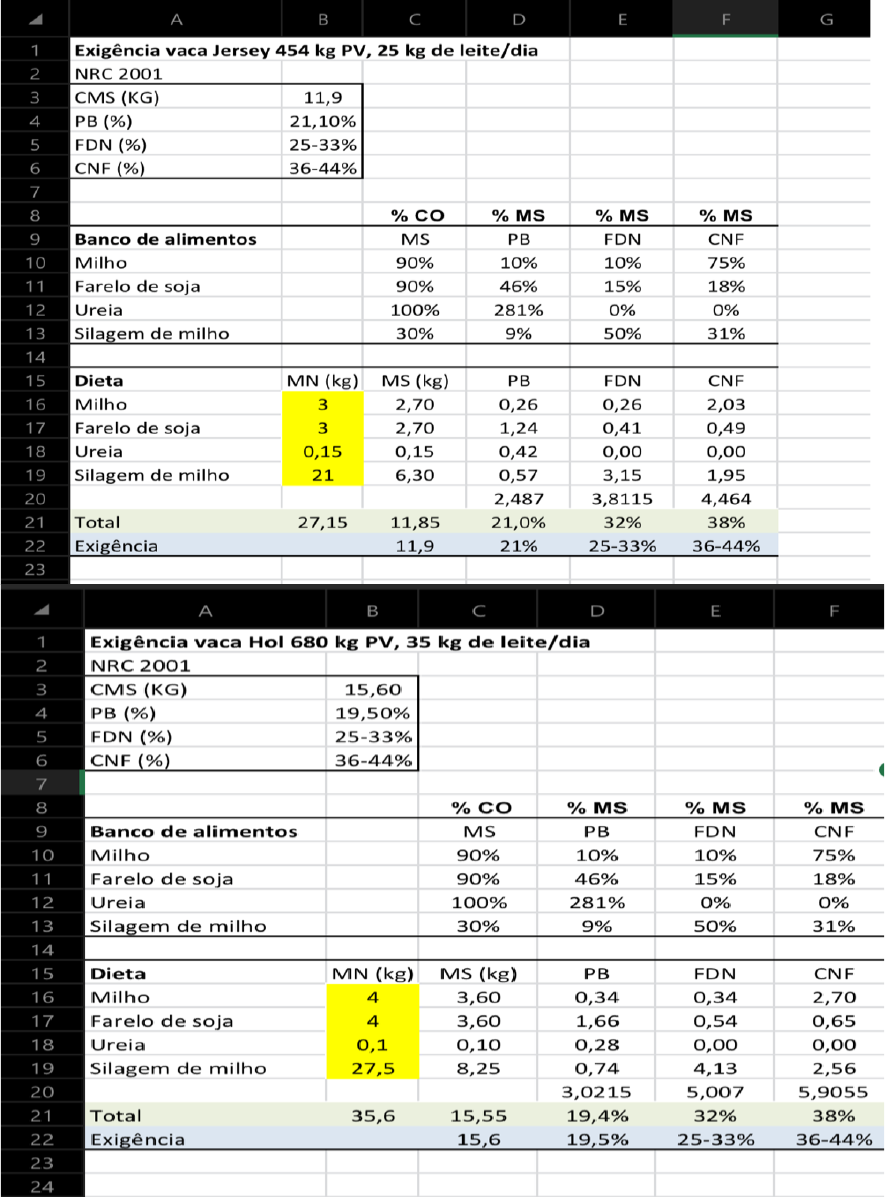 1 - Por que as quantidades de alimentos definidas por você em cada planilha irão atender as exigências destes animais? 2 - Descreva para cada um dos alimentos utilizados na dieta, qual foi a sua maior contribuição em termos exigências nutricionais na dieta? 3 - Como as possíveis variações do %MS do volumoso do banco de alimentos podem afetar a formulação final desta dieta? Respostas: 1- As quantidades sugeridas na dieta balanceada para vacas leiteiras foram calculadas com base nas necessidades nutricionais diárias. As vacas leiteiras precisam de uma dieta com um certo nível de proteína, carboidratos, vitaminas e minerais para conseguirem produzir a quantidade de leite desejada e manterem uma boa saúde. No caso da vaca Holandesa, a dieta é mais rica em silagem de milho e concentrado proteico porque esta raça tem um metabolismo mais rápido e consome mais comida em comparação com outras raças de vaca leiteira. Já a vaca Jersey necessita de uma dieta mais equilibrada em termos de silagem de milho, feno de alfafa e concentrado proteico e energético, porque é uma raça menor e menos exigente quanto à dieta. 2- Os alimentos listados são: Milho- constitui cerca de 60 a 80% da dieta concentrada dos animais, o milho é o alimento referência sendo o concentrado energético mais usado no mundo. Farelo de soja- ele possui, em média, 46% de proteína bruta, 80% de proteína solúvel, 6% de fibra e 2,5% de óleo, ou seja, alto teor proteico, alto valor biológico. Ureia- responsável pela reposição de nutrientes do solo. Silagem de milho - As silagens de planta com grãos (sorgo, milho) têm mais energia por quilo e reduz a necessidade de concentrado energético, reduzindo o custo total da dieta. Funciona como vantagem estratégica. A “exigência nutricional” é a quantidade de cada nutriente necessária para manutenção, crescimento, reprodução e produção de uma determinada espécie ou categoria animal. Logo, as exigências diárias em nutrientes e energia são estimadas com base no nível de produção, peso corporal e estádio fisiológico. 3- O planejamento da produção de volumosos depende do sistema de criação e dos objetivos do criador. Sistemas mais intensificados exigem maior investimento e planejamento. Por exemplo, em uma criação extensiva de gado de corte, a pastagem será o principal volumoso, necessitando de planejamento quanto ao rodízio dos pastos, para evitar sobrepastejo e degradação.