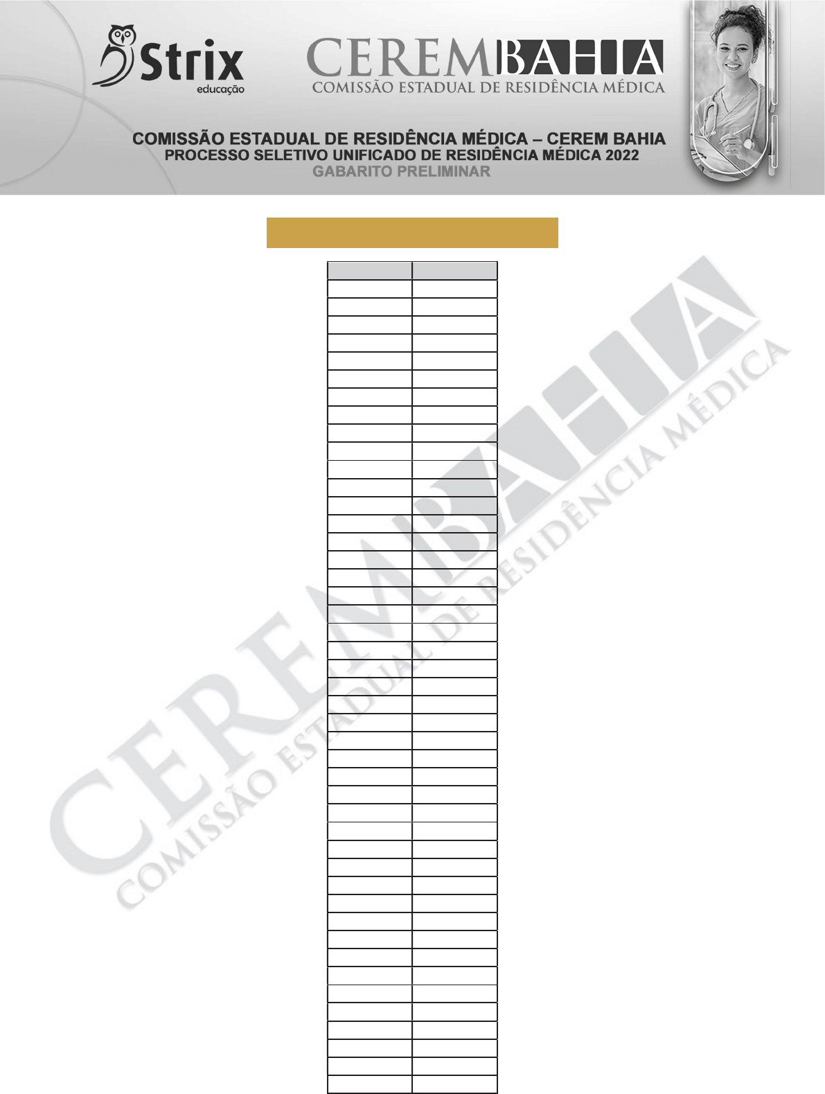 Data da aplicação: 14/11/2021 Data da publicação: 17/11/2021 Questões Alternativas Corretas 1 D 2 B 3 B 4 C 5 A 6 A 7 B 8 D 9 A 10 B 11 B 12 A 13 C 14 A 15 C 16 B 17 C 18 B 19 B 20 A 21 C 22 A 23 C 24 A 25 B 26 D 27 A 28 C 29 B 30 A 31 C 32 B 33 A 34 D 35 B 36 D 37 A 38 B 39 D 40 B 41 B 42 A 43 B 44 A 45 D ACESSO DIRETO Data da Prova: 14/11/2021 Data da Publicação: 17/11/2021 Situação Problema – Questões de 46 a 48 46) Bloqueio atrioventricular total OU Bloqueio atrioventricular completo OU Bloqueio atrioventricular de 3° grau OU BAVT. 47) Atropina. 48) Implantação de Marcapasso transcutâneo OU Marcapasso transvenoso. Situação Problema – Questões de 49 a 51 49) Pré-diabetes. 50) Metformina. 51) Aumentar para 150min por semana OU aumentar a duração OU aumentar a frequência semanal. Situação Problema – Questões de 52 a 54 52) Hiponatremia. 53) Dosagem do sódio sérico 54) Interromper a venóclise com SF0,9%. Situação Problema – Questões de 55 a 57 55) Torção testicular E Orquiepididimite. 56) Ultrassonografia com doppler dos testículos. 57) Orquiectomia direita E Orquidopexia esquerda. Situação Problema – Questões de 58 a 60 58) Pré-eclampsia com critérios de gravidade OU Pré-eclampsia grave. 59) Hidralazina. 60) Administrar Sulfato de Mg OU o uso de Sulfato de Magnésio. PROVA PARA ACESSO DIRETO Data da Prova: 14/11/2021 Data da Publicação: 17/11/2021 Situação Problema – Questões de 61 a 63 61) Sífilis recente secundária. 62) Teste rápido treponêmico OU VDRL. 63) Doxiciclina, 100mg, 12/12h, VO, por 15 dias OU Doxiciclina, 100mg, VO, por 15 dias. Situação Problema – Questões de 64 a 66 64) Anemia microcítica OU hipocrômica microcítica. 65) Anemia devido à Parasitose Intestinal OU parasitose intestinal OU perda de ferro devido à parasitose OU Helmintíase. 66) Contagem de reticulócitos acima de 2,0/mm³ OU contagem de reticulócitos elevada OU Reticulocitose. Situação Problema – Questões de 67 a 69 67) Bronquiolite aguda viral (OU bronquiolite) OU sibilância no lactente. 68) Vírus Sincicial Respiratório. 69) Broncodilatador Beta-adrenérgico de curta ação. Situação Problema – Questões de 70 a 72 70) Melhora no diagnóstico dos casos OU diagnóstico precoce OU identificação de casos da doença já existentes. 71) Via respiratória OU através do trato respiratório OU através da mucosa respiratória OU através das vias aéreas. 72) Perda da sensibilidade térmica e dolorosa OU perda da sensibilidade OU lesões cutâneas com perda da sensibilidade Situação Problema – Questões de 73 a 75 73) Morfina por via endovenosa com bomba de infusão contínua OU Morfina sob infusão EV contínua OU Morfina EV de 4/4hs. 74) Ortotanásia E conduta permitida legalmente. 75) Diretivas antecipada de vontade. GABARITO_ACESSO_DIRETO_2022 GABARITO_CEREMBA_AD_PADRÃO DE RESPOSTAS_2022