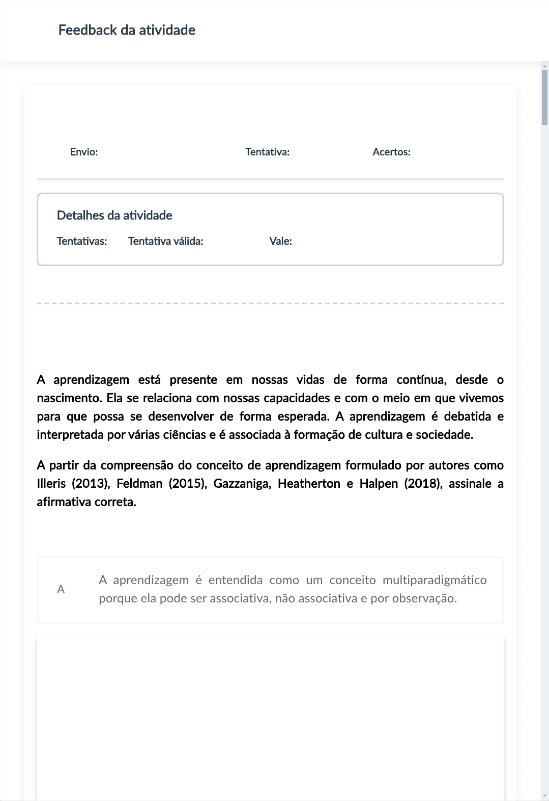 Aprendizag Apresentação A aprendizagem é estudada e proposta por muitas ciências e perspec�vas teóricas, o que resulta em sua caracterís�ca mul�paradigmá�ca. "Mul�paradigmá�ca" significa que a aprendizagem é concebida sob diferentes visões teóricas, o que pode ser exemplificado pela interpretação cogni�va, apresentada nesta Unidade de Aprendizagem. O interesse pela aprendizagem se explica por seu papel no desenvolvimento e transmissão da cultura, nas mudanças sociais, na formação de cidadãos para o convívio social, para o progresso Apresentação Infográfico Conteúdo do Livro Dica do Professor Exercícios Na prá�ca Saiba mais Aprendizagem Disciplina: PSICOLOGIA DA EDUCAÇÃO E TEORIAS DA APRENDIZAGEM (PSICOLOGIA DA EDUCACÃO Exercícios Envio: 23/05/2024 - 10:05 Tentativa: 1 de 3 Acertos: 5/5 Questão 1 1,2/1,2 Selecione a resposta: Comentários da resposta A aprendizagem pode ser definida como uma mudança relativamente permanente no comportamento ou nas capacidades de um organismo vivo, decorrente da experiência (ILLERIS, 2013). Ou seja, a aprendizagem não diz respeito a qualquer mudança, pois mudanças relacionadas à maturação biológica, por exemplo, não podem ser consideradas aprendizagem. É um conceito paradigmático, por ser estudado sob diferentes enfoques que coexistem. Em geral, pode ser estudada mediante a compreensão dos processos A aprendizagem está presente em nossas vidas de forma contínua, desde o nascimento. Ela se relaciona com nossas capacidades e com o meio em que vivemos para que possa se desenvolver de forma esperada. A aprendizagem é debatida e interpretada por várias ciências e é associada à formação de cultura e sociedade. A partir da compreensão do conceito de aprendizagem formulado por autores como Illeris (2013), Feldman (2015), Gazzaniga, Heatherton e Halpen (2018), assinale a afirmativa correta. A A aprendizagem é entendida como um conceito multiparadigmático porque ela pode ser associativa, não associativa e por observação. Feedback da atividade Detalhes da a�vidade Tenta�vas: 3 Tenta�va válida: Maior nota Vale: 6 27/05/2024, 12:33 Plataforma A :: Plataforma A https://unibf.grupoa.education/plataforma/course/733388/content/7885919 1/11 da ciência e da vida em comum. Hoje os indivíduos são es�mulados à aprendizagem con�nua, ao longo da vida, de forma a acompanhar as mudanças sociais e tecnológicas e se manterem atualizados no mercado de trabalho. Nesta Unidade de Aprendizagem, você vai estudar a aprendizagem levando em conta a sua caracterís�ca de múl�plas interpretações. Será colocada ênfase nas teorias cogni�vas, nascidas na revolução cogni�va entre o final dos anos de 1950 e início dos 1960, quando novas concepções sobre o funcionamento mental, a par�r da metáfora do computador e do processamento de informações, contagiaram a produção cien�fica em várias áreas de estudo. Mesmo entre as teorias cogni�vas existem diferenças de foco e de concepção, e nesta Unidade de Aprendizagem trataremos de uma específica, devido à sua atualidade e relevância: a teoria cogni�va da aprendizagem social, ou por meio da observação, de Alfred Bandura (1925- 2021). Bons estudos. Ao final desta Unidade de Aprendizagem, você deve apresentar os seguintes aprendizados: Definir aprendizagem humana, enfa�zando sua natureza mul�paradigmá�ca. Descrever as teorias cogni�vas de aprendizagem. Explicar a aprendizagem social sob a lente da teoria cogni�va social de Bandura. Concluído Apresentação Infográfico Conteúdo do Livro Dica do Professor Exercícios Na prá�ca Saiba mais Aprendizagem Disciplina: PSICOLOGIA DA EDUCAÇÃO E TEORIAS DA APRENDIZAGEM (PSICOLOGIA DA EDUCACÃO Exercícios Envio: 23/05/2024 - 10:05 Tentativa: 1 de 3 Acertos: 5/5 Questão 1 1,2/1,2 Selecione a resposta: Comentários da resposta A aprendizagem pode ser definida como uma mudança relativamente permanente no comportamento ou nas capacidades de um organismo vivo, decorrente da experiência (ILLERIS, 2013). Ou seja, a aprendizagem não diz respeito a qualquer mudança, pois mudanças relacionadas à maturação biológica, por exemplo, não podem ser consideradas aprendizagem. É um conceito paradigmático, por ser estudado sob diferentes enfoques que coexistem. Em geral, pode ser estudada mediante a compreensão dos processos A aprendizagem está presente em nossas vidas de forma contínua, desde o nascimento. Ela se relaciona com nossas capacidades e com o meio em que vivemos para que possa se desenvolver de forma esperada. A aprendizagem é debatida e interpretada por várias ciências e é associada à formação de cultura e sociedade. A partir da compreensão do conceito de aprendizagem formulado por autores como Illeris (2013), Feldman (2015), Gazzaniga, Heatherton e Halpen (2018), assinale a afirmativa correta. A A aprendizagem é entendida como um conceito multiparadigmático porque ela pode ser associativa, não associativa e por observação. Feedback da atividade 27/05/2024, 12:33 Plataforma A :: Plataforma A https://unibf.grupoa.education/plataforma/course/733388/content/7885919 2/11 Infográfico Apesar de sua natureza mul�paradigmá�ca, é possível definir a aprendizagem de maneira ampliada, contemplando diferentes abordagens. De acordo com Illeris (2007), a aprendizagem pode ser entendida como uma mudança permanente na capacidade de um indivíduo em decorrência da experiência (ou seja, uma mudança que não depende unicamente do processo biológico de maturação). A par�r dessa compreensão, neste Infográfico você vai ver as três dimensões ou esferas da aprendizagem desenvolvidas por Illeris (2013) – conteúdo, incen�vo e interação – e os dois processos essenciais envolvidos na aprendizagem: os processos internos/psicológicos e os processos externos. Apresentação Infográfico Conteúdo do Livro Dica do Professor Exercícios Na prá�ca