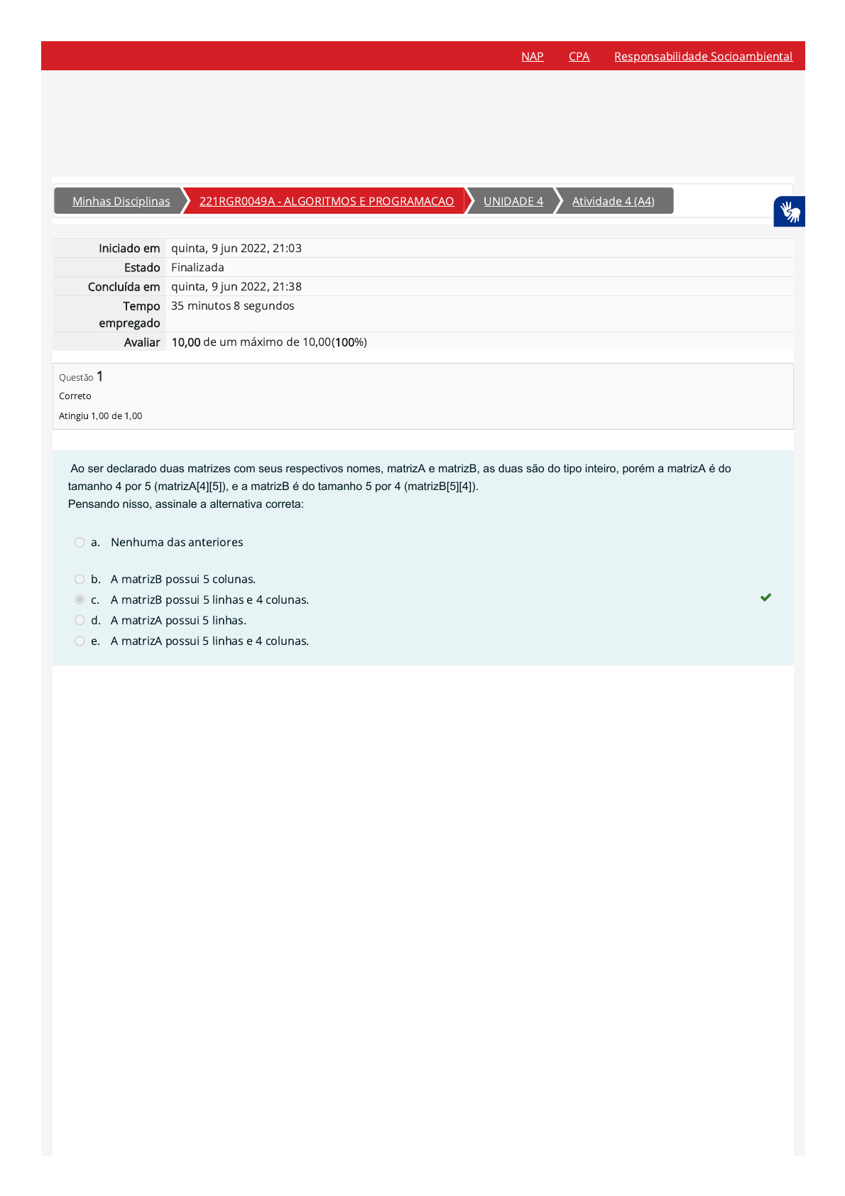 09/06/2022 21:38 Atividade 4 (A4): Revisão da tentativa https://ambienteacademico.com.br/mod/quiz/review.php?attempt=809739&cmid=337964 1/6 Minhas Disciplinas 221RGR0049A - ALGORITMOS E PROGRAMACAO UNIDADE 4 Atividade 4 (A4) Iniciado em quinta, 9 jun 2022, 21:03 Estado Finalizada Concluída em quinta, 9 jun 2022, 21:38 Tempo empregado 35 minutos 8 segundos Avaliar 10,00 de um máximo de 10,00(100%) Questão 1 Correto Atingiu 1,00 de 1,00 Ao ser declarado duas matrizes com seus respectivos nomes, matrizA e matrizB, as duas são do tipo inteiro, porém a matrizA é do tamanho 4 por 5 (matrizA[4][5]), e a matrizB é do tamanho 5 por 4 (matrizB[5][4]). Pensando nisso, assinale a alternativa correta: a. Nenhuma das anteriores b. A matrizB possui 5 colunas. c. A matrizB possui 5 linhas e 4 colunas. d. A matrizA possui 5 linhas. e. A matrizA possui 5 linhas e 4 colunas. NAP CPA Responsabilidade Socioambiental https://ambienteacademico.com.br/my/ https://ambienteacademico.com.br/course/view.php?id=12215 https://ambienteacademico.com.br/course/view.php?id=12215§ion=6 https://ambienteacademico.com.br/mod/quiz/view.php?id=337964 https://codely-fmu-content.s3.amazonaws.com/Moodle/NAP/inicial/nap/fmu/index.html https://codely-fmu-content.s3.amazonaws.com/Moodle/CPA/landing_CPA/index.html https://portal.fmu.br/sustentabilidade 09/06/2022 21:38 Atividade 4 (A4): Revisão da tentativa https://ambienteacademico.com.br/mod/quiz/review.php?attempt=809739&cmid=337964 2/6 Questão 2 Correto Atingiu 1,00 de 1,00 Questão 3 Correto Atingiu 1,00 de 1,00 Observe o código a seguir e analise de acordo com o que foi estudado até agora: #include int main() { int vetor[5]; int indice; printf("Escreva 5 números: "); for (indice = 0; indice int main(void) { int vetor[5]; int contador; int par = 0; printf("Digite 5 números inteiros.\n"); for (contador = 0; contador int main() { int x[3]; int y; for (y = 0; ydas alternativas anteriores. Observe o código a seguir: #include int main() { int matriz[3,5]; return 0; } Qual será o retorno do código ao ser executado? a. O código irá retornar true. b. O código está correto e não irá retornar nada. c. O código irá retornar 0. d. O código não irá executar, pois está errado. e. Nenhuma das opções anteriores. ◄ Compartilhe Seguir para... N2 (A5) ► NAP CPA Responsabilidade Socioambiental https://ambienteacademico.com.br/mod/forum/view.php?id=337960&forceview=1 https://ambienteacademico.com.br/mod/quiz/view.php?id=337966&forceview=1 https://codely-fmu-content.s3.amazonaws.com/Moodle/NAP/inicial/nap/fmu/index.html https://codely-fmu-content.s3.amazonaws.com/Moodle/CPA/landing_CPA/index.html https://portal.fmu.br/sustentabilidade