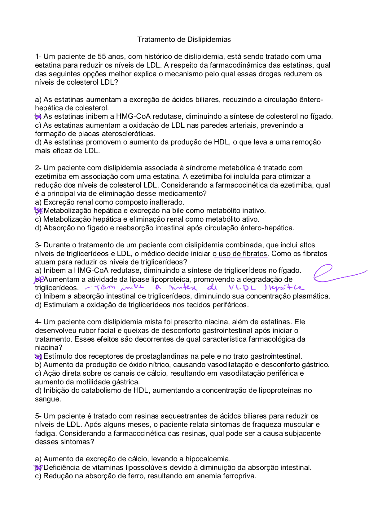 Tratamento de Dislipidemias 1- Um paciente de 55 anos, com histórico de dislipidemia, está sendo tratado com uma estatina para reduzir os níveis de LDL. A respeito da farmacodinâmica das estatinas, qual das seguintes opções melhor explica o mecanismo pelo qual essas drogas reduzem os níveis de colesterol LDL? a) As estatinas aumentam a excreção de ácidos biliares, reduzindo a circulação êntero- hepática de colesterol. b) As estatinas inibem a HMG-CoA redutase, diminuindo a síntese de colesterol no fígado. c) As estatinas aumentam a oxidação de LDL nas paredes arteriais, prevenindo a formação de placas ateroscleróticas. d) As estatinas promovem o aumento da produção de HDL, o que leva a uma remoção mais eficaz de LDL. 2- Um paciente com dislipidemia associada à síndrome metabólica é tratado com ezetimiba em associação com uma estatina. A ezetimiba foi incluída para otimizar a redução dos níveis de colesterol LDL. Considerando a farmacocinética da ezetimiba, qual é a principal via de eliminação desse medicamento? a) Excreção renal como composto inalterado. b) Metabolização hepática e excreção na bile como metabólito inativo. c) Metabolização hepática e eliminação renal como metabólito ativo. d) Absorção no fígado e reabsorção intestinal após circulação êntero-hepática. 3- Durante o tratamento de um paciente com dislipidemia combinada, que inclui altos níveis de triglicerídeos e LDL, o médico decide iniciar o uso de fibratos. Como os fibratos atuam para reduzir os níveis de triglicerídeos? a) Inibem a HMG-CoA redutase, diminuindo a síntese de triglicerídeos no fígado. b) Aumentam a atividade da lipase lipoproteica, promovendo a degradação de triglicerídeos. c) Inibem a absorção intestinal de triglicerídeos, diminuindo sua concentração plasmática. d) Estimulam a oxidação de triglicerídeos nos tecidos periféricos. 4- Um paciente com dislipidemia mista foi prescrito niacina, além de estatinas. Ele desenvolveu rubor facial e queixas de desconforto gastrointestinal após iniciar o tratamento. Esses efeitos são decorrentes de qual característica farmacológica da niacina? a) Estímulo dos receptores de prostaglandinas na pele e no trato gastrointestinal. b) Aumento da produção de óxido nítrico, causando vasodilatação e desconforto gástrico. c) Ação direta sobre os canais de cálcio, resultando em vasodilatação periférica e aumento da motilidade gástrica. d) Inibição do catabolismo de HDL, aumentando a concentração de lipoproteínas no sangue. 5- Um paciente é tratado com resinas sequestrantes de ácidos biliares para reduzir os níveis de LDL. Após alguns meses, o paciente relata sintomas de fraqueza muscular e fadiga. Considerando a farmacocinética das resinas, qual pode ser a causa subjacente desses sintomas? a) Aumento da excreção de cálcio, levando a hipocalcemia. b) Deficiência de vitaminas lipossolúveis devido à diminuição da absorção intestinal. c) Redução na absorção de ferro, resultando em anemia ferropriva. d) Diminuição da excreção de creatinina, levando a miopatia. 6- As doenças endócrino-metabólicos provém de alterações dos hormônios do organismo que acarretam modificações importantes nas taxas de glicemia, colesterol e triglicerídeos. O distúrbio endócrino-metabólico mais comum é a dislipidemia. Assinale a alternativa que refere-se corretamente à característica da dislipidemia: a) Aumento no nível de colesterol e triglicerídeos no sangue. b) Desregula a velocidade do metabolismo. c) Eleva os níveis de glicose do sangue. d) Diminui os níveis de ácidos graxos do sangue. 7- Marque a alternativa correta: a) As gorduras trans aumentam os níveis de colesterol de lipoproteína de baixa densidade (LDL, o colesterol ruim) e aumentam os níveis de colesterol de lipoproteína de alta densidade (HDL, o colesterol bom). b) As gorduras trans diminuem os níveis de colesterol de lipoproteína de baixa densidade (LDL, o colesterol bom) e aumentam os níveis de colesterol de lipoproteína de alta densidade (HDL, o colesterol ruim). c) As gorduras trans aumentam os níveis de colesterol de lipoproteína de baixa densidade (LDL, o colesterol ruim) e diminuem os níveis de colesterol de lipoproteína de alta densidade (HDL, o colesterol bom). d) As gorduras trans diminuem os níveis de colesterol de lipoproteína de baixa densidade (LDL, o colesterol bom) e aumentam os níveis de colesterol de lipoproteína de alta densidade (HDL, o colesterol ruim). e) As gorduras saturadas aumentam os níveis de colesterol de lipoproteína de baixa densidade (LDL, o colesterol ruim) e diminuem os níveis de colesterol de lipoproteína de alta densidade (HDL, o colesterol bom). 8- Nos dias atuais, o sedentarismo associado a alimentação rica em gordura e açúcar, aumenta a chance de dislipidemia. Em relação a este fator de risco de doença arterial coronariana (DAC), é correto afirmar que: ( ) é caracterizada pelos níveis elevados de lipídeos no sangue. ( ) níveis de colesterol HDL maiores que 60 mg/dL caracterizam um fator protetor para DAC. ( ) alta concentração de colesterol LDL aumenta o risco de DAC. ( ) baixa concentração de LDL aumenta o risco de DAC. A alternativa que apresenta a sequência adequada, decima para baixo, é: a) errado,certo,errado,certo. b) certo,certo,certo,errado c) certo,errado,certo,errado d) errado,errado,errado,certo e) certo,certo,errado,errado 9- No quadro de hipercolesterolemia comum a alteração metabólica característica é: a) produção aumentada de quilomícron e/ou diminuição do catabolismo de quilomícron. b) produção aumentada de VLDL e/ou diminuição do catabolismo de VLDL. c) produção aumentada de HDL e/ou diminuição do catabolismo de HDL. d) produção aumentada de LDL e/ou diminuição do catabolismo de LDL. 10-O tratamento farmacológico das dislipidemias para prevenção de eventos cardiovasculares pode s