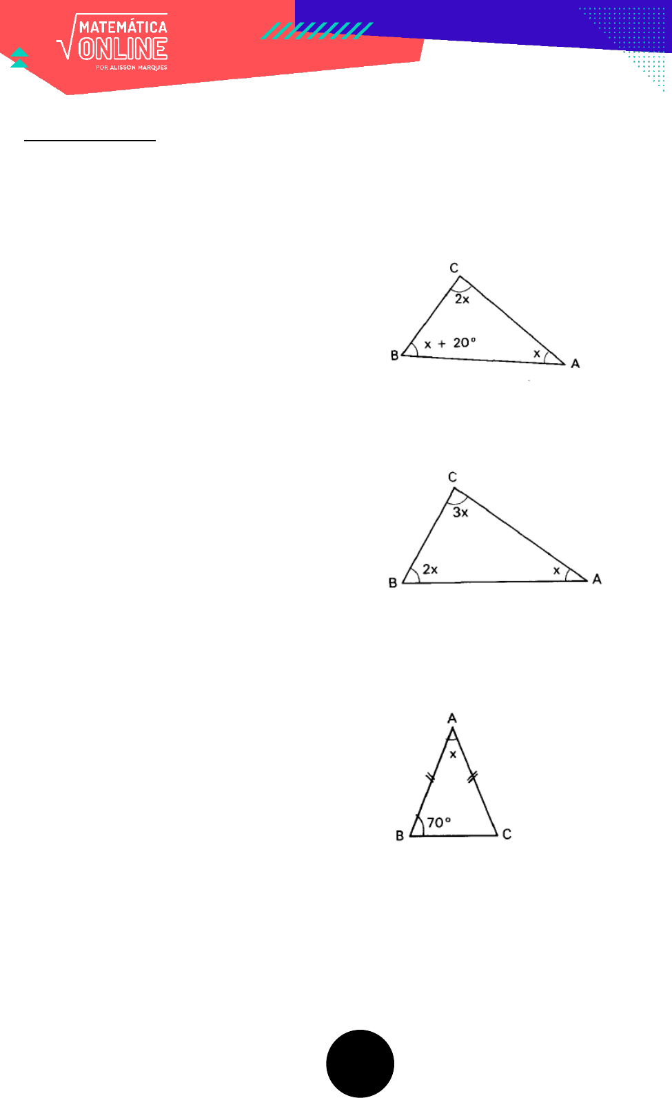 Triângulos 17 Exercícios de Fixação 1. Existe triângulo de lados 14 cm, 10 cm e 8 cm? E de lados 15 cm, 9 cm e 4 cm? 2. Dois lados, AB e BC, de um triângulo ABC medem respectivamente 8 cm e 21 cm. Quanto poderá medir o terceiro lado, sabendo que é múltiplo de 6? 3. Se dois lados de um triângulo isósceles medem 14 cm e 38 cm, qual poderá ser a medida do terceiro lado? 4. O lado AB de um triângulo ABC é expresso por um número inteiro. Determine o seu valor máximo, sabendo que os lados AC e BC medem respectivamente 27 cm e 16 cm e que �̂�e) 30º, 60º e 90º. 23. (G1 - ifpe 2018) Eva é aluna do curso de Construção Naval do campus Ipojuca e tem mania de construir barquinhos de papel. Durante a aula de desenho técnico, resolveu medir os ângulos do último barquinho que fez, representado na imagem a seguir. Sabendo que as retas suportes, r e s, são paralelas, qual a medida do ângulo α destacado? a) 52 . b) 60 . c) 61 . d) 67 . e) 59 . Questão 24 - (IFAL) Dada a figura geométrica plana abaixo: Podemos dizer que o valor de x é: a) 90° b) 95° c) 100° d) 105° e) 110° CÂB BĈA CÂB BĈA CÂB CB̂A Triângulos 23 25. (Mackenzie 2018) O triângulo PMN acima é isósceles de base MN. Se p, m e n são os ângulos internos do triângulo, como representados na figura, então podemos afirmar que suas medidas valem, respectivamente, a) 50 , 65 , 65 b) 65 , 65 , 50 c) 65 , 50 , 65 d) 50 , 50 , 80 e) 80 , 80 , 40 26- No triângulo ABC, os pontos D e E estão sobre os lados BC e AC, respectivamente. Se AB = AC, AE = AD, e o ângulo CDE =15º . Então o ângulo BAD é igual a: a)20° b)40° c)30° d)35° e)45° 27(Fcms) (Adaptado) Num triângulo ABC tem-se: A = 65º e C = 85º. Se D e E são pontos sobre os lados AB e BC tais que DB = DE, a medida do ângulo BED vale: a)30°. b)60°. c)75°. d)90°. 28-(ena) As medidas dos três ângulos, em graus, de um triângulo são proporcionais a 4, 7 e 9. Então a soma da medida do menor ângulo com a medida do maior ângulo, em graus, é igual a: a)13 b)99 c)117 d)144 e)180 29-(Utfpr) Um triângulo isósceles tem dois lados congruentes (de medidas iguais) e o outro lado é chamado de base. Se em um triângulo isósceles o ângulo externo relativo ao vértice oposto da base mede 130º , então os ângulos internos deste triângulo medem: a)10º, 40º e 130º. b)25º, 25º e 130º. c)50º, 60º e 70º. d)60º, 60º e 60º. e)50º, 65º e 65º. 30-(uece) Seja AEC um triângulo isósceles (as medidas dos lados AE e AC são iguais) e O um ponto do lado AC tal que a medida do ângulo EÔC é 120 graus. Se existe um ponto B, do lado AE, tal que o segmento OB é perpendicular ao lado AE e a medida do ângulo EÔB seja igual a 40 graus, então a medida do ângulo OÊC, em graus, é igual a a)9. b)7. c)5. d)3. Triângulos 24 31-(ufsj) Analise as seguintes afirmações: I) Um triângulo possui no máximo dois ângulos agudos. II) Um triângulo possui exatamente dois ângulos agudos. III) Um triângulo possui no máximo dois ângulos obtusos. IV) Um triângulo possui no máximo um ângulo obtuso. Com base nessa análise, assinale a alternativa CORRETA. a)Apenas as afirmações I e II são falsas. b)Apenas as afirmações III e IV são verdadeiras. c)Apenas a afirmação IV é verdadeira. d)Apenas a afirmação I é falsa. 32 - (UERJ) Física para poetas 1O ensino da física sempre foi um grande desafio. Nos últimos anos, muitos esforços foram feitos 2com o objetivo de ensiná-la desde as séries iniciais do ensino fundamental, no contexto do ensino 3de ciências. Porém, como disciplina regular, a física aparece no ensino médio, quando se torna 4“um terror” para muitos estudantes. 5Várias pesquisas vêm tentando identificar quais são as principais dificuldades do ensino de física 6e das ciências em geral. Em particular, a queixa que sempre se detecta é que os estudantes não 7conseguem compreender a linguagem matemática na qual, muitas vezes, os conceitos físicos são 8expressos. Outro ponto importante é que as questões que envolvem a física são apresentadas 9fora de uma contextualização do cotidiano das pessoas, o que dificulta seu aprendizado. Por 10fim, existe uma enorme carência de professores formados em física para ministrar as aulas da 11disciplina.12As pessoas que vão para o ensino superior e que não são da área de ciências exatas praticamente 13nunca mais têm contato com a física, da mesma maneira que os estudantes de física, engenharia 14e química poucas vezes voltam a ter contato com a literatura, a história e a sociologia. É triste 15notar que a especialização na formação dos indivíduos costuma deixá-los distantes de partes 16importantes da nossa cultura, da qual as ciências físicas e as humanidades fazem parte. 17Mas vamos pensar em soluções. Há alguns anos, ofereço um curso chamado “Física para poetas”. 18A ideia não é original – ao contrário, é muito utilizada em diversos países e aqui mesmo no Brasil. 19Seu objetivo é apresentar a física sem o uso da linguagem matemática e tentar mostrá-la próxima 20ao cotidiano das pessoas. Procuro destacar a beleza dessa ciência, associando-a, por exemplo, à21poesia e à música. 22Alguns dos temas que trabalho em “Física para poetas” são inspirados nos artigos que publico. 23Por exemplo, “A busca pela compreensão cósmica”é uma das aulas, na qual apresento a evolução 24dos modelos que temos do universo. Começando pelas visões místicas e mitológicas e chegando 25até as modernas teorias cosmológicas, falo sobre a busca por responder a questões sobre a 26origem do universo e, consequentemente, a nossa origem, para compreendermos o nosso lugar 27no mundo e na história. 28Na aula “Memórias de um carbono”, faço uma narrativa de um átomo de carbono contando 29sua história, em primeira pessoa, desde seu nascimento, em uma distante Triângulos 25 estrela que morreu há30bilhões de anos, até o momento em q