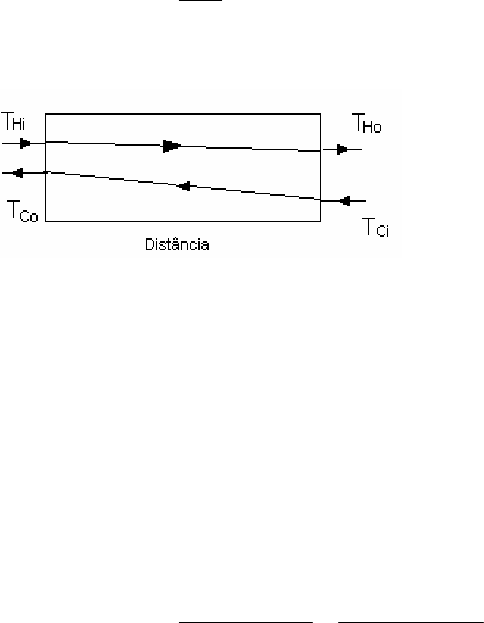MÉTODO DE ANÁLISE DA EFETIVIDADE - NTU O método de calculo de trocadores de calor que utiliza a media logarítmica de temperaturas (LMDT) usualmente é utilizado quando os fluidos são conhecidos; as temperaturas são especificadas ou quando podem ser facilmente determinadas pelo Balanço de Energia. Entretanto, em inúmeras situações, o uso do método LMTD requer um procedimento iterativo. Nestas situações, o uso de uma alternativa, chamada de método da efetividade - NTU é desejável. Para definirmos a efetividade de um trocador de calor, devemos primeiro procurar definir a máxima taxa de troca de calor para o trocador em estudo, chamada de qmax. Naturalmente, o calor trocado, máximo ou o efetivo, é igual, pela primeira lei da Termodinâmica, à variação de entalpia de qualquer um dos fluidos de trabalho (com a devida consideração de sinal). Para líquidos, geralmente a variação de energia cinética mas para gases, tal variação pode ser significante, especialmente para grandes vazões e/ou grandes variações de temperatura. Podemos definir então a efetividade como sendo a razão entre a troca de calor efetivamente conseguida pela máxima troca de calor possível, em igualdades de condições. Isto é: maxq q =ε O perfil de temperatura para um trocador contracorrente é mostrado na Figura 1 Figura 1: Perfil de temperatura de um trocador contracorrente. A equação de balanço de energia para o fluido frio ( C) e para o fluido quente (H) pode ser escrita como: )()()()( CiCoCpHoHiHp TTmcTTmcq −=−= considerando (mcp)H= CH e (mcp)C=CC e que a variação de temperatura do fluido frio é maior; logo CH>CC. Desta forma temos que CC pode ser considerado Cmin ou a capacidade calorífica mínima. Caso dispomos de uma área infinita para transferência temos que TCo=THi. A efetividade então é: )( )( )( )( min max CiHi HoHi CiHiC HoHiH TTC TTC TTC TTC − − = − − =ε a partir da equação que relaciona a troca de calor com o coeficiente global temos: )]/()ln[(( )()( CoHiCiHo CoHiCiHo lm TTTT TTTTUATUAq −− −−− =∆= como consideramos que Cmin é a capacidade térmica do fluido frio, temos: )( CiCoc TTCq −= a partir do rearranjo das equações podemos deduzir a expressão de efetividade para o trocador analisado como sendo: −−− −−− = max min minmax min max min min 1exp1 1exp1 C C C UA C C C C C UA ε onde o NTU é definido como: minC UANTU = logo a efetividade de troca térmica é função do NTU, da relação entre as capacidades caloríficas dos fluidos e do tipo de trocador. As relações da efetividade de trocadores de calor são apresentadas na literatura na forma de gráficos para uma variedade de configurações de trocadores de calor. A figura abaixo mostra a relação para o trocador contracorrente analisado.