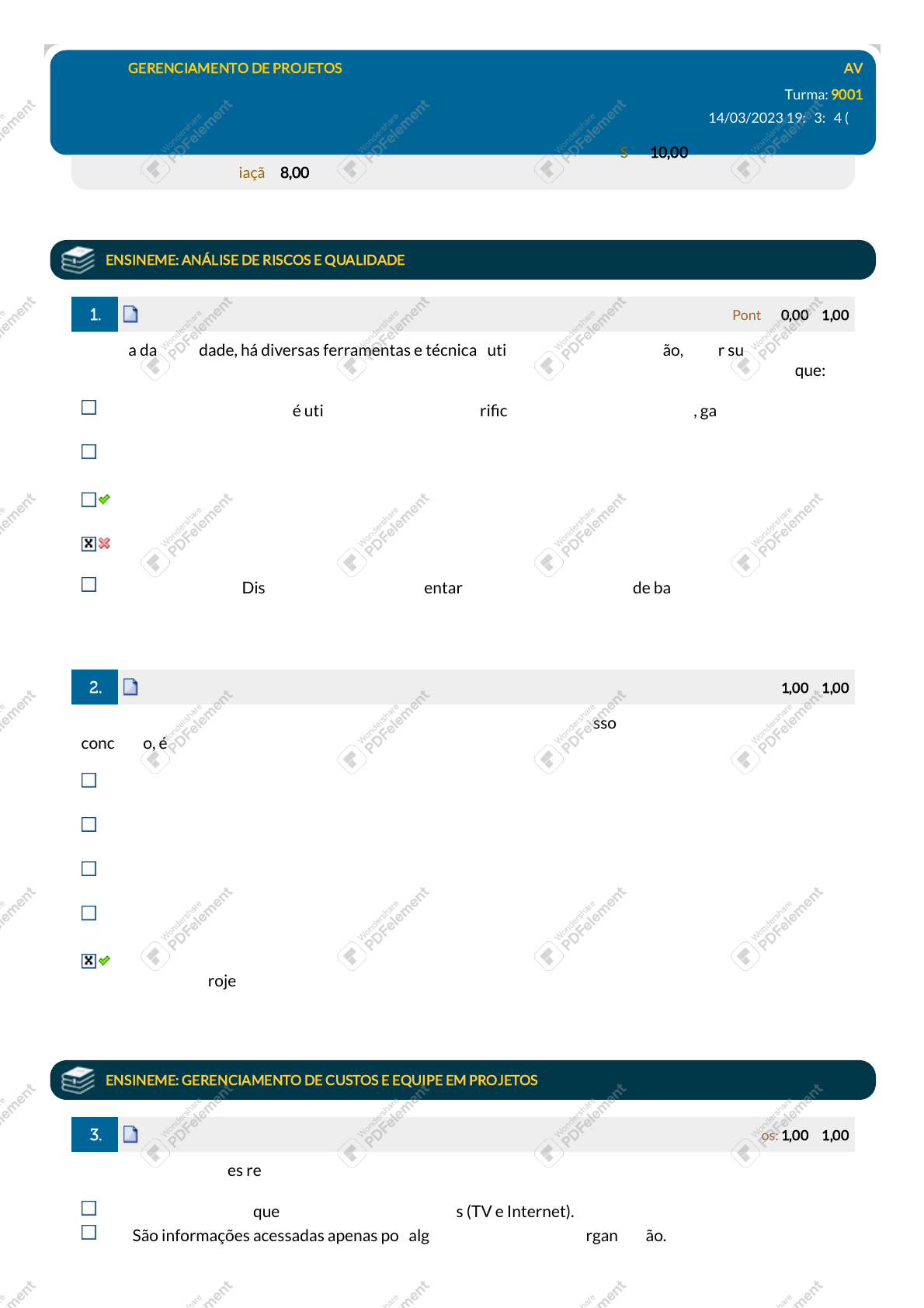 Disciplina: GERENCIAMENTO DE PROJETOS AV Turma: 9001 14/03/2023 19:33:04 (F) Avaliação: 8,00 pts Nota SIA: 10,00 pts ENSINEME: ANÁLISE DE RISCOS E QUALIDADE 1. Ref.: 3990494 Pontos: 0,00 / 1,00 Na área da Qualidade, há diversas ferramentas e técnicas utilizadas para comparação, gerar sugestões, investigar causas de problemas e outras aplicações. Com base no que foi apresentado, é correto dizer que: A Folha de Veri�cação é utilizada para apoiar a veri�cação de modo estruturado, garantindo assim que nada foi esquecido. Por meio do Diagrama de Pareto consigo identi�car as causas raízes pois decomponho em causas primárias, secundárias e terciárias. O Diagrama de Causa e Efeito, também conhecido como Diagrama de Espinha de Peixe, objetiva determinar as causas reais de um efeito a partir da análise das causas de diversas categorias. O Diagrama 5W1H que utiliza uma planilha onde devemos responder: O que? / Por que? / Quem / Onde / Quando e Como é utilizado para identi�car as causas raízes dos problemas. O Diagrama de Dispersão objetiva representar, por meio de um grá�co de barras, como uma amostra está distribuída. 2. Ref.: 3990496 Pontos: 1,00 / 1,00 Quando falamos da Qualidade em Projetos, que já sabemos ser um processo que se estende até a conclusão, é correto dizer que: O Processo da Qualidade deve ser iniciado logo após a assinatura do Contrato, pois somente a partir deste evento será con�gurada uma relação formal entre as partes. Uma vez que o desdobramento do escopo nos entregáveis é sempre de responsabilidade total do Cliente, não há motivo para uma con�rmação por deste. Premissas são hipóteses que podem ser não veri�cadas na prática, por isto deve haver uma Contingência a ser usada caso não se mostrem como verdadeiras. Cada Pacote de trabalho deve conter as estimativas de custo e prazo, ao passo que outros requisitos, tais como os da Qualidade já estão detalhados no Contrato. Restrições são limitadores, podendo ser associadas, entre outros, à Qualidade, aos Custos ou ao Prazo do Projeto. ENSINEME: GERENCIAMENTO DE CUSTOS E EQUIPE EM PROJETOS 3. Ref.: 3991059 Pontos: 1,00 / 1,00 O que são informações restritas? São informações que são divulgadas nas mídias (TV e Internet). São informações acessadas apenas por alguns fornecedores da organização. 03/11/2024, 22:02 EPS https://simulado.estacio.br/alunos/ 1/4 javascript:alert('C%C3%B3digo da quest%C3%A3o: 3990494.'); javascript:alert('C%C3%B3digo da quest%C3%A3o: 3990494.'); javascript:alert('C%C3%B3digo da quest%C3%A3o: 3990496.'); javascript:alert('C%C3%B3digo da quest%C3%A3o: 3990496.'); javascript:alert('C%C3%B3digo da quest%C3%A3o: 3991059.'); javascript:alert('C%C3%B3digo da quest%C3%A3o: 3991059.'); São informações que somente podem ser acessadas dentro da organização. São informações que não precisam ser protegidas. São informações que são destinadas a um grupo especí�co dentro da organização. 4. Ref.: 3991061 Pontos: 1,00 / 1,00 Seu projeto sofreu um aumento de escopo e que foi autorizado e documentado, contudo o Plano de Gerenciamento do Projeto teve que ser atualizado. Para quais pessoas esse novo plano deverá ser enviado? O plano de gerenciamento do projeto atualizado não deve ser enviado a ninguém. A equipe do projeto que é responsável pela execução do projeto. A todas as pessoas indicadas no Plano de Gerenciamento das Comunicações A todos as partes envolvidas no projeto. Aos executivos da empresa que autorizaram o aumento do escopo. ENSINEME: ORGANIZANDO O PROJETO NO TEMPO 5. Ref.: 3990913 Pontos: 1,00 / 1,00 Seu projeto tem uma atividade que consiste em colocar os móveis em um novo escritório. Esta atividade depende da pintura das paredes e desse modo a colocação dos móveis é uma atividade sucessora à pintura das paredes, no diagrama de rede do projeto. Ocorre, porém, que os móveis somente poderão ser colocados depois que a tinta das paredes esteja completamente seca, o que ocorrerá três dias após o término da atividade de pintura das paredes. Que modi�cação no relacionamento lógico está ocorrendo neste caso? Folga Atraso, visando retardar a atividade sucessora Flutuação Antecipação ou avanço, visando adiantar a atividade predecessora Gold plating 6. Ref.: 3990904 Pontos: 1,00 / 1,00 O projeto é um empreendimento que faz parte, consciente ou inconscientemente, do dia a dia de qualquer organização. A visão da empresa in�uenciará sensivelmente no sucesso do projeto. Acerca desse tema, assinale a alternativa correta. É temporário, pois é dividido em começo, meio e �m, com datas que determinam sua duração. Para que haja a execução de um bom projeto, é necessário que ele nunca seja inédito, ou seja, quanto mais mudanças ocorrerem, mais desa�adora se tornará a gestão do projeto. Poderá começar sem um objetivo especí�co e, ao longo de seu desenvolvimento, a equipe de�nirá o que se pretende com ele. Não poderá coexistir com nenhum outro projeto, pois perderá o foco nas execuções e consequentemente sua e�cácia. Uma característica interessante sobre projeto é que ele não possui restrição de recursos, o que aumenta a qualidade de sua execução. 03/11/2024, 22:02 EPS https://simulado.estacio.br/alunos/ 2/4 javascript:alert('C%C3%B3digo da quest%C3%A3o: 3991061.'); javascript:alert('C%C3%B3digo da quest%C3%A3o: 3991061.'); javascript:alert('C%C3%B3digo da quest%C3%A3o: 3990913.'); javascript:alert('C%C3%B3digo da quest%C3%A3o: 3990913.'); javascript:alert('C%C3%B3digo da quest%C3%A3o: 3990904.'); javascript:alert('C%C3%B3digo da quest%C3%A3o: 3990904.'); ENSINEME: PROJETO ÁGIL 7. Ref.: 3990983 Pontos: 0,00 / 1,00 Selecione a sentença que não representa um valor do manifesto ágil. Em detrimento de muita documentação entregue software funcionando. Priorize a relação com seu cliente ao invés de recorrer constantemente ao contrato. O processo não é mai