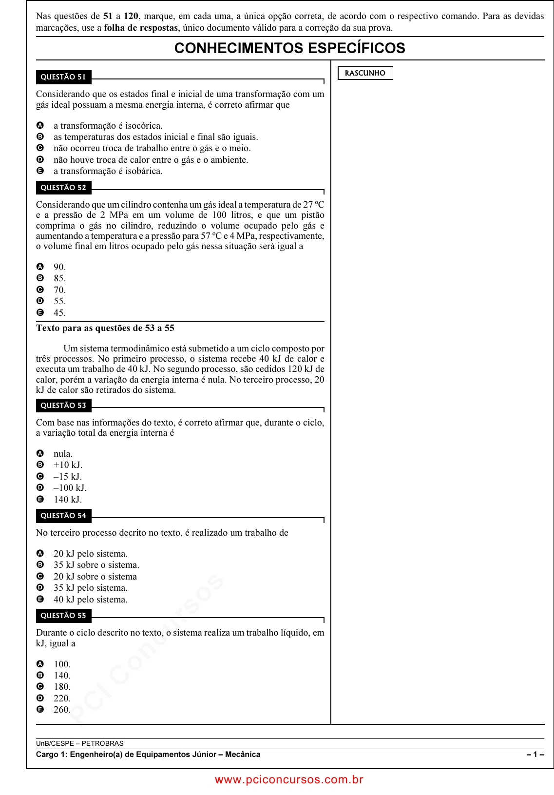 pcimarkpci MjgwNDoyOWI4OjUwOWM6MGUxODowOTA0OmEyMjc6YWQ0ODo3YWQw:VGh1LCAyOSBKdW4gMjAyMyAxNDoxODowOCAtMDMwMA== www.pciconcursos.com.br UnB/CESPE – PETROBRAS Cargo 1: Engenheiro(a) de Equipamentos Júnior – Mecânica – 1 – Nas questões de 51 a 120, marque, em cada uma, a única opção correta, de acordo com o respectivo comando. Para as devidas marcações, use a folha de respostas, único documento válido para a correção da sua prova. CONHECIMENTOS ESPECÍFICOS �������� Considerando que os estados final e inicial de uma transformação com um gás ideal possuam a mesma energia interna, é correto afirmar que A a transformação é isocórica. B as temperaturas dos estados inicial e final são iguais. C não ocorreu troca de trabalho entre o gás e o meio. D não houve troca de calor entre o gás e o ambiente. E a transformação é isobárica. �������� � Considerando que um cilindro contenha um gás ideal a temperatura de 27 ºC e a pressão de 2 MPa em um volume de 100 litros, e que um pistão comprima o gás no cilindro, reduzindo o volume ocupado pelo gás e aumentando a temperatura e a pressão para 57 ºC e 4 MPa, respectivamente, o volume final em litros ocupado pelo gás nessa situação será igual a A 90. B 85. C 70. D 55. E 45. Texto para as questões de 53 a 55 Um sistema termodinâmico está submetido a um ciclo composto por três processos. No primeiro processo, o sistema recebe 40 kJ de calor e executa um trabalho de 40 kJ. No segundo processo, são cedidos 120 kJ de calor, porém a variação da energia interna é nula. No terceiro processo, 20 kJ de calor são retirados do sistema. �������� � Com base nas informações do texto, é correto afirmar que, durante o ciclo, a variação total da energia interna é A nula. B +10 kJ. C –15 kJ. D –100 kJ. E 140 kJ. �������� No terceiro processo decrito no texto, é realizado um trabalho de A 20 kJ pelo sistema. B 35 kJ sobre o sistema. C 20 kJ sobre o sistema D 35 kJ pelo sistema. E 40 kJ pelo sistema. �������� Durante o ciclo descrito no texto, o sistema realiza um trabalho líquido, em kJ, igual a A 100. B 140. C 180. D 220. E 260. �������� www.pciconcursos.com.br www.pciconcursos.com.br pcimarkpci MjgwNDoyOWI4OjUwOWM6MGUxODowOTA0OmEyMjc6YWQ0ODo3YWQw:VGh1LCAyOSBKdW4gMjAyMyAxNDoxODowOCAtMDMwMA== www.pciconcursos.com.br UnB/CESPE – PETROBRAS Cargo 1: Engenheiro(a) de Equipamentos Júnior – Mecânica – 2 – Texto para as questões 56 e 57 Três máquinas térmicas recebem 600 kJ de calor por ciclo de uma fonte quente a 307 ºC e rejeitam, por ciclo, determinadas quantidades de calor para uma fonte fria a 7 ºC. A máquina A rejeita 450 kJ, a máquina B, 300 kJ, e a C, 120 kJ. �������� � Considerando que as máquinas em questão sejam máquinas de Carnot, é correto afirmar que a máxima eficiência teórica alcançada é A maior na máquina A. B maior na máquina B. C maior na máquina C. D igual nas máquinas B e C, porém maior do que na máquina A. E igual nas três máquinas. �������� � Com relação aos ciclos termodinâmicos das máquinas mencionadas no texto, assinale a opção correta. A Os ciclos das máquinas A e B são impossíveis. B Os ciclos das máquinas A e C são reversíveis. C Somente o ciclo da máquina C é impossível. D O ciclo da máquina B é irreversível. E O ciclo da máquina A é reversível. �������� � Em um sistema termodinâmico formado pelo fluido de trabalho de um motor térmico que opera segundo o ciclo de Carnot sujeito a um processo adiabático reversível, a entropia desse sistema A diminui. B aumenta. C depende da variação de temperatura. D depende da quantidade de calor fornecida. E permanece constante. �������� � Considerando que uma bomba de calor necessita de 7 kW da rede para funcionar e aquecer 10 L de água a uma taxa de 0,5 o C/s e assumindo que o calor específico da água é 4.200 J/kg.K, o coeficiente de performance dessa bomba é A 2. B 3. C 3,5. D 4. E 4,5. ���������� Um óleo com densidade de 800 kg/m 3 e viscosidade cinemática de 1,5 × 10 !4 m 2 /s possui viscosidade absoluta, em kg/mAs, igual a A 0,089. B 0,10. C 0,12. D 0,15. E 0,18. �������� www.pciconcursos.com.br www.pciconcursos.com.br pcimarkpci MjgwNDoyOWI4OjUwOWM6MGUxODowOTA0OmEyMjc6YWQ0ODo3YWQw:VGh1LCAyOSBKdW4gMjAyMyAxNDoxODowOCAtMDMwMA== www.pciconcursos.com.br UnB/CESPE – PETROBRAS Cargo 1: Engenheiro(a) de Equipamentos Júnior – Mecânica – 3 – ��������� O casco de um navio deve flutuar de forma estável. Isso depende das posições relativas do metacentro, M, do centro de gravidade, G, e do centro de flutuação, F. Entre as configurações esquematizadas acima, as que atendem a condição de estabilidade na flutuação de um navio são as configurações A I e II. B I e III. C II e IV. D III e IV. E IV e V. ���������� Um manômetro diferencial de mercúrio (D = 13.600 kg/m 3 ), como o esquematizado na figura ao lado, foi conectado a uma tubulação por onde flui ar para a medição da pressão interna. Considerando que a pressão atmosférica local é de 100 kPa e que a diferença de nível de mercúrio observada é de 25 mm e adotando g = 10 m/s 2 , a pressão absoluta na tubulação, em kPa, é igual a A 101. B 102,3. C 103,4. D 104,5. E 105. ���������� Considerando um escoamento permanente e incompressível, cuja distribuição de velocidades seja dada pela função , em que C é uma constante e sejam vetores unitários ortogonais, o valor da constante C necessário para atender ao princípio da conservação de massa será igual a A !2. B !3. C . D !5. E 6. ��������� Dados os parâmetros velocidade, V, comprimento, L, aceleração da gravidade, g, densidade, D, e viscosidade absoluta, :, que afeta